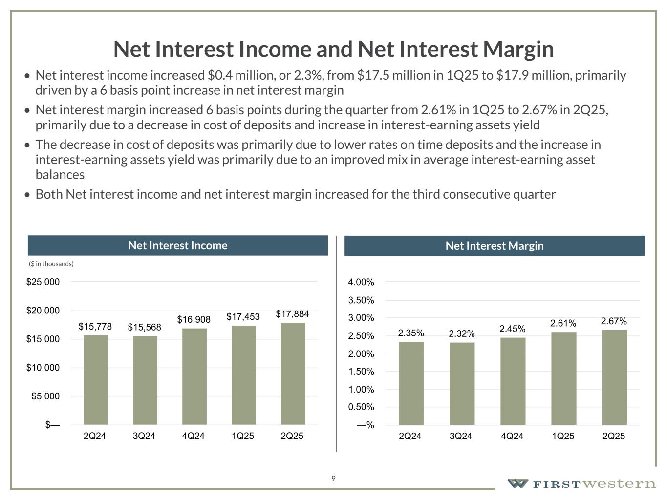 •Net interest income increased $0.4 million from $17.5 million in Q1 2025 to $17.9 million in Q2 2025