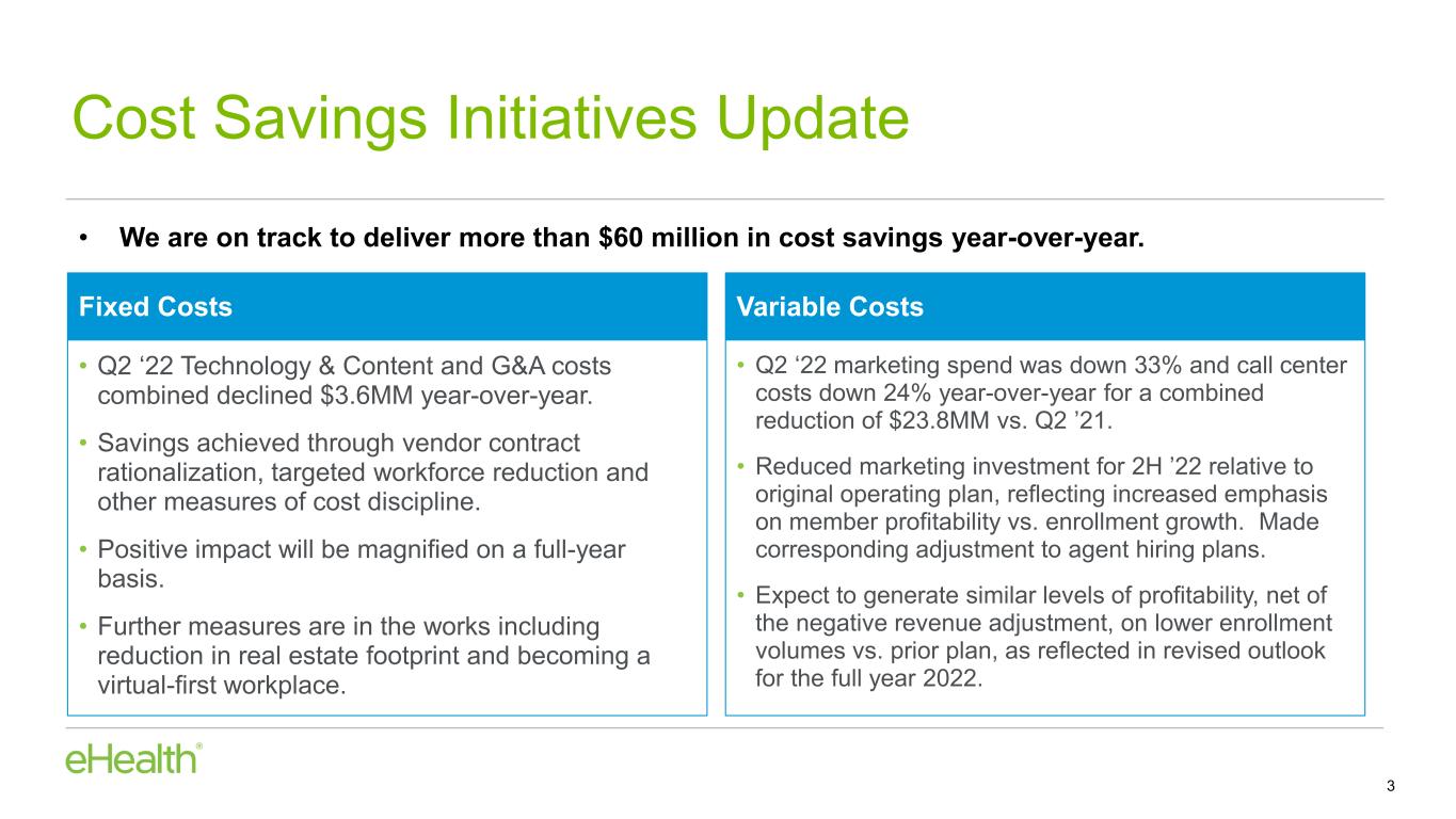 •Significant cost reductions achieved across the entire business including $23.8 million year-over-year reduction in combined Marketing & Advertising and Customer Care & Enrollment costs. We are on track to deliver more than $60 million in total cost reduction in 2022 compared to 2021.