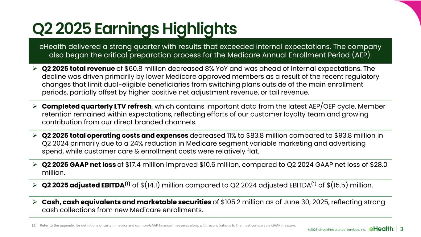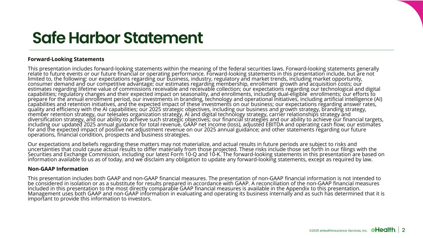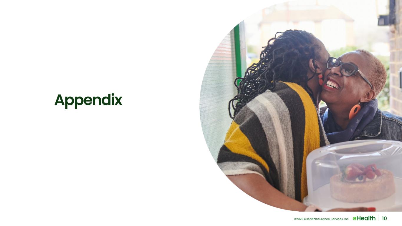本日2025年8月6日(水)東部時間午前8時30分/中部時間午前7時30分より、ウェブキャストおよび電話会議を開催いたします。電話会議をお聞きになりたい方は、(800) 549-8228までお電話ください。参加者のパスコードは61513。電話会議のライブ中継およびアーカイブは、当社ウェブサイトの投資家向け情報ページ(https://ir.ehealthinsurance.com)の「イベント&プレゼンテーション」でもご覧いただけます。