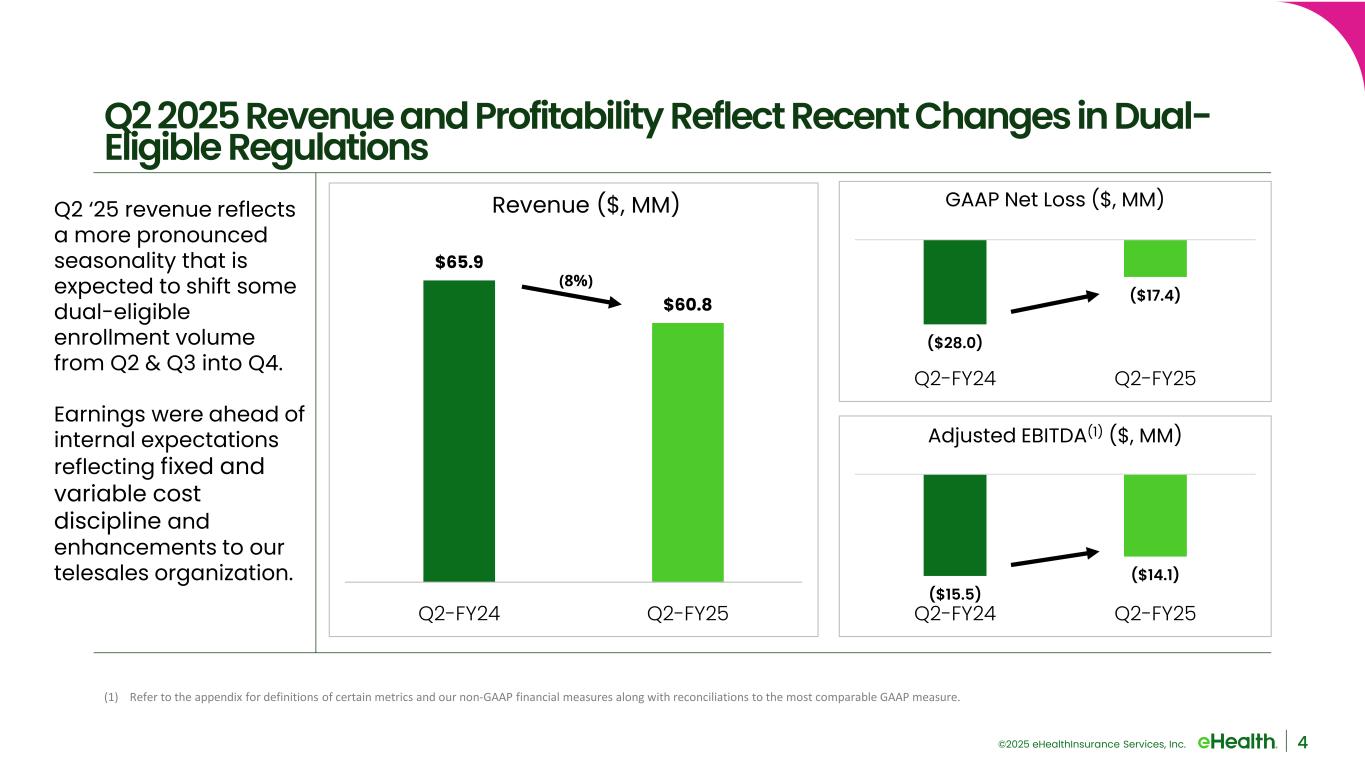 テキサス州オースティン-2025年8月6日-大手民間オンライン医療保険マーケットプレイスであるeヘルス社(Nasdaq: EHTH)は本日、2025年6月30日で終了した第2四半期の業績を発表した。