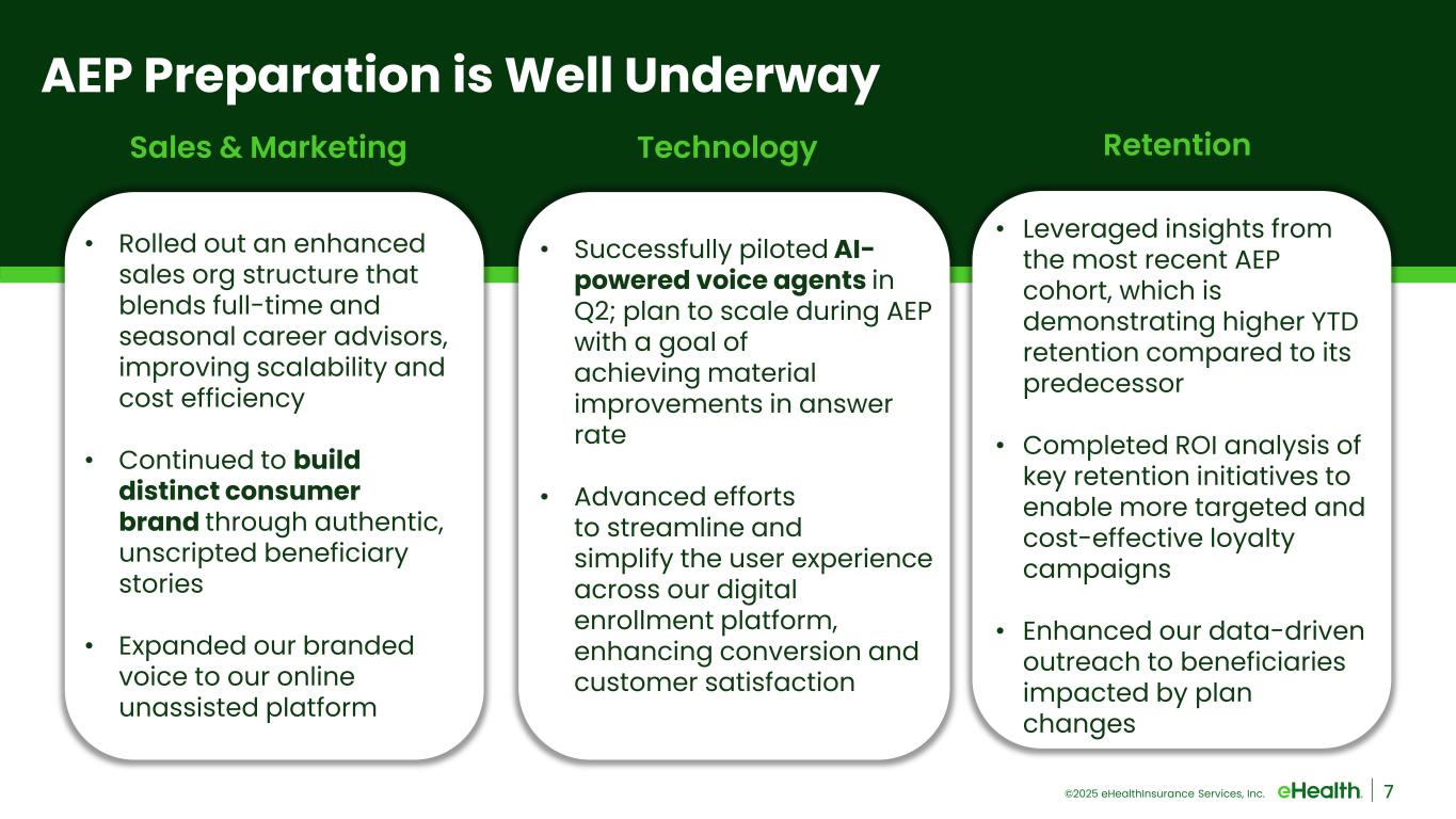 | "eHealthは力強い第2四半期を達成し、収益と利益率の予想を再び上回り、進化するマクロと規制の状況に適応する能力を実証しました。累計の業績に基づいて、2025年の年間ガイダンスの範囲を更新しています。当四半期、当社は1年で最も重要な販売シーズンであるメディケア年次登録期間(AEP)の準備を開始しました。最近の業界動向を鑑みると、AEPは消費者の購買活動が活発化するダイナミックなシーズンになると予想されます。この環境は、eHealthが信頼されるメディケア・アドバイザーとしてさらに差別化を図り、受益者が高品質で手頃な医療への継続的なアクセスを維持できるようにする、有意義な機会を提供すると信じています。私たちの幅広いプランの選択、業界をリードするオムニチャネル・ショッピングと登録プラットフォーム、そして明確な消費者ブランドにより、私たちはまたAEPを成功させるために十分な態勢を整えています。"- フラン・ソイストマン最高経営責任者 |
