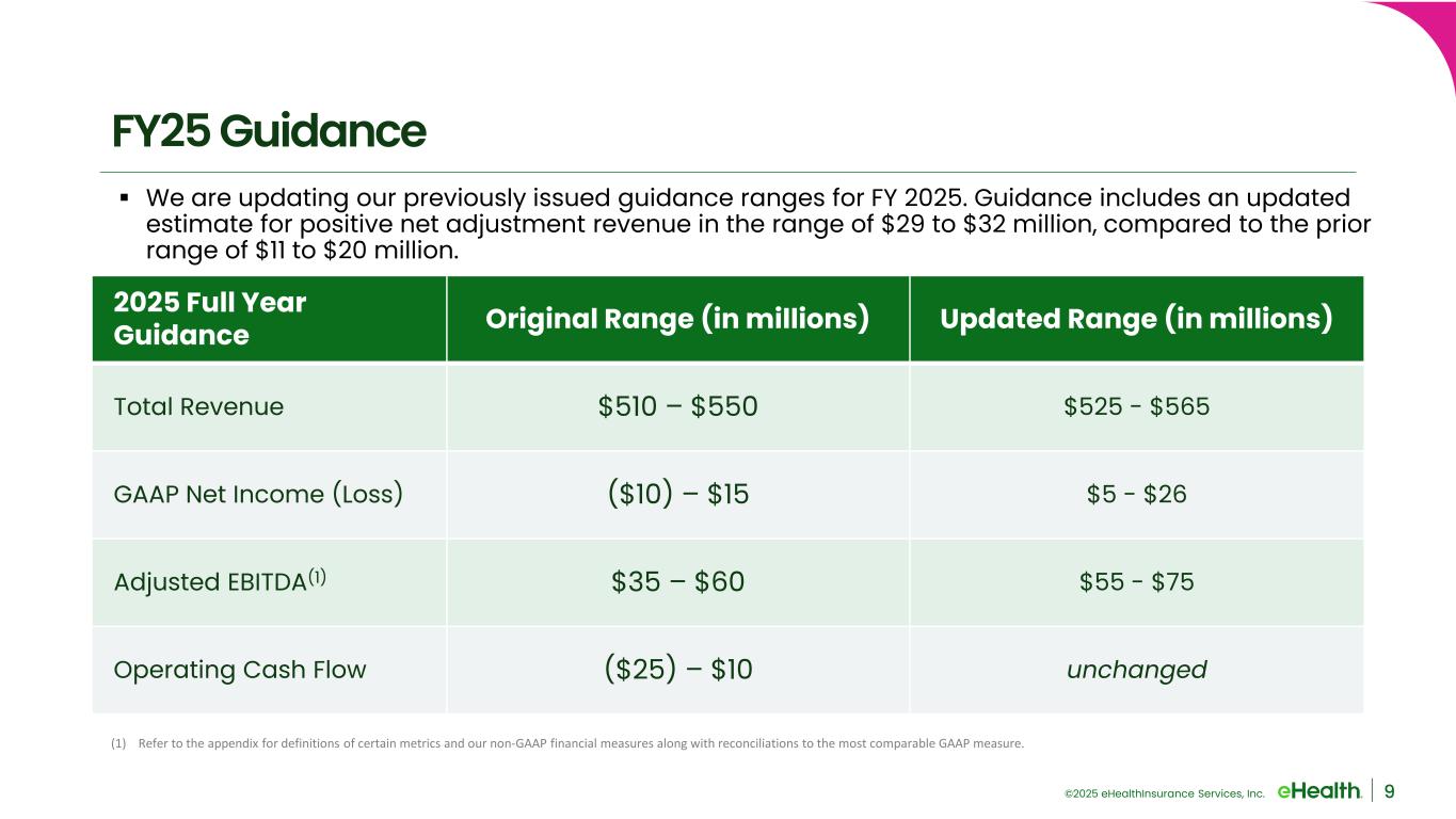 2025年8月6日時点で入手可能な情報に基づき、2025年12月31日に終了する通年のガイダンスを修正します。これらの予想は将来の見通しに関する記述であり、当社はこれらの記述を更新する義務を負いません。実際の結果は大きく異なる可能性があり、本プレスリリースおよび証券取引委員会に提出されたeHealthの年次報告書および四半期報告書で特定されたリスク要因および不確実性の影響を受けます。