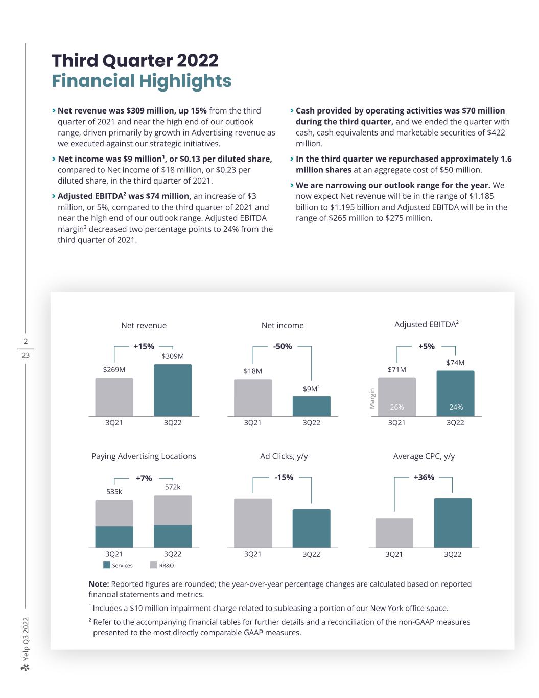 Ye lp Q 3 20 22 2 23 Note: Reported figures are rounded; the year-over-year percentage changes are calculated based on reported financial statements and metrics. 1 Includes a $10 million impairment charge related to subleasing a portion of our New York office space. ² Refer to the accompanying financial tables for further details and a reconciliation of the non-GAAP measures presented to the most directly comparable GAAP measures. Third Quarter 2022 Financial Highlights > Net revenue was $309 million, up 15% from the third quarter of 2021 and near the high end of our outlook range, driven primarily by growth in Advertising revenue as we executed against our strategic initiatives. > Net income was $9 million¹, or $0.13 per diluted share, compared to Net income of $18 million, or $0.23 per diluted share, in the third quarter of 2021. > Adjusted EBITDA² was $74 million, an increase of $3 million, or 5%, compared to the third quarter of 2021 and near the high end of our outlook range. Adjusted EBITDA margin² decreased two percentage points to 24% from the third quarter of 2021. > Cash provided by operating activities was $70 million during the third quarter, and we ended the quarter with cash, cash equivalents and marketable securities of $422 million. > In the third quarter we repurchased approximately 1.6 million shares at an aggregate cost of $50 million. > We are narrowing our outlook range for the year. We now expect Net revenue will be in the range of $1.185 billion to $1.195 billion and Adjusted EBITDA will be in the range of $265 million to $275 million. 19% 17% Net revenue +15% $269M $309M 3Q21 3Q22 Ad Clicks, y/y -15% 3Q21 3Q22 Average CPC, y/y +36% 3Q21 3Q22 Paying Advertising Locations +7% 535k 572k 3Q21 3Q22 Services RR&O Adjusted EBITDA² +5% $71M $74M 3Q21 3Q22 M ar gi n 26% 24% Net income -50% $18M $9M¹ 3Q21 3Q22