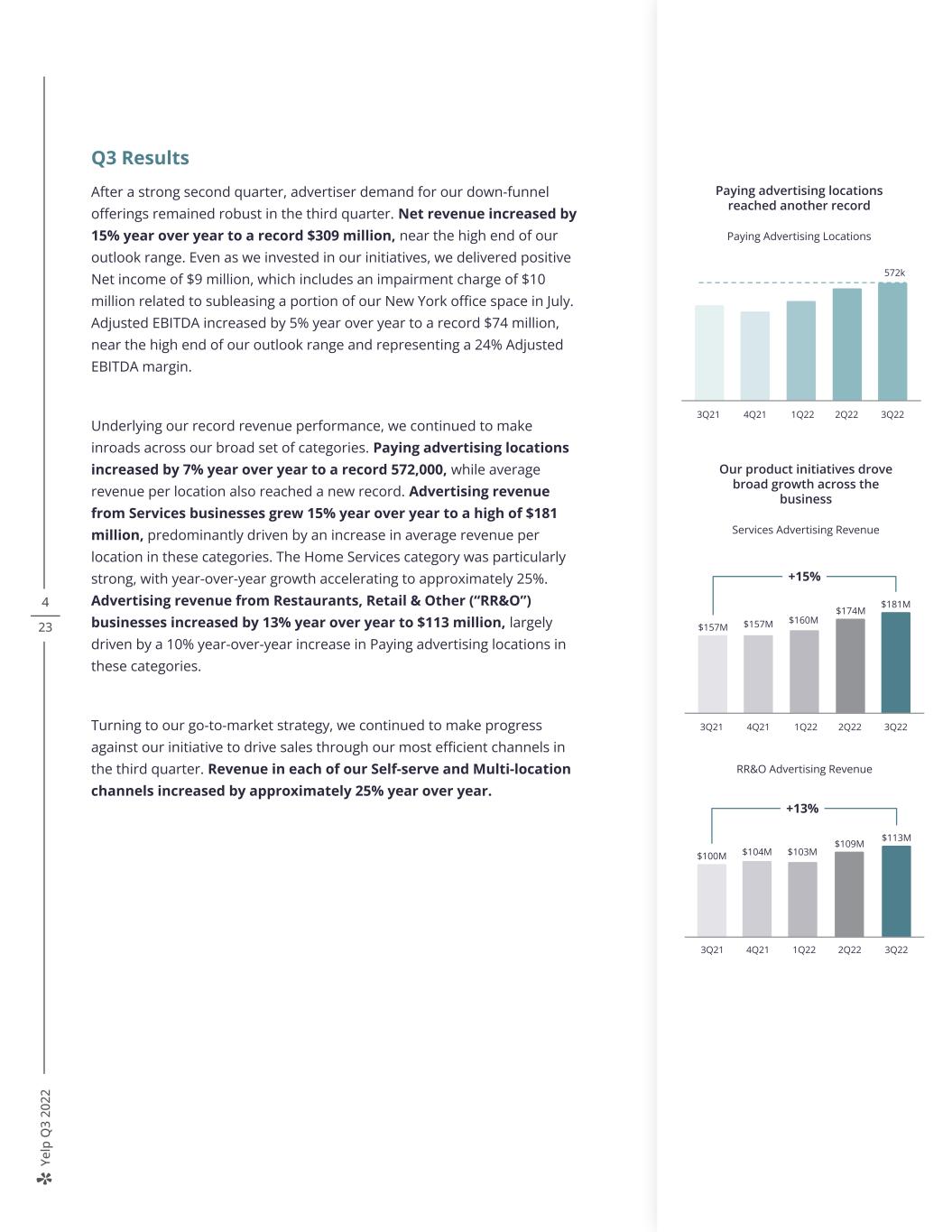 Ye lp Q 3 20 22 4 23 Q3 Results After a strong second quarter, advertiser demand for our down-funnel offerings remained robust in the third quarter. Net revenue increased by 15% year over year to a record $309 million, near the high end of our outlook range. Even as we invested in our initiatives, we delivered positive Net income of $9 million, which includes an impairment charge of $10 million related to subleasing a portion of our New York office space in July. Adjusted EBITDA increased by 5% year over year to a record $74 million, near the high end of our outlook range and representing a 24% Adjusted EBITDA margin. Underlying our record revenue performance, we continued to make inroads across our broad set of categories. Paying advertising locations increased by 7% year over year to a record 572,000, while average revenue per location also reached a new record. Advertising revenue from Services businesses grew 15% year over year to a high of $181 million, predominantly driven by an increase in average revenue per location in these categories. The Home Services category was particularly strong, with year-over-year growth accelerating to approximately 25%. Advertising revenue from Restaurants, Retail & Other (“RR&O”) businesses increased by 13% year over year to $113 million, largely driven by a 10% year-over-year increase in Paying advertising locations in these categories. Turning to our go-to-market strategy, we continued to make progress against our initiative to drive sales through our most efficient channels in the third quarter. Revenue in each of our Self-serve and Multi-location channels increased by approximately 25% year over year. Our product initiatives drove broad growth across the business Services Advertising Revenue +15% $157M 3Q21 4Q21 1Q22 2Q22 3Q22 $160M $174M $181M $157M 2Q221Q224Q213Q21 +13% $100M 3Q22 $113M $104M $103M $109M RR&O Advertising Revenue Paying advertising locations reached another record Paying Advertising Locations 3Q21 4Q21 1Q22 2Q22 3Q22 572k
