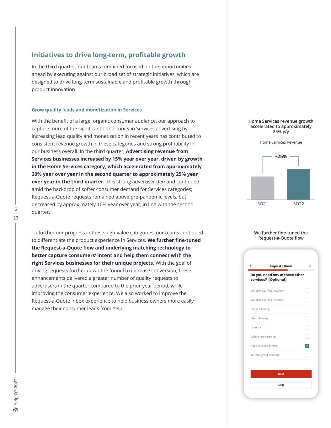 Ye lp Q 3 20 22 5 23 Initiatives to drive long-term, profitable growth In the third quarter, our teams remained focused on the opportunities ahead by executing against our broad set of strategic initiatives, which are designed to drive long-term sustainable and profitable growth through product innovation. Grow quality leads and monetization in Services With the benefit of a large, organic consumer audience, our approach to capture more of the significant opportunity in Services advertising by increasing lead quality and monetization in recent years has contributed to consistent revenue growth in these categories and strong profitability in our business overall. In the third quarter, Advertising revenue from Services businesses increased by 15% year over year, driven by growth in the Home Services category, which accelerated from approximately 20% year over year in the second quarter to approximately 25% year over year in the third quarter. This strong advertiser demand continued amid the backdrop of softer consumer demand for Services categories; Request-a-Quote requests remained above pre-pandemic levels, but decreased by approximately 10% year over year, in line with the second quarter. To further our progress in these high-value categories, our teams continued to differentiate the product experience in Services. We further fine-tuned the Request-a-Quote flow and underlying matching technology to better capture consumers’ intent and help them connect with the right Services businesses for their unique projects. With the goal of driving requests further down the funnel to increase conversion, these enhancements delivered a greater number of quality requests to advertisers in the quarter compared to the prior-year period, while improving the consumer experience. We also worked to improve the Request-a-Quote inbox experience to help business owners more easily manage their consumer leads from Yelp. We further fine-tuned the Request-a-Quote flow ~25% 3Q21 3Q22 Home Services revenue growth accelerated to approximately 25% y/y Home Services Revenue
