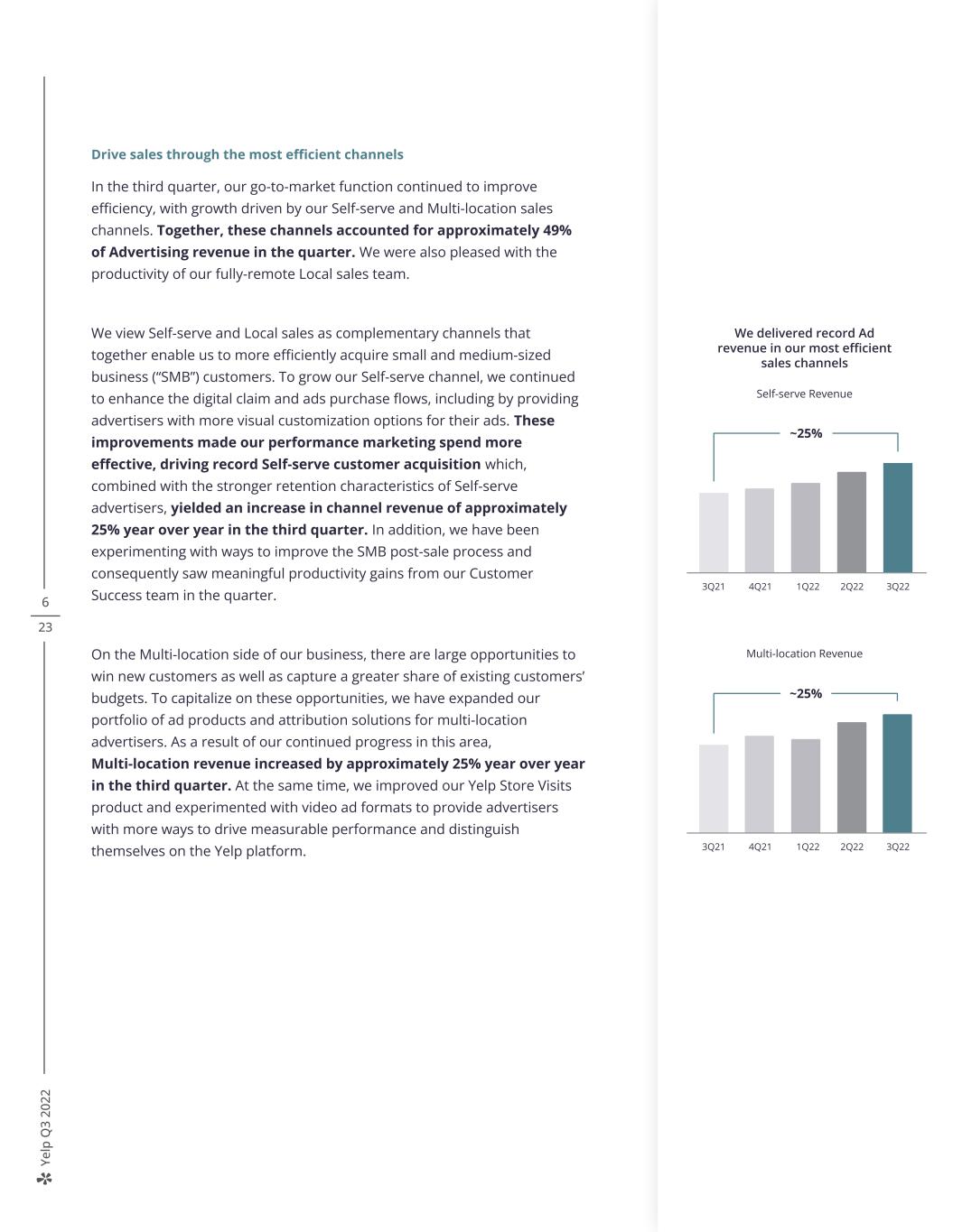 Ye lp Q 3 20 22 6 23 Drive sales through the most efficient channels In the third quarter, our go-to-market function continued to improve efficiency, with growth driven by our Self-serve and Multi-location sales channels. Together, these channels accounted for approximately 49% of Advertising revenue in the quarter. We were also pleased with the productivity of our fully-remote Local sales team. We view Self-serve and Local sales as complementary channels that together enable us to more efficiently acquire small and medium-sized business (“SMB”) customers. To grow our Self-serve channel, we continued to enhance the digital claim and ads purchase flows, including by providing advertisers with more visual customization options for their ads. These improvements made our performance marketing spend more effective, driving record Self-serve customer acquisition which, combined with the stronger retention characteristics of Self-serve advertisers, yielded an increase in channel revenue of approximately 25% year over year in the third quarter. In addition, we have been experimenting with ways to improve the SMB post-sale process and consequently saw meaningful productivity gains from our Customer Success team in the quarter. On the Multi-location side of our business, there are large opportunities to win new customers as well as capture a greater share of existing customers’ budgets. To capitalize on these opportunities, we have expanded our portfolio of ad products and attribution solutions for multi-location advertisers. As a result of our continued progress in this area, Multi-location revenue increased by approximately 25% year over year in the third quarter. At the same time, we improved our Yelp Store Visits product and experimented with video ad formats to provide advertisers with more ways to drive measurable performance and distinguish themselves on the Yelp platform. We delivered record Ad revenue in our most efficient sales channels Self-serve Revenue ~25% 3Q21 4Q21 1Q22 2Q22 3Q22 Multi-location Revenue ~25% 3Q21 4Q21 1Q22 2Q22 3Q22