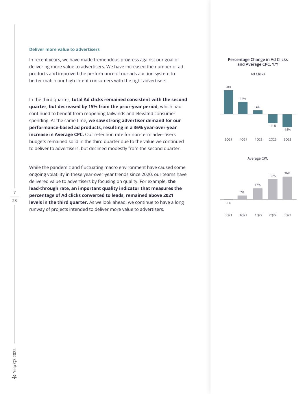 Ye lp Q 3 20 22 7 23 Deliver more value to advertisers In recent years, we have made tremendous progress against our goal of delivering more value to advertisers. We have increased the number of ad products and improved the performance of our ads auction system to better match our high-intent consumers with the right advertisers. In the third quarter, total Ad clicks remained consistent with the second quarter, but decreased by 15% from the prior-year period, which had continued to benefit from reopening tailwinds and elevated consumer spending. At the same time, we saw strong advertiser demand for our performance-based ad products, resulting in a 36% year-over-year increase in Average CPC. Our retention rate for non-term advertisers’ budgets remained solid in the third quarter due to the value we continued to deliver to advertisers, but declined modestly from the second quarter. While the pandemic and fluctuating macro environment have caused some ongoing volatility in these year-over-year trends since 2020, our teams have delivered value to advertisers by focusing on quality. For example, the lead-through rate, an important quality indicator that measures the percentage of Ad clicks converted to leads, remained above 2021 levels in the third quarter. As we look ahead, we continue to have a long runway of projects intended to deliver more value to advertisers. Percentage Change in Ad Clicks and Average CPC, Y/Y Ad Clicks 28% 3Q21 4Q21 1Q22 2Q22 3Q22 -15% 14% 4% -11% Average CPC -1% 3Q21 4Q21 1Q22 2Q22 3Q22 32% 7% 36% 17%