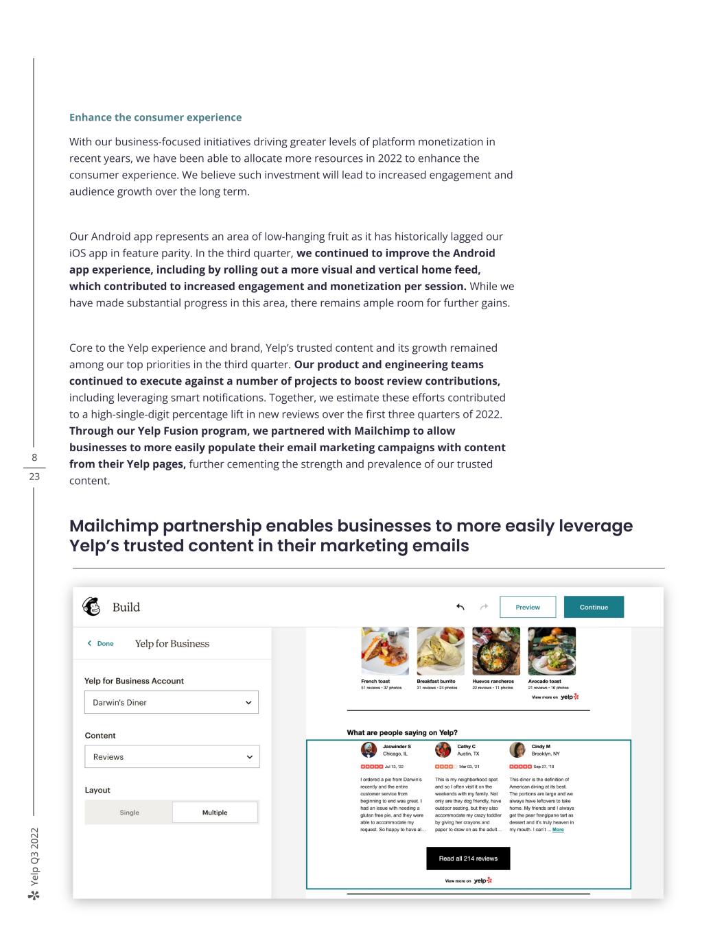 Ye lp Q 3 20 22 Enhance the consumer experience With our business-focused initiatives driving greater levels of platform monetization in recent years, we have been able to allocate more resources in 2022 to enhance the consumer experience. We believe such investment will lead to increased engagement and audience growth over the long term. Our Android app represents an area of low-hanging fruit as it has historically lagged our iOS app in feature parity. In the third quarter, we continued to improve the Android app experience, including by rolling out a more visual and vertical home feed, which contributed to increased engagement and monetization per session. While we have made substantial progress in this area, there remains ample room for further gains. Core to the Yelp experience and brand, Yelp’s trusted content and its growth remained among our top priorities in the third quarter. Our product and engineering teams continued to execute against a number of projects to boost review contributions, including leveraging smart notifications. Together, we estimate these efforts contributed to a high-single-digit percentage lift in new reviews over the first three quarters of 2022. Through our Yelp Fusion program, we partnered with Mailchimp to allow businesses to more easily populate their email marketing campaigns with content from their Yelp pages, further cementing the strength and prevalence of our trusted content. 8 23 Mailchimp partnership enables businesses to more easily leverage Yelp’s trusted content in their marketing emails