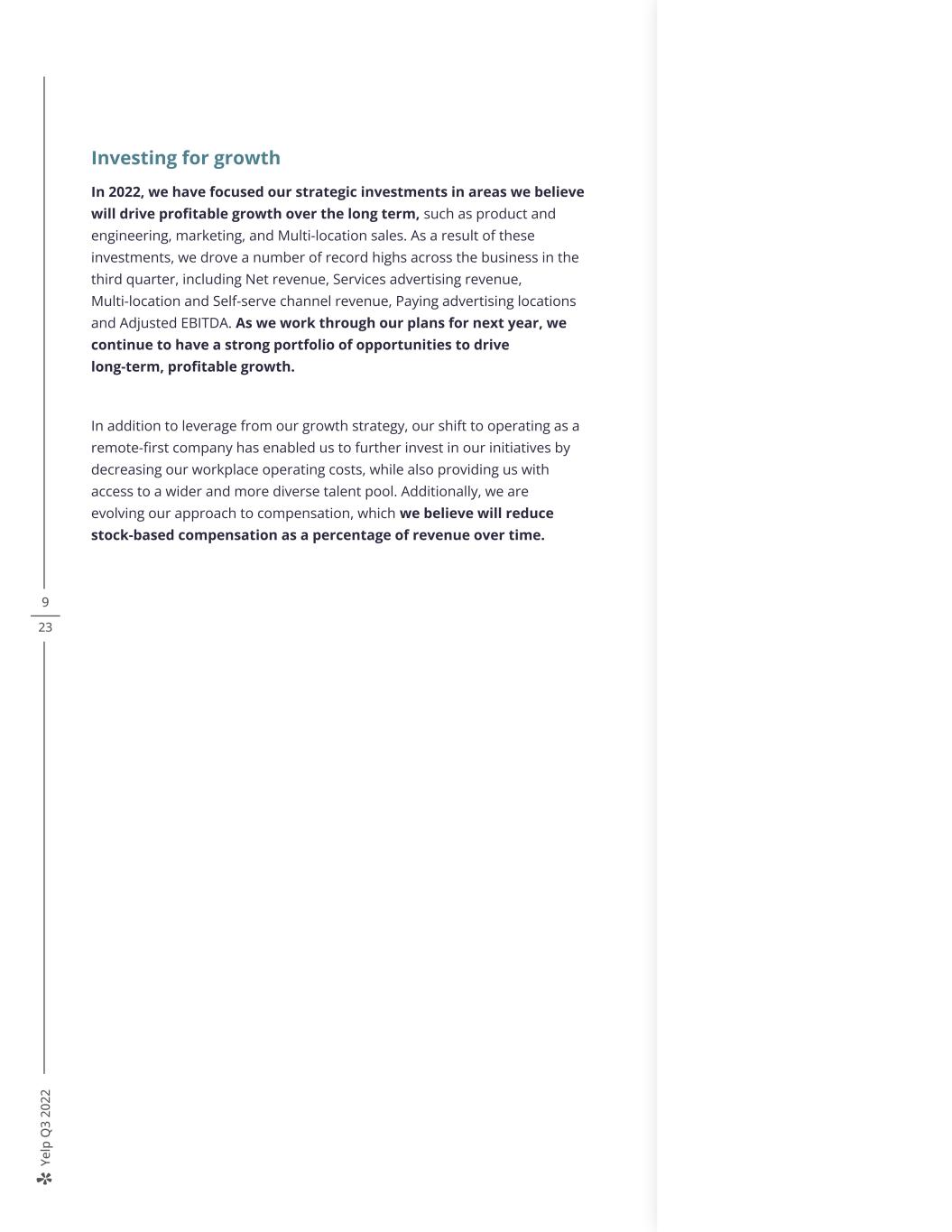 Ye lp Q 3 20 22 9 23 Investing for growth In 2022, we have focused our strategic investments in areas we believe will drive profitable growth over the long term, such as product and engineering, marketing, and Multi-location sales. As a result of these investments, we drove a number of record highs across the business in the third quarter, including Net revenue, Services advertising revenue, Multi-location and Self-serve channel revenue, Paying advertising locations and Adjusted EBITDA. As we work through our plans for next year, we continue to have a strong portfolio of opportunities to drive long-term, profitable growth. In addition to leverage from our growth strategy, our shift to operating as a remote-first company has enabled us to further invest in our initiatives by decreasing our workplace operating costs, while also providing us with access to a wider and more diverse talent pool. Additionally, we are evolving our approach to compensation, which we believe will reduce stock-based compensation as a percentage of revenue over time.
