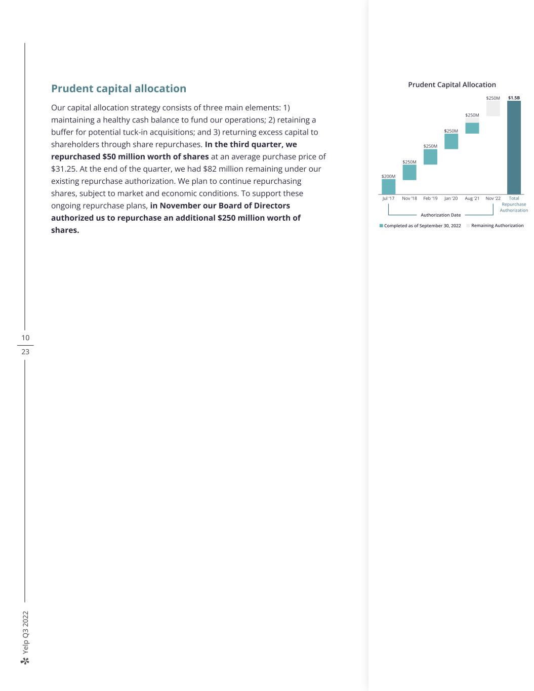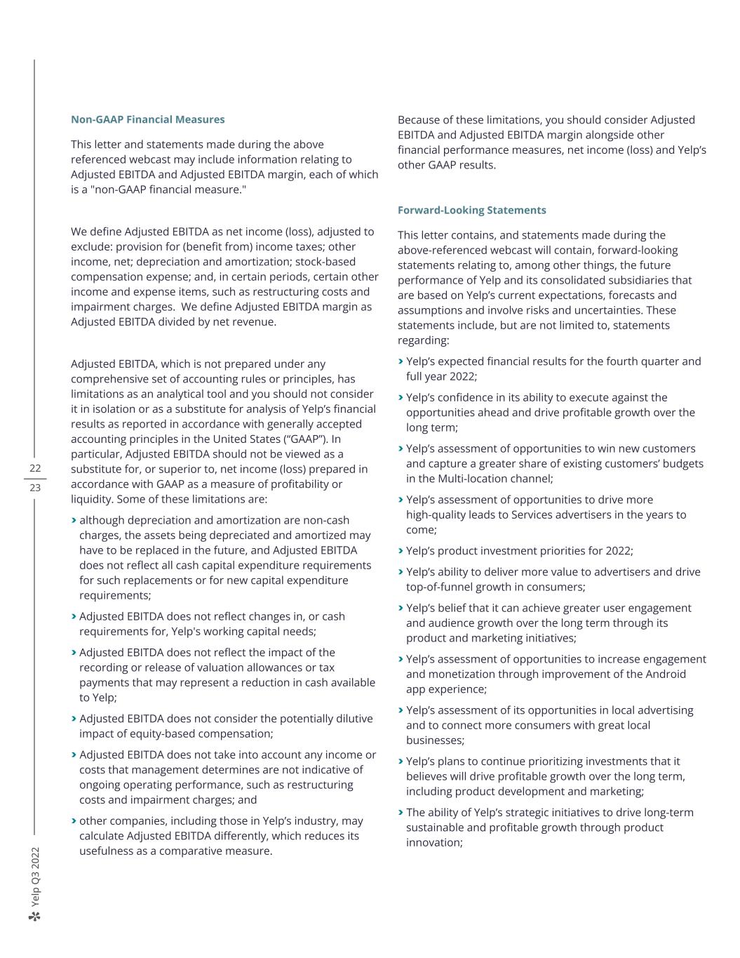 Ye lp Q 3 20 22 Non-GAAP Financial Measures This letter and statements made during the above referenced webcast may include information relating to Adjusted EBITDA and Adjusted EBITDA margin, each of which is a "non-GAAP financial measure." We define Adjusted EBITDA as net income (loss), adjusted to exclude: provision for (benefit from) income taxes; other income, net; depreciation and amortization; stock-based compensation expense; and, in certain periods, certain other income and expense items, such as restructuring costs and impairment charges. We define Adjusted EBITDA margin as Adjusted EBITDA divided by net revenue. Adjusted EBITDA, which is not prepared under any comprehensive set of accounting rules or principles, has limitations as an analytical tool and you should not consider it in isolation or as a substitute for analysis of Yelp’s financial results as reported in accordance with generally accepted accounting principles in the United States (“GAAP”). In particular, Adjusted EBITDA should not be viewed as a substitute for, or superior to, net income (loss) prepared in accordance with GAAP as a measure of profitability or liquidity. Some of these limitations are: > although depreciation and amortization are non-cash charges, the assets being depreciated and amortized may have to be replaced in the future, and Adjusted EBITDA does not reflect all cash capital expenditure requirements for such replacements or for new capital expenditure requirements; > Adjusted EBITDA does not reflect changes in, or cash requirements for, Yelp's working capital needs; > Adjusted EBITDA does not reflect the impact of the recording or release of valuation allowances or tax payments that may represent a reduction in cash available to Yelp; > Adjusted EBITDA does not consider the potentially dilutive impact of equity-based compensation; > Adjusted EBITDA does not take into account any income or costs that management determines are not indicative of ongoing operating performance, such as restructuring costs and impairment charges; and > other companies, including those in Yelp’s industry, may calculate Adjusted EBITDA differently, which reduces its usefulness as a comparative measure. Because of these limitations, you should consider Adjusted EBITDA and Adjusted EBITDA margin alongside other financial performance measures, net income (loss) and Yelp’s other GAAP results. Forward-Looking Statements This letter contains, and statements made during the above-referenced webcast will contain, forward-looking statements relating to, among other things, the future performance of Yelp and its consolidated subsidiaries that are based on Yelp’s current expectations, forecasts and assumptions and involve risks and uncertainties. These statements include, but are not limited to, statements regarding: > Yelp’s expected financial results for the fourth quarter and full year 2022; > Yelp’s confidence in its ability to execute against the opportunities ahead and drive profitable growth over the long term; > Yelp’s assessment of opportunities to win new customers and capture a greater share of existing customers’ budgets in the Multi-location channel; > Yelp’s assessment of opportunities to drive more high-quality leads to Services advertisers in the years to come; > Yelp’s product investment priorities for 2022; > Yelp’s ability to deliver more value to advertisers and drive top-of-funnel growth in consumers; > Yelp’s belief that it can achieve greater user engagement and audience growth over the long term through its product and marketing initiatives; > Yelp’s assessment of opportunities to increase engagement and monetization through improvement of the Android app experience; > Yelp’s assessment of its opportunities in local advertising and to connect more consumers with great local businesses; > Yelp’s plans to continue prioritizing investments that it believes will drive profitable growth over the long term, including product development and marketing; > The ability of Yelp’s strategic initiatives to drive long-term sustainable and profitable growth through product innovation; 22 23