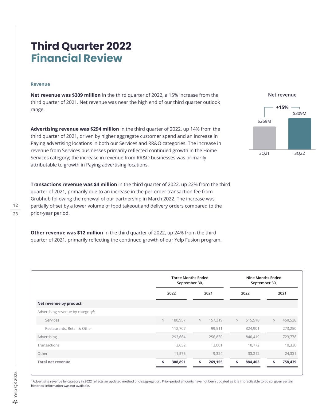 Ye lp Q 3 20 22 12 23 Revenue Net revenue was $309 million in the third quarter of 2022, a 15% increase from the third quarter of 2021. Net revenue was near the high end of our third quarter outlook range. Advertising revenue was $294 million in the third quarter of 2022, up 14% from the third quarter of 2021, driven by higher aggregate customer spend and an increase in Paying advertising locations in both our Services and RR&O categories. The increase in revenue from Services businesses primarily reflected continued growth in the Home Services category; the increase in revenue from RR&O businesses was primarily attributable to growth in Paying advertising locations. Transactions revenue was $4 million in the third quarter of 2022, up 22% from the third quarter of 2021, primarily due to an increase in the per-order transaction fee from Grubhub following the renewal of our partnership in March 2022. The increase was partially offset by a lower volume of food takeout and delivery orders compared to the prior-year period. Other revenue was $12 million in the third quarter of 2022, up 24% from the third quarter of 2021, primarily reflecting the continued growth of our Yelp Fusion program. Third Quarter 2022 Financial Review 1 Advertising revenue by category in 2022 reflects an updated method of disaggregation. Prior-period amounts have not been updated as it is impracticable to do so, given certain historical information was not available. Three Months Ended September 30, Nine Months Ended September 30, 2022 2021 2022 2021 Net revenue by product: Advertising revenue by category¹: Services $ 180,957 $ 157,319 $ 515,518 $ 450,528 Restaurants, Retail & Other 112,707 99,511 324,901 273,250 Advertising 293,664 256,830 840,419 723,778 Transactions 3,652 3,001 10,772 10,330 Other 11,575 9,324 33,212 24,331 Total net revenue $ 308,891 $ 269,155 $ 884,403 $ 758,439 Net revenue +15% $269M $309M 3Q21 3Q22