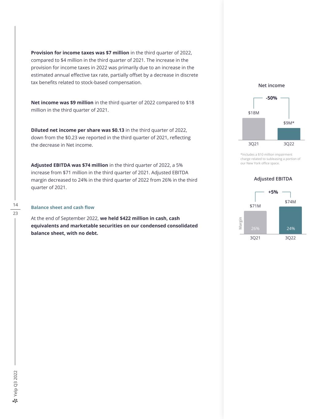 Ye lp Q 3 20 22 14 23 Provision for income taxes was $7 million in the third quarter of 2022, compared to $4 million in the third quarter of 2021. The increase in the provision for income taxes in 2022 was primarily due to an increase in the estimated annual effective tax rate, partially offset by a decrease in discrete tax benefits related to stock-based compensation. Net income was $9 million in the third quarter of 2022 compared to $18 million in the third quarter of 2021. Diluted net income per share was $0.13 in the third quarter of 2022, down from the $0.23 we reported in the third quarter of 2021, reflecting the decrease in Net income. Adjusted EBITDA was $74 million in the third quarter of 2022, a 5% increase from $71 million in the third quarter of 2021. Adjusted EBITDA margin decreased to 24% in the third quarter of 2022 from 26% in the third quarter of 2021. Balance sheet and cash flow At the end of September 2022, we held $422 million in cash, cash equivalents and marketable securities on our condensed consolidated balance sheet, with no debt. Net income -50% $18M $9M* 3Q21 3Q22 Adjusted EBITDA +5% $71M $74M 3Q21 3Q22 M ar gi n 26% 24% *Includes a $10 million impairment charge related to subleasing a portion of our New York office space.
