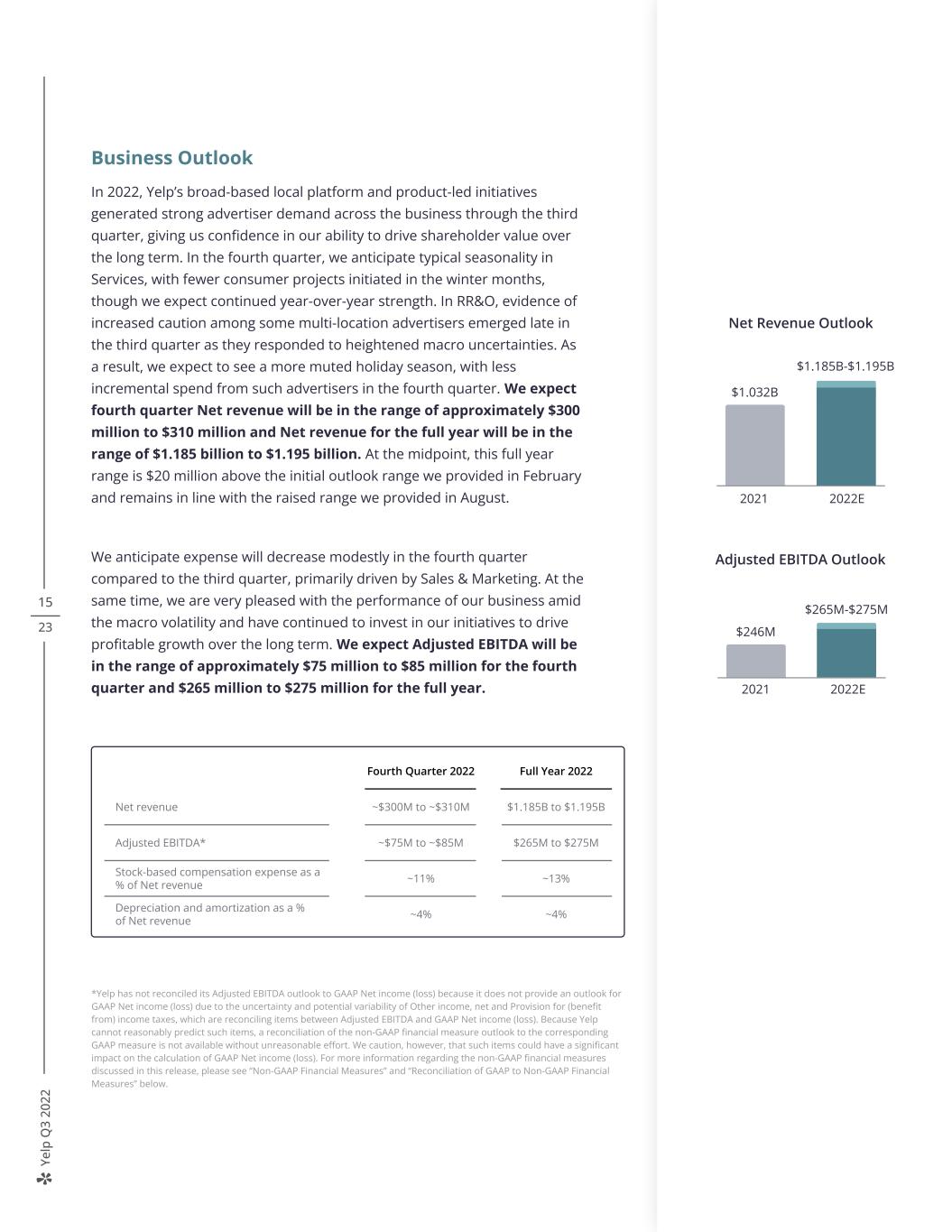Ye lp Q 3 20 22 15 23 Business Outlook In 2022, Yelp’s broad-based local platform and product-led initiatives generated strong advertiser demand across the business through the third quarter, giving us confidence in our ability to drive shareholder value over the long term. In the fourth quarter, we anticipate typical seasonality in Services, with fewer consumer projects initiated in the winter months, though we expect continued year-over-year strength. In RR&O, evidence of increased caution among some multi-location advertisers emerged late in the third quarter as they responded to heightened macro uncertainties. As a result, we expect to see a more muted holiday season, with less incremental spend from such advertisers in the fourth quarter. We expect fourth quarter Net revenue will be in the range of approximately $300 million to $310 million and Net revenue for the full year will be in the range of $1.185 billion to $1.195 billion. At the midpoint, this full year range is $20 million above the initial outlook range we provided in February and remains in line with the raised range we provided in August. We anticipate expense will decrease modestly in the fourth quarter compared to the third quarter, primarily driven by Sales & Marketing. At the same time, we are very pleased with the performance of our business amid the macro volatility and have continued to invest in our initiatives to drive profitable growth over the long term. We expect Adjusted EBITDA will be in the range of approximately $75 million to $85 million for the fourth quarter and $265 million to $275 million for the full year. $246M Adjusted EBITDA Outlook 2021 2022E $265M-$275M Fourth Quarter 2022 Full Year 2022 Net revenue ~$300M to ~$310M $1.185B to $1.195B Adjusted EBITDA* ~$75M to ~$85M $265M to $275M Stock-based compensation expense as a % of Net revenue ~11% ~13% Depreciation and amortization as a % of Net revenue ~4% ~4% *Yelp has not reconciled its Adjusted EBITDA outlook to GAAP Net income (loss) because it does not provide an outlook for GAAP Net income (loss) due to the uncertainty and potential variability of Other income, net and Provision for (benefit from) income taxes, which are reconciling items between Adjusted EBITDA and GAAP Net income (loss). Because Yelp cannot reasonably predict such items, a reconciliation of the non-GAAP financial measure outlook to the corresponding GAAP measure is not available without unreasonable effort. We caution, however, that such items could have a significant impact on the calculation of GAAP Net income (loss). For more information regarding the non-GAAP financial measures discussed in this release, please see “Non-GAAP Financial Measures” and “Reconciliation of GAAP to Non-GAAP Financial Measures” below. Net Revenue Outlook 2021 2022E $1.032B $1.185B-$1.195B
