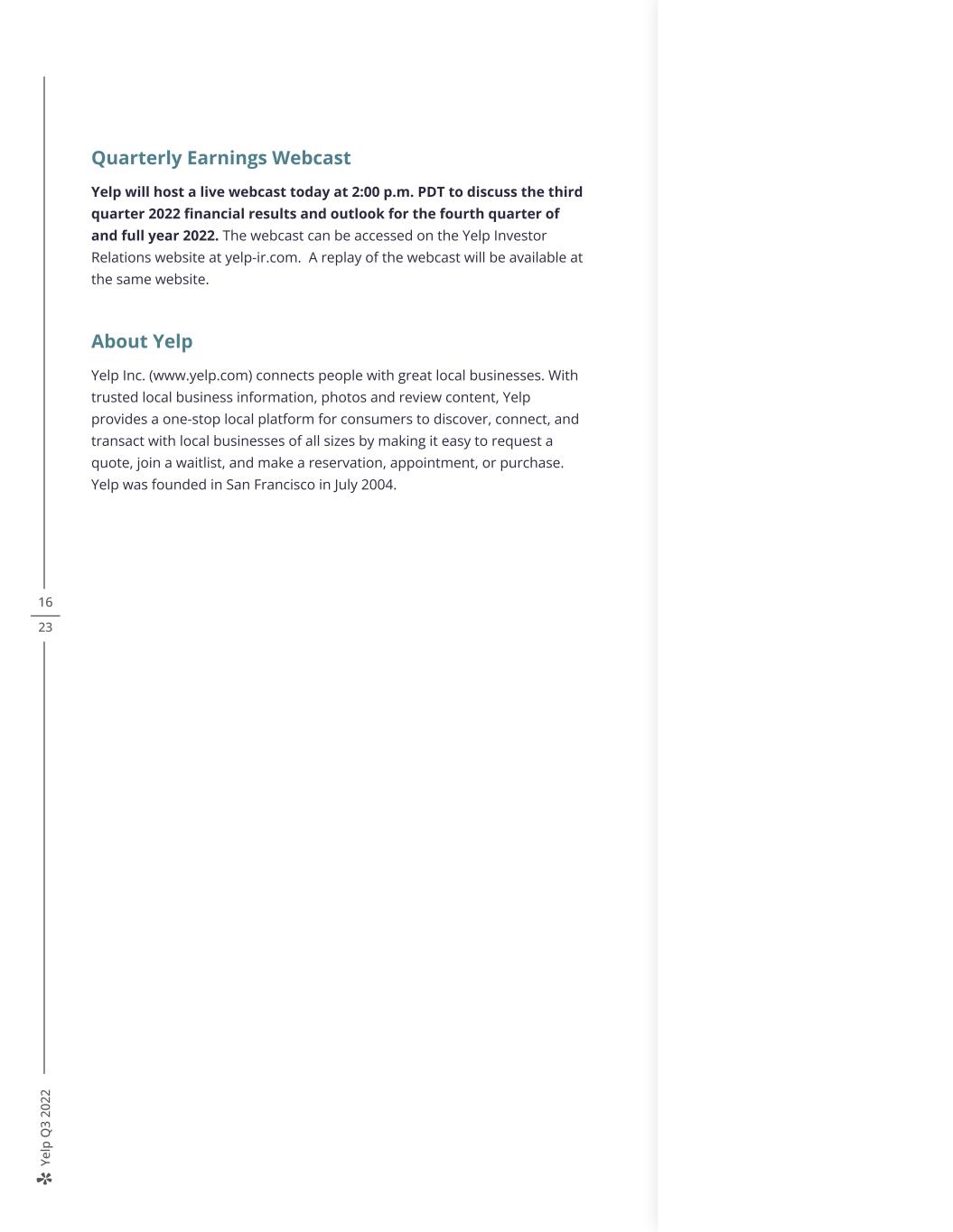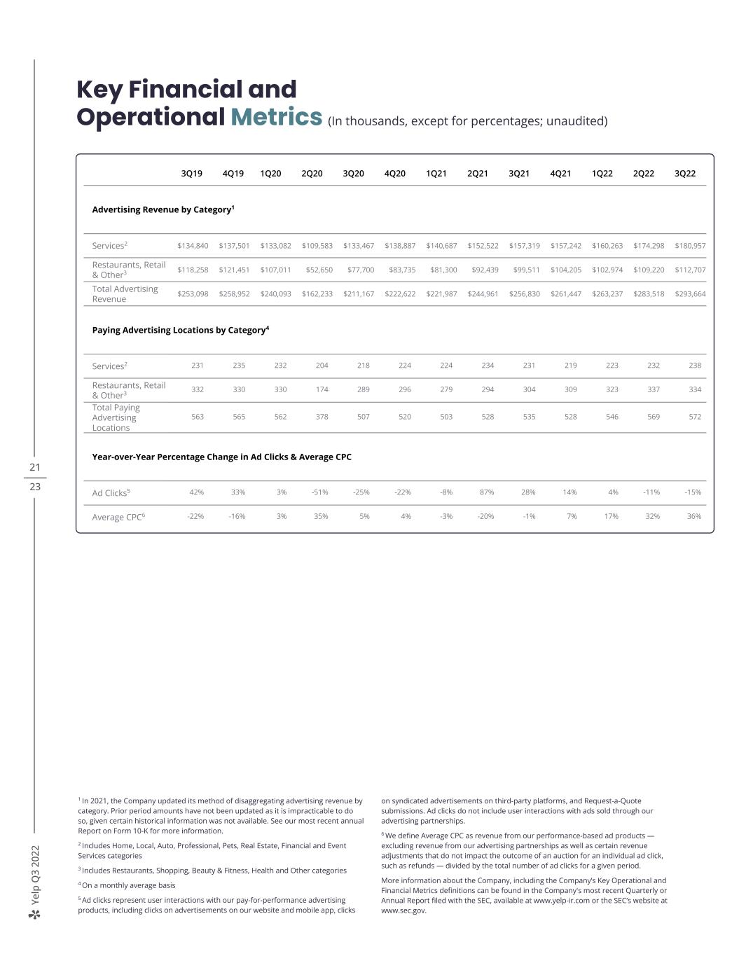 Ye lp Q 3 20 22 21 23 Key Financial and Operational Metrics (In thousands, except for percentages; unaudited) 3Q19 4Q19 1Q20 2Q20 3Q20 4Q20 1Q21 2Q21 3Q21 4Q21 1Q22 2Q22 3Q22 Advertising Revenue by Category1 Services2 $134,840 $137,501 $133,082 $109,583 $133,467 $138,887 $140,687 $152,522 $157,319 $157,242 $160,263 $174,298 $180,957 Restaurants, Retail & Other3 $118,258 $121,451 $107,011 $52,650 $77,700 $83,735 $81,300 $92,439 $99,511 $104,205 $102,974 $109,220 $112,707 Total Advertising Revenue $253,098 $258,952 $240,093 $162,233 $211,167 $222,622 $221,987 $244,961 $256,830 $261,447 $263,237 $283,518 $293,664 Paying Advertising Locations by Category4 Services2 231 235 232 204 218 224 224 234 231 219 223 232 238 Restaurants, Retail & Other3 332 330 330 174 289 296 279 294 304 309 323 337 334 Total Paying Advertising Locations 563 565 562 378 507 520 503 528 535 528 546 569 572 Year-over-Year Percentage Change in Ad Clicks & Average CPC Ad Clicks5 42% 33% 3% -51% -25% -22% -8% 87% 28% 14% 4% -11% -15% Average CPC6 -22% -16% 3% 35% 5% 4% -3% -20% -1% 7% 17% 32% 36% 1 In 2021, the Company updated its method of disaggregating advertising revenue by category. Prior period amounts have not been updated as it is impracticable to do so, given certain historical information was not available. See our most recent annual Report on Form 10-K for more information. 2 Includes Home, Local, Auto, Professional, Pets, Real Estate, Financial and Event Services categories 3 Includes Restaurants, Shopping, Beauty & Fitness, Health and Other categories 4 On a monthly average basis 5 Ad clicks represent user interactions with our pay-for-performance advertising products, including clicks on advertisements on our website and mobile app, clicks on syndicated advertisements on third-party platforms, and Request-a-Quote submissions. Ad clicks do not include user interactions with ads sold through our advertising partnerships. 6 We define Average CPC as revenue from our performance-based ad products — excluding revenue from our advertising partnerships as well as certain revenue adjustments that do not impact the outcome of an auction for an individual ad click, such as refunds — divided by the total number of ad clicks for a given period. More information about the Company, including the Company’s Key Operational and Financial Metrics definitions can be found in the Company's most recent Quarterly or Annual Report filed with the SEC, available at www.yelp-ir.com or the SEC’s website at www.sec.gov.