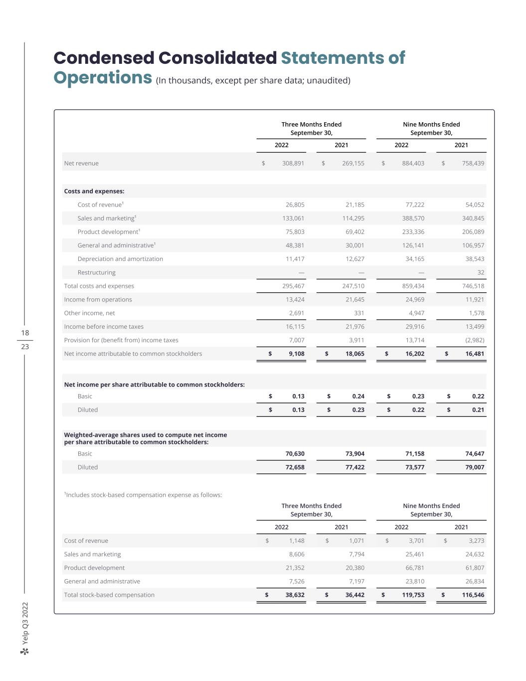Ye lp Q 3 20 22 18 23 Condensed Consolidated Statements of Operations (In thousands, except per share data; unaudited) Three Months Ended September 30, Nine Months Ended September 30, 2022 2021 2022 2021 Net revenue $ 308,891 $ 269,155 $ 884,403 $ 758,439 Costs and expenses: Cost of revenue¹ 26,805 21,185 77,222 54,052 Sales and marketing¹ 133,061 114,295 388,570 340,845 Product development¹ 75,803 69,402 233,336 206,089 General and administrative¹ 48,381 30,001 126,141 106,957 Depreciation and amortization 11,417 12,627 34,165 38,543 Restructuring — — — 32 Total costs and expenses 295,467 247,510 859,434 746,518 Income from operations 13,424 21,645 24,969 11,921 Other income, net 2,691 331 4,947 1,578 Income before income taxes 16,115 21,976 29,916 13,499 Provision for (benefit from) income taxes 7,007 3,911 13,714 (2,982) Net income attributable to common stockholders $ 9,108 $ 18,065 $ 16,202 $ 16,481 Net income per share attributable to common stockholders: Basic $ 0.13 $ 0.24 $ 0.23 $ 0.22 Diluted $ 0.13 $ 0.23 $ 0.22 $ 0.21 Weighted-average shares used to compute net income per share attributable to common stockholders: Basic 70,630 73,904 71,158 74,647 Diluted 72,658 77,422 73,577 79,007 ¹Includes stock-based compensation expense as follows: Three Months Ended September 30, Nine Months Ended September 30, 2022 2021 2022 2021 Cost of revenue $ 1,148 $ 1,071 $ 3,701 $ 3,273 Sales and marketing 8,606 7,794 25,461 24,632 Product development 21,352 20,380 66,781 61,807 General and administrative 7,526 7,197 23,810 26,834 Total stock-based compensation $ 38,632 $ 36,442 $ 119,753 $ 116,546