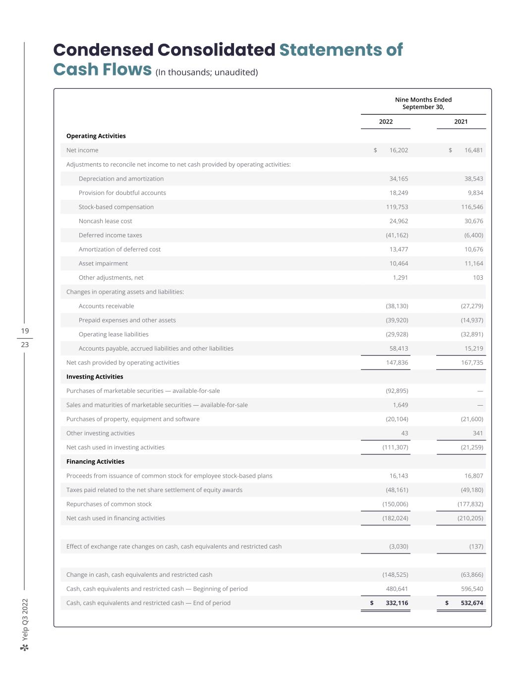 Ye lp Q 3 20 22 19 23 Condensed Consolidated Statements of Cash Flows (In thousands; unaudited) Nine Months Ended September 30, 2022 2021 Operating Activities Net income $ 16,202 $ 16,481 Adjustments to reconcile net income to net cash provided by operating activities: Depreciation and amortization 34,165 38,543 Provision for doubtful accounts 18,249 9,834 Stock-based compensation 119,753 116,546 Noncash lease cost 24,962 30,676 Deferred income taxes (41,162) (6,400) Amortization of deferred cost 13,477 10,676 Asset impairment 10,464 11,164 Other adjustments, net 1,291 103 Changes in operating assets and liabilities: Accounts receivable (38,130) (27,279) Prepaid expenses and other assets (39,920) (14,937) Operating lease liabilities (29,928) (32,891) Accounts payable, accrued liabilities and other liabilities 58,413 15,219 Net cash provided by operating activities 147,836 167,735 Investing Activities Purchases of marketable securities — available-for-sale (92,895) — Sales and maturities of marketable securities — available-for-sale 1,649 — Purchases of property, equipment and software (20,104) (21,600) Other investing activities 43 341 Net cash used in investing activities (111,307) (21,259) Financing Activities Proceeds from issuance of common stock for employee stock-based plans 16,143 16,807 Taxes paid related to the net share settlement of equity awards (48,161) (49,180) Repurchases of common stock (150,006) (177,832) Net cash used in financing activities (182,024) (210,205) Effect of exchange rate changes on cash, cash equivalents and restricted cash (3,030) (137) Change in cash, cash equivalents and restricted cash (148,525) (63,866) Cash, cash equivalents and restricted cash — Beginning of period 480,641 596,540 Cash, cash equivalents and restricted cash — End of period $ 332,116 $ 532,674