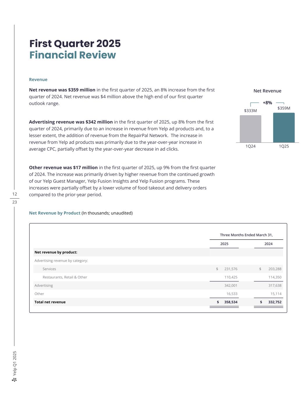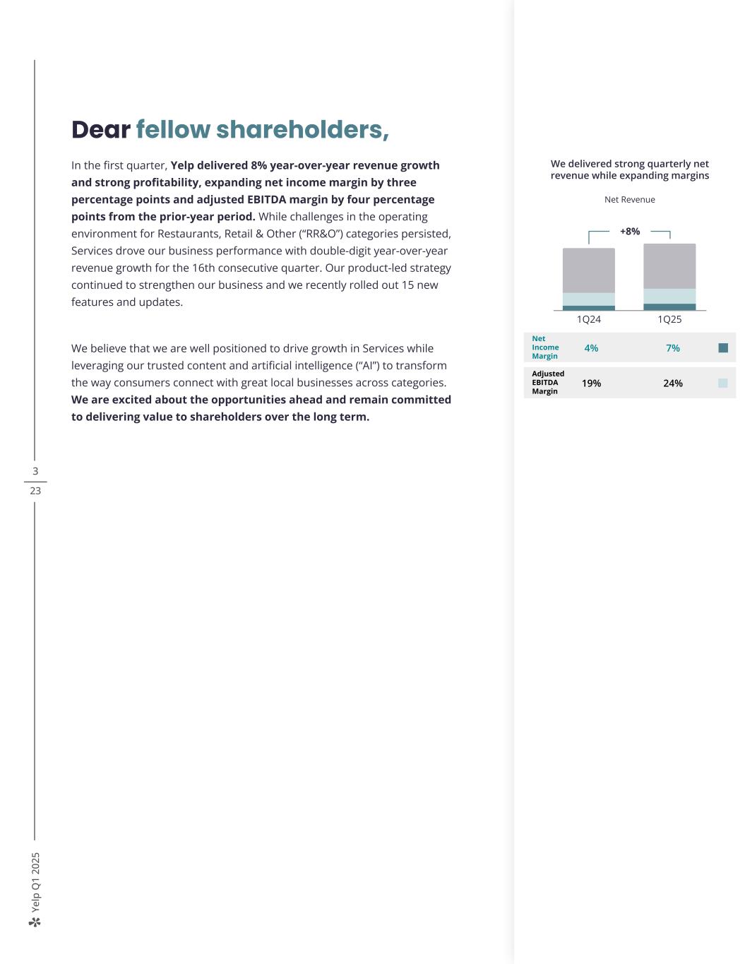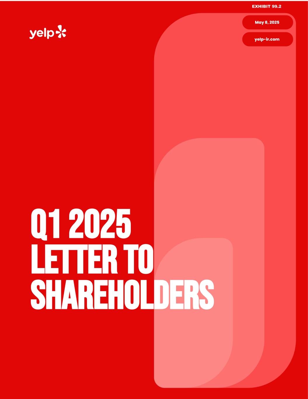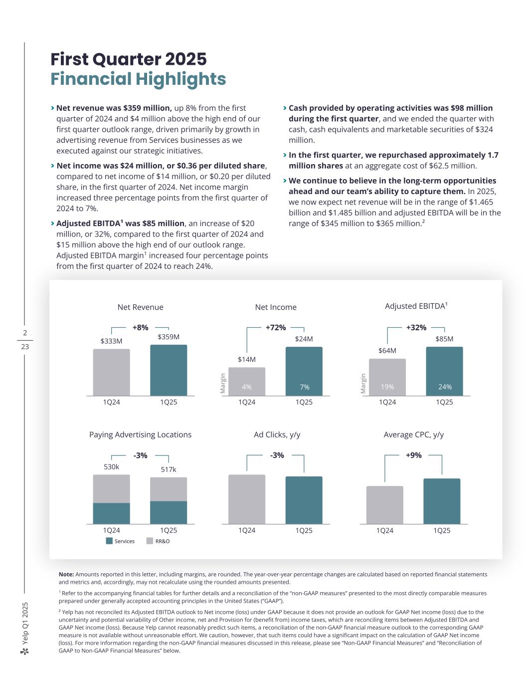 サンフランシスコ--(BUSINESS WIRE)--(ビジネスワイヤ) -- 2025年5月8日-- 地域の優良企業と人々をつなぐ信頼できるプラットフォームであるイェルプ・インク(NYSE: YELP)は本日、投資家向けウェブサイトyelp-ir.comで入手可能な2025年第1四半期株主通信で、2025年3月31日に終了した第1四半期の業績を発表しました。