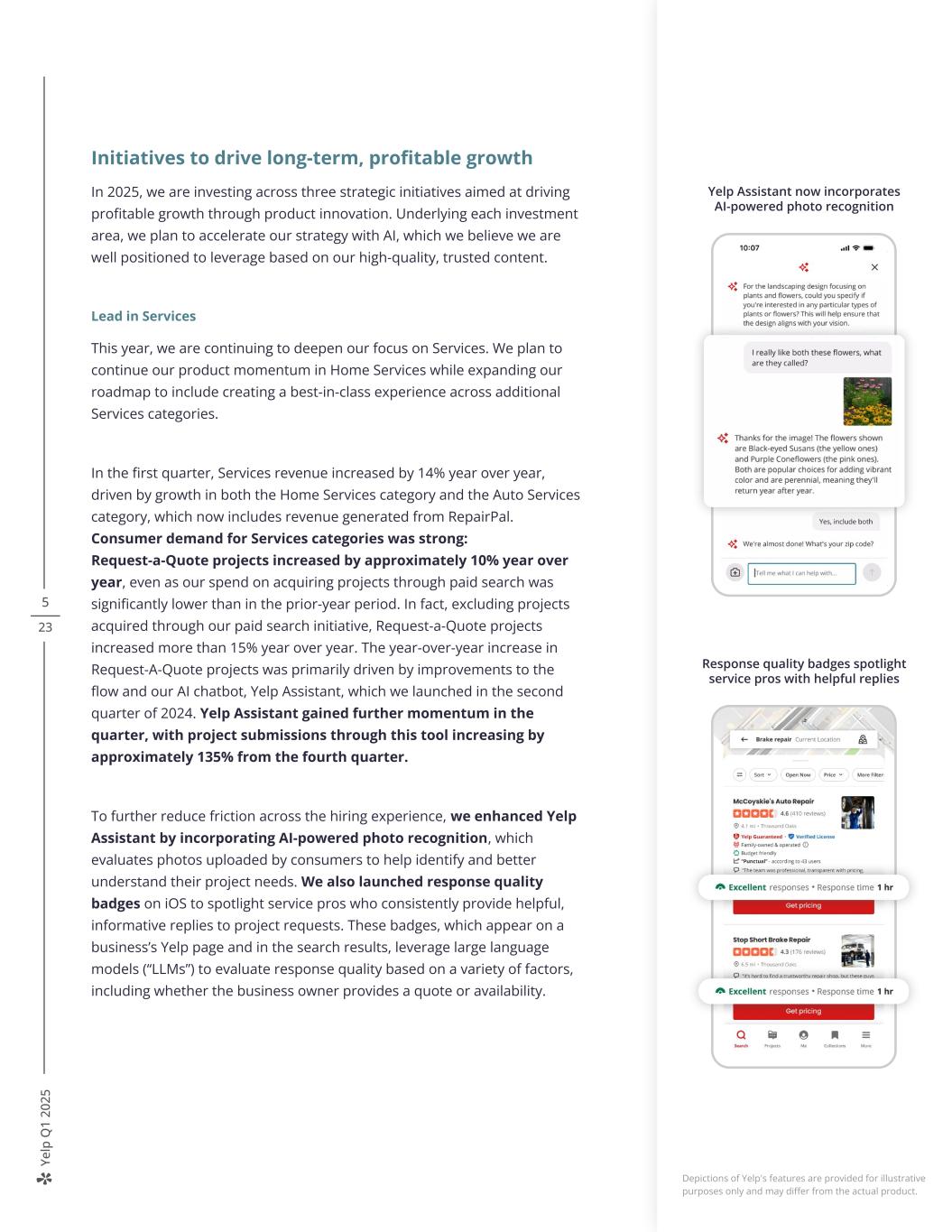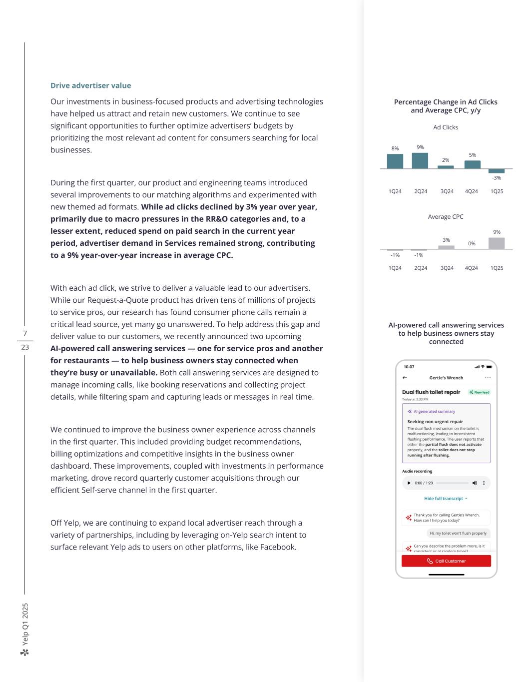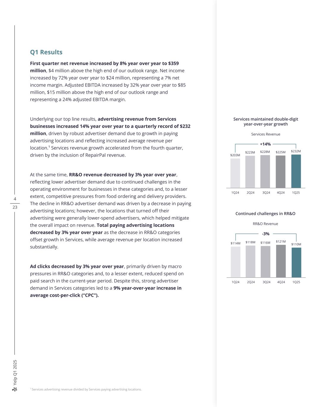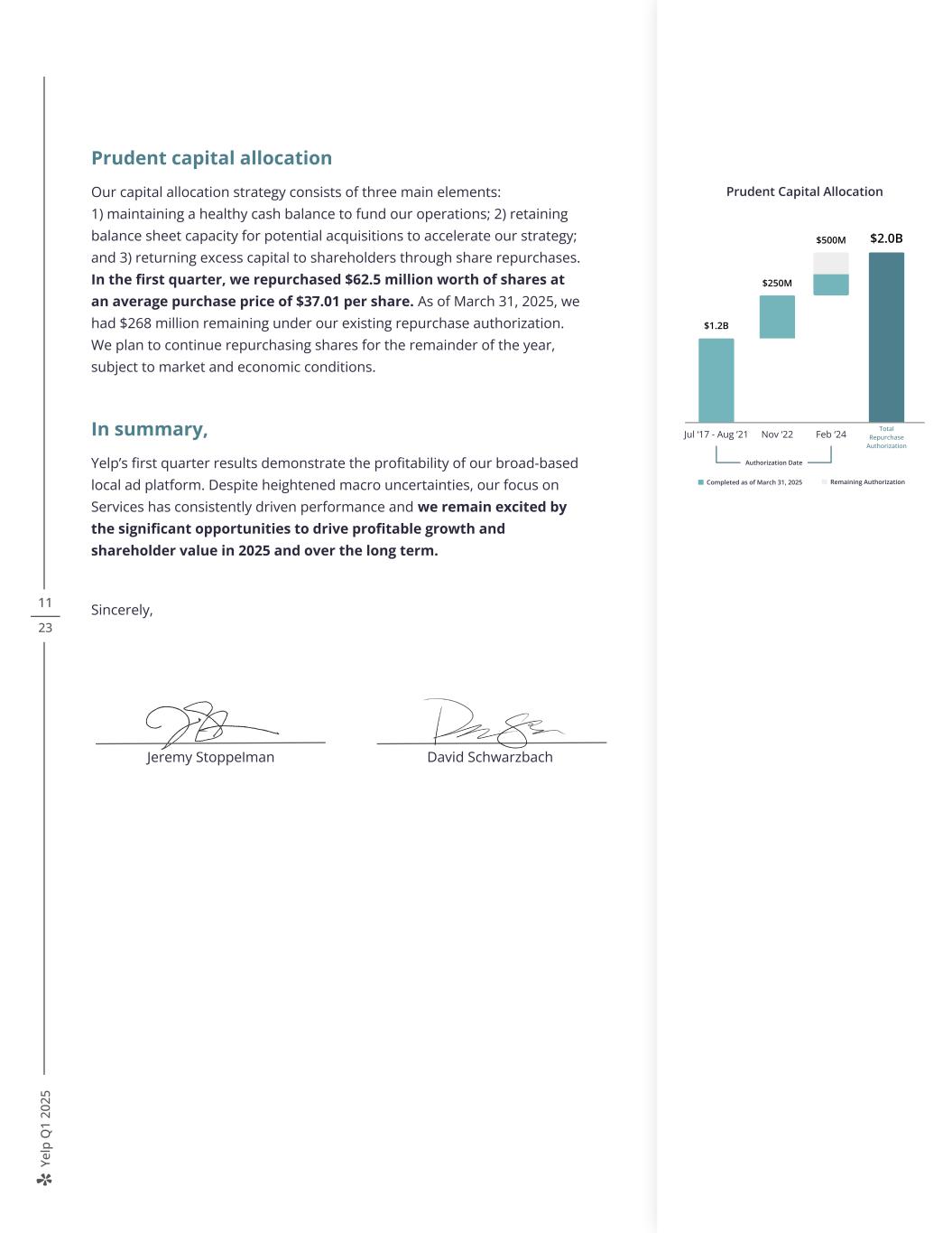 サンフランシスコ--(BUSINESS WIRE)--(ビジネスワイヤ) -- 2025年5月8日-- 地域の優良企業と人々をつなぐ信頼できるプラットフォームであるイェルプ・インク(NYSE: YELP)は本日、投資家向けウェブサイトyelp-ir.comで入手可能な2025年第1四半期株主通信で、2025年3月31日に終了した第1四半期の業績を発表しました。