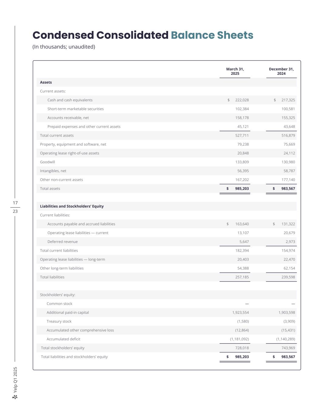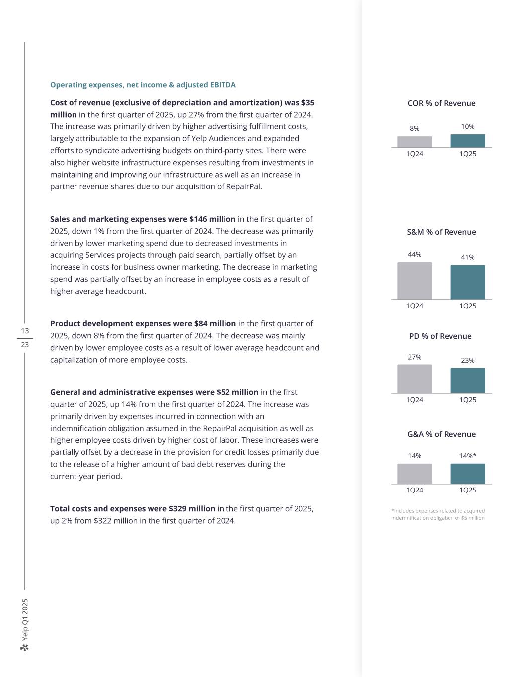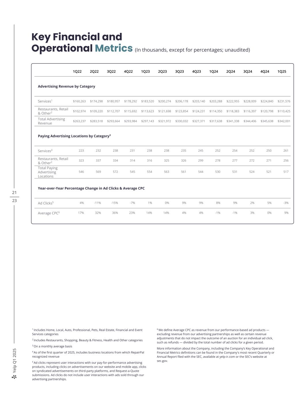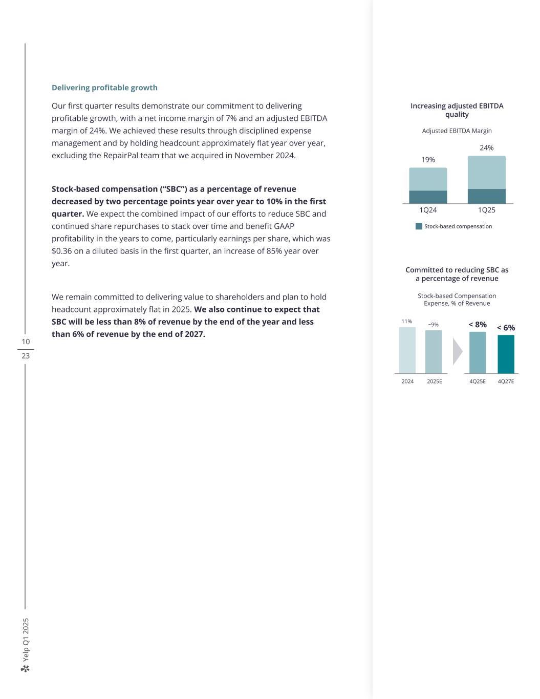 サンフランシスコ--(BUSINESS WIRE)--(ビジネスワイヤ) -- 2025年5月8日-- 地域の優良企業と人々をつなぐ信頼できるプラットフォームであるイェルプ・インク(NYSE: YELP)は本日、投資家向けウェブサイトyelp-ir.comで入手可能な2025年第1四半期株主通信で、2025年3月31日に終了した第1四半期の業績を発表しました。