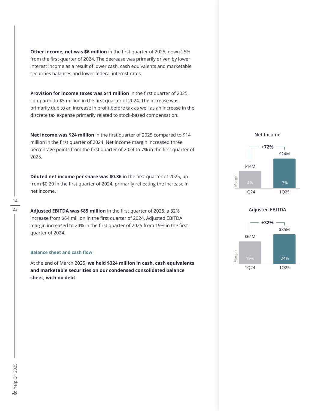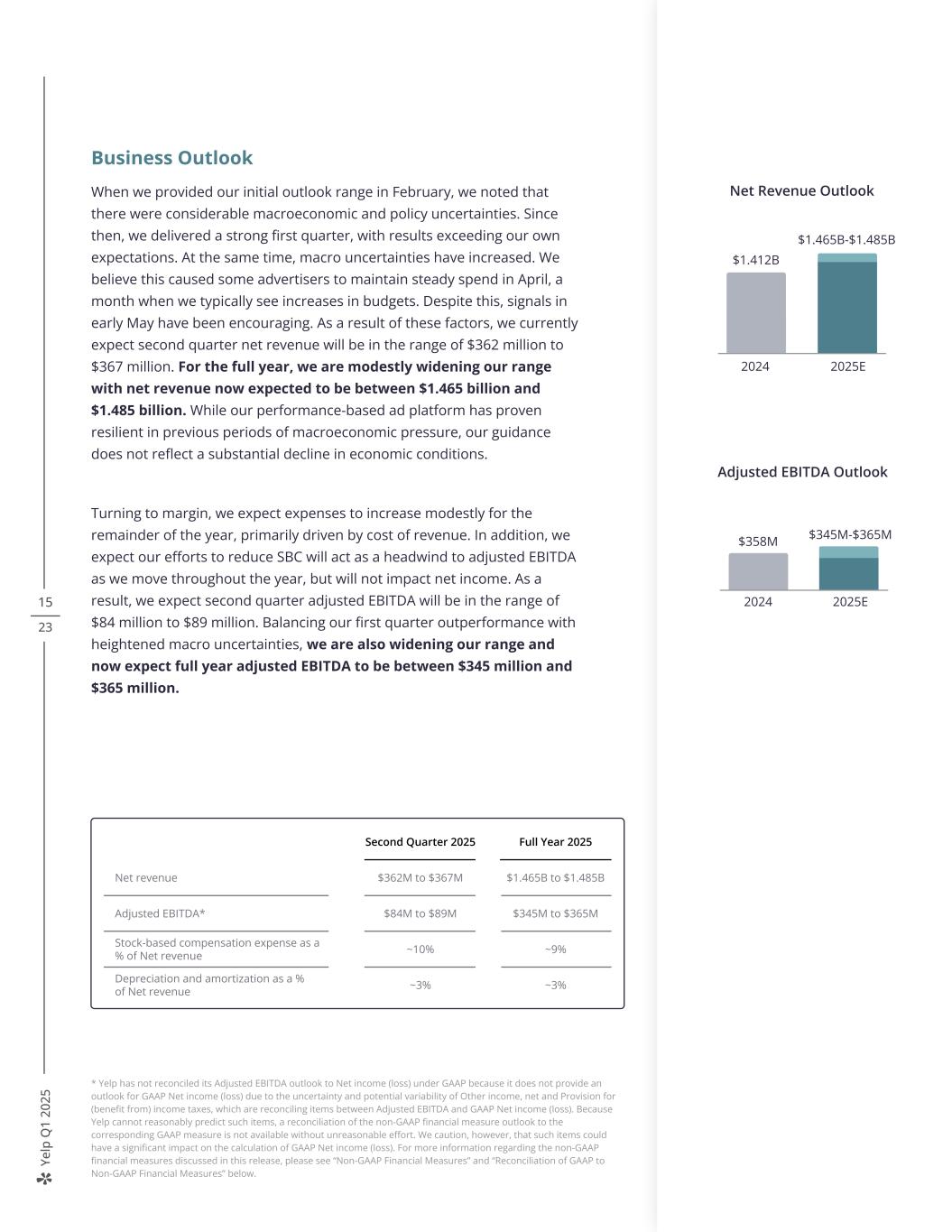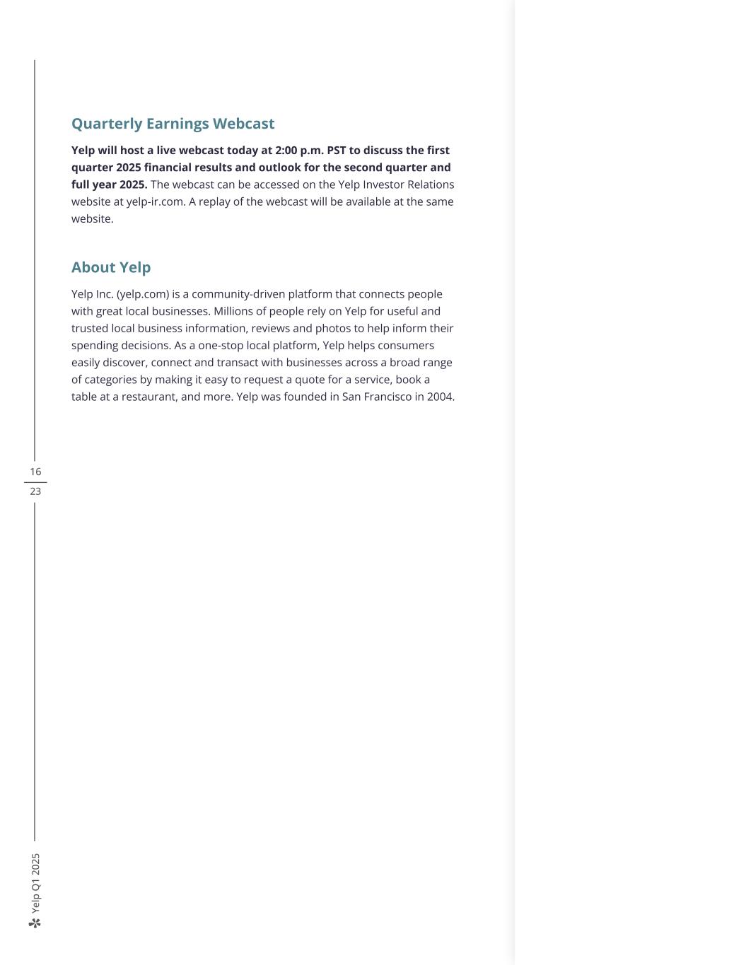 イェルプは本日午後2時(太平洋標準時)より、第1四半期決算と第2四半期および2025年通年の見通しに関するライブQ&Aセッションを開催します。Q&Aのウェブキャストは、イェルプ・インベスター・リレーションズのウェブサイト(yelp-ir.com)でご覧いただけます。ウェブキャストの再放送も同ウェブサイトでご覧いただけます。