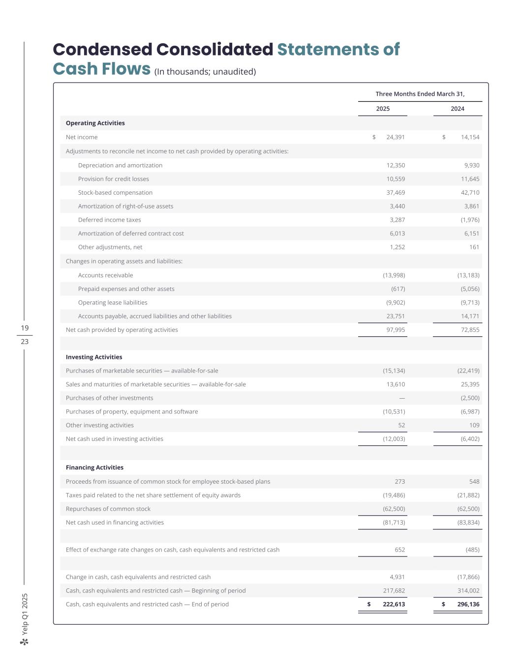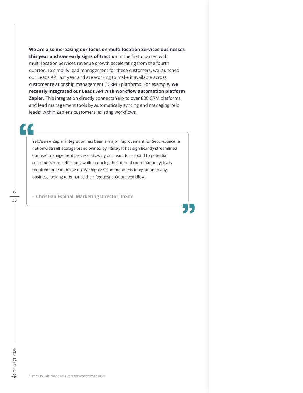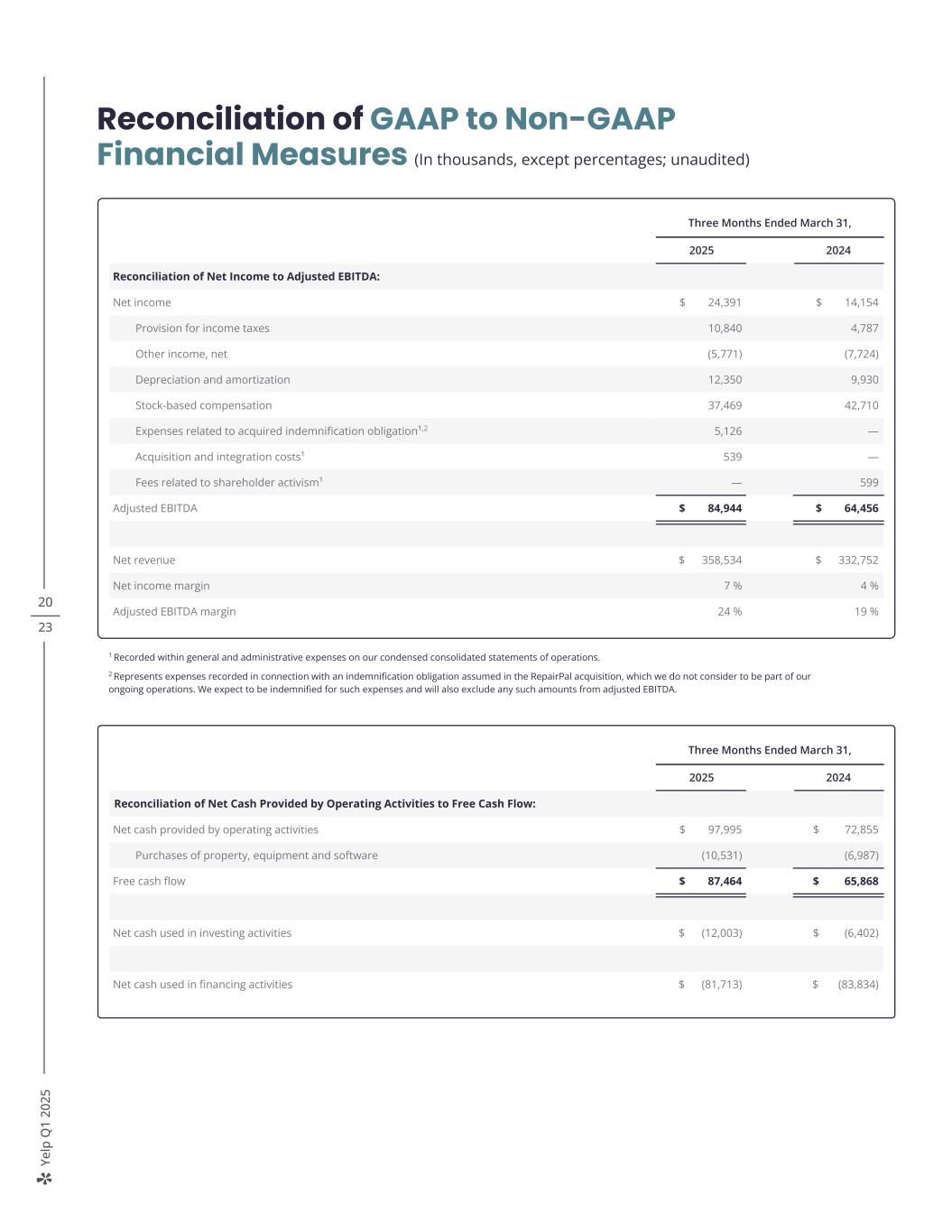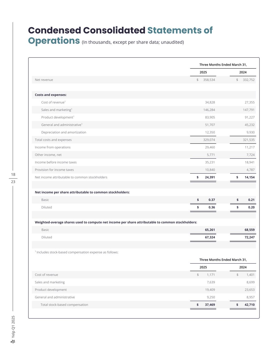 イェルプは本日午後2時(太平洋標準時)より、第1四半期決算と第2四半期および2025年通年の見通しに関するライブQ&Aセッションを開催します。Q&Aのウェブキャストは、イェルプ・インベスター・リレーションズのウェブサイト(yelp-ir.com)でご覧いただけます。ウェブキャストの再放送も同ウェブサイトでご覧いただけます。