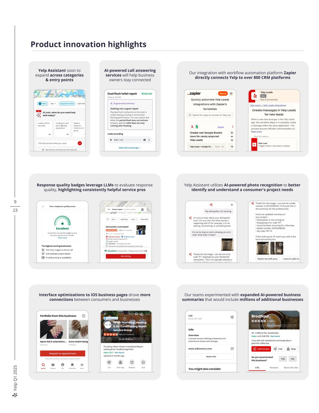 「イェルプの共同創業者で最高経営責任者(CEO)のジェレミー・ストッペルマンは、次のように述べています。「第1四半期の業績は、当社のサービス事業の強さと、製品ロードマップに対する進捗を示しています。「サービス収入は第1四半期に前年同期比14%増となり、16四半期連続の2桁成長を達成し、製品主導の戦略にも引き続き勢いがあります。当社は最近、消費者体験を向上させ、企業の業務管理を効率化する15の新機能とアップデートを発表しました。今後は、Yelpのエクスペリエンスをさらに変革し、ローカルビジネスのオペレーションを効率化する、ロードマップにあるAIのラインアップに期待しています。これらの取り組みが新たな成長の機会を引き出し、株主の皆様に長期的な価値をお届けできると信じています。"