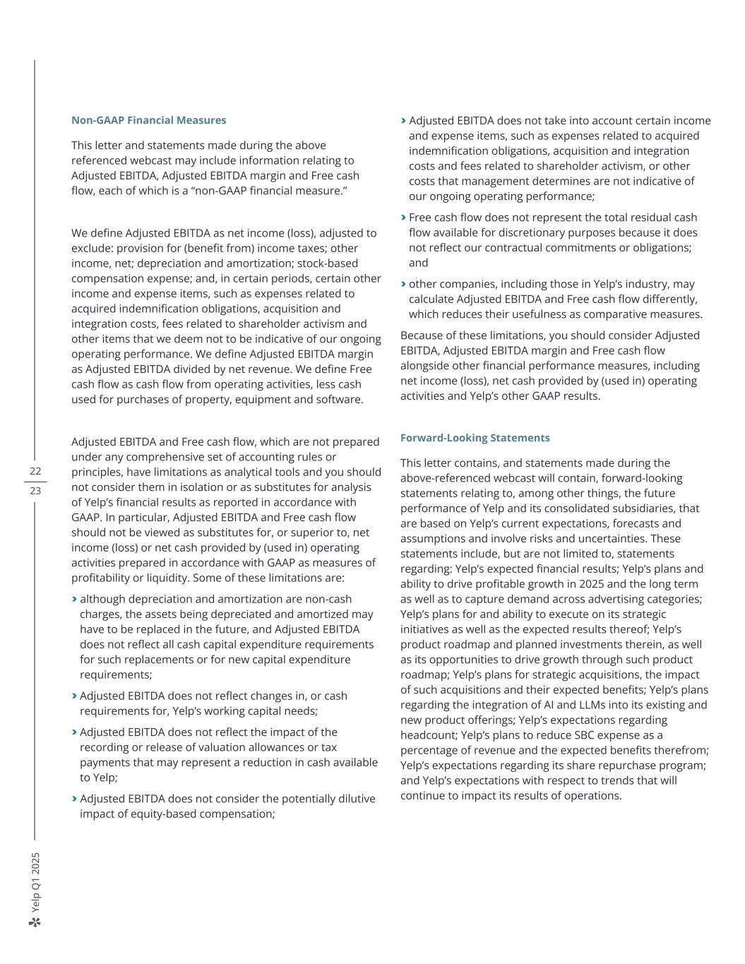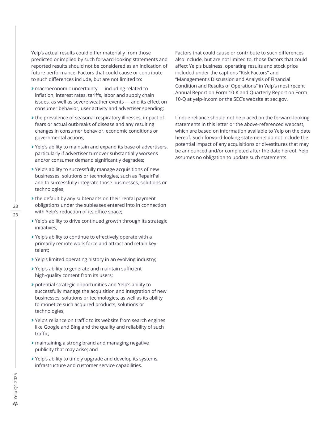 また、このような差異を生じさせる要因またはその一因となり得る要因には、yelp-ir.comまたはSECのウェブサイトsec.govにあるYelpの最新の年次報告書(Form 10-K)および四半期報告書(Form 10-Q)の「リスク要因」および「財政状態および経営成績に関する経営陣の検討および分析」に記載されているYelpの事業、経営成績、株価に影響を与え得る要因が含まれますが、これらに限定されるものではありません。