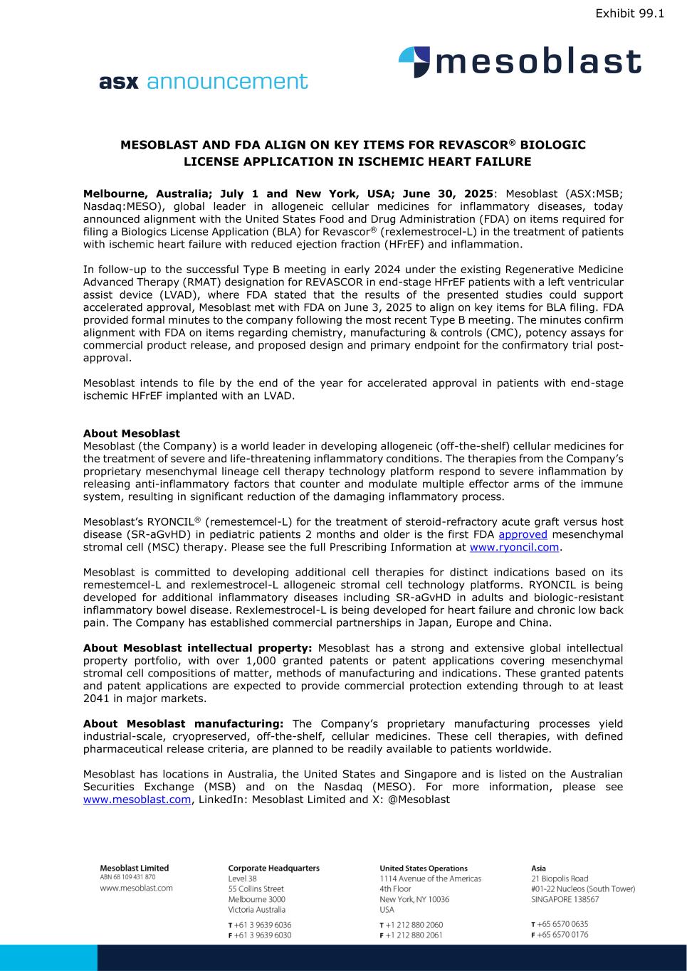 Press release of Mesoblast Ltd, dated July 1, 2025. |