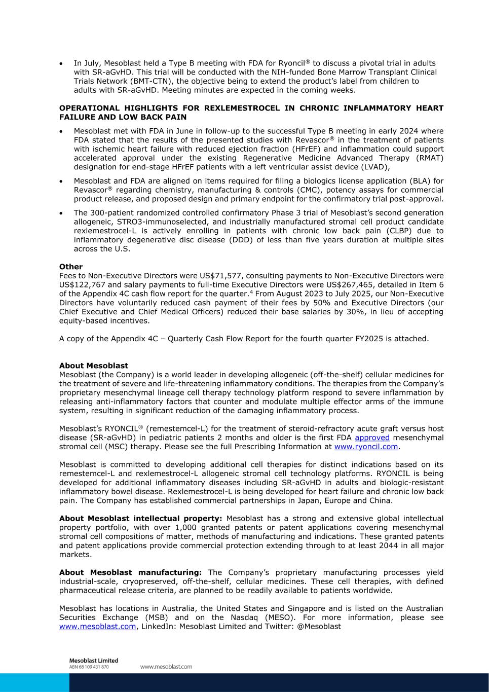 • In July, Mesoblast held a Type B meeting with FDA for Ryoncil® to discuss a pivotal trial in adults with SR-aGvHD. This trial will be conducted with the NIH-funded Bone Marrow Transplant Clinical Trials Network (BMT-CTN), the objective being to extend the product’s label from children to adults with SR-aGvHD. Meeting minutes are expected in the coming weeks. OPERATIONAL HIGHLIGHTS FOR REXLEMESTROCEL IN CHRONIC INFLAMMATORY HEART FAILURE AND LOW BACK PAIN • Mesoblast met with FDA in June in follow-up to the successful Type B meeting in early 2024 where FDA stated that the results of the presented studies with Revascor® in the treatment of patients with ischemic heart failure with reduced ejection fraction (HFrEF) and inflammation could support accelerated approval under the existing Regenerative Medicine Advanced Therapy (RMAT) designation for end-stage HFrEF patients with a left ventricular assist device (LVAD), • Mesoblast and FDA are aligned on items required for filing a biologics license application (BLA) for Revascor® regarding chemistry, manufacturing & controls (CMC), potency assays for commercial product release, and proposed design and primary endpoint for the confirmatory trial post-approval. • The 300-patient randomized controlled confirmatory Phase 3 trial of Mesoblast’s second generation allogeneic, STRO3-immunoselected, and industrially manufactured stromal cell product candidate rexlemestrocel-L is actively enrolling in patients with chronic low back pain (CLBP) due to inflammatory degenerative disc disease (DDD) of less than five years duration at multiple sites across the U.S. Other Fees to Non-Executive Directors were US$71,577, consulting payments to Non-Executive Directors were US$122,767 and salary payments to full-time Executive Directors were US$267,465, detailed in Item 6 of the Appendix 4C cash flow report for the quarter.4 From August 2023 to July 2025, our Non-Executive Directors have voluntarily reduced cash payment of their fees by 50% and Executive Directors (our Chief Executive and Chief Medical Officers) reduced their base salaries by 30%, in lieu of accepting equity-based incentives. A copy of the Appendix 4C – Quarterly Cash Flow Report for the fourth quarter FY2025 is attached. About Mesoblast Mesoblast (the Company) is a world leader in developing allogeneic (off-the-shelf) cellular medicines for the treatment of severe and life-threatening inflammatory conditions. The therapies from the Company’s proprietary mesenchymal lineage cell therapy technology platform respond to severe inflammation by releasing anti-inflammatory factors that counter and modulate multiple effector arms of the immune system, resulting in significant reduction of the damaging inflammatory process. Mesoblast’s RYONCIL® (remestemcel-L) for the treatment of steroid-refractory acute graft versus host disease (SR-aGvHD) in pediatric patients 2 months and older is the first FDA approved mesenchymal stromal cell (MSC) therapy. Please see the full Prescribing Information at www.ryoncil.com. Mesoblast is committed to developing additional cell therapies for distinct indications based on its remestemcel-L and rexlemestrocel-L allogeneic stromal cell technology platforms. RYONCIL is being developed for additional inflammatory diseases including SR-aGvHD in adults and biologic-resistant inflammatory bowel disease. Rexlemestrocel-L is being developed for heart failure and chronic low back pain. The Company has established commercial partnerships in Japan, Europe and China. About Mesoblast intellectual property: Mesoblast has a strong and extensive global intellectual property portfolio, with over 1,000 granted patents or patent applications covering mesenchymal stromal cell compositions of matter, methods of manufacturing and indications. These granted patents and patent applications provide commercial protection extending through to at least 2044 in all major markets. About Mesoblast manufacturing: The Company’s proprietary manufacturing processes yield industrial-scale, cryopreserved, off-the-shelf, cellular medicines. These cell therapies, with defined pharmaceutical release criteria, are planned to be readily available to patients worldwide. Mesoblast has locations in Australia, the United States and Singapore and is listed on the Australian Securities Exchange (MSB) and on the Nasdaq (MESO). For more information, please see www.mesoblast.com, LinkedIn: Mesoblast Limited and Twitter: @Mesoblast
