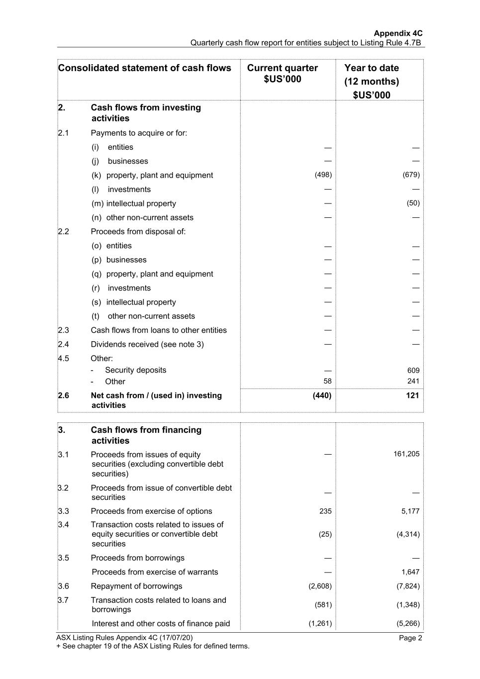 Appendix 4C Quarterly cash flow report for entities subject to Listing Rule 4.7B ASX Listing Rules Appendix 4C (17/07/20) + See chapter 19 of the ASX Listing Rules for defined terms. Page 2 Consolidated statement of cash flows Current quarter $US’000 Year to date (12 months) $US’000 2. Cash flows from investing activities 2.1 Payments to acquire or for: (i) entities — — (j) businesses — — (k) property, plant and equipment (498) (679) (l) investments — — (m) intellectual property — (50) (n) other non-current assets — — 2.2 Proceeds from disposal of: (o) entities — — (p) businesses — — (q) property, plant and equipment — — (r) investments — — (s) intellectual property — — (t) other non-current assets — — 2.3 Cash flows from loans to other entities — — 2.4 Dividends received (see note 3) — — 4.5 Other: - Security deposits — 609 - Other 58 241 2.6 Net cash from / (used in) investing (440) 121 activities 3. Cash flows from financing activities 3.1 Proceeds from issues of equity — 161,205 securities (excluding convertible debt securities) 3.2 Proceeds from issue of convertible debt securities — — 3.3 Proceeds from exercise of options 235 5,177 3.4 Transaction costs related to issues of equity securities or convertible debt (25) (4,314) securities 3.5 Proceeds from borrowings — — Proceeds from exercise of warrants — 1,647 3.6 Repayment of borrowings (2,608) (7,824) 3.7 Transaction costs related to loans and borrowings (581) (1,348) Interest and other costs of finance paid (1,261) (5,266)