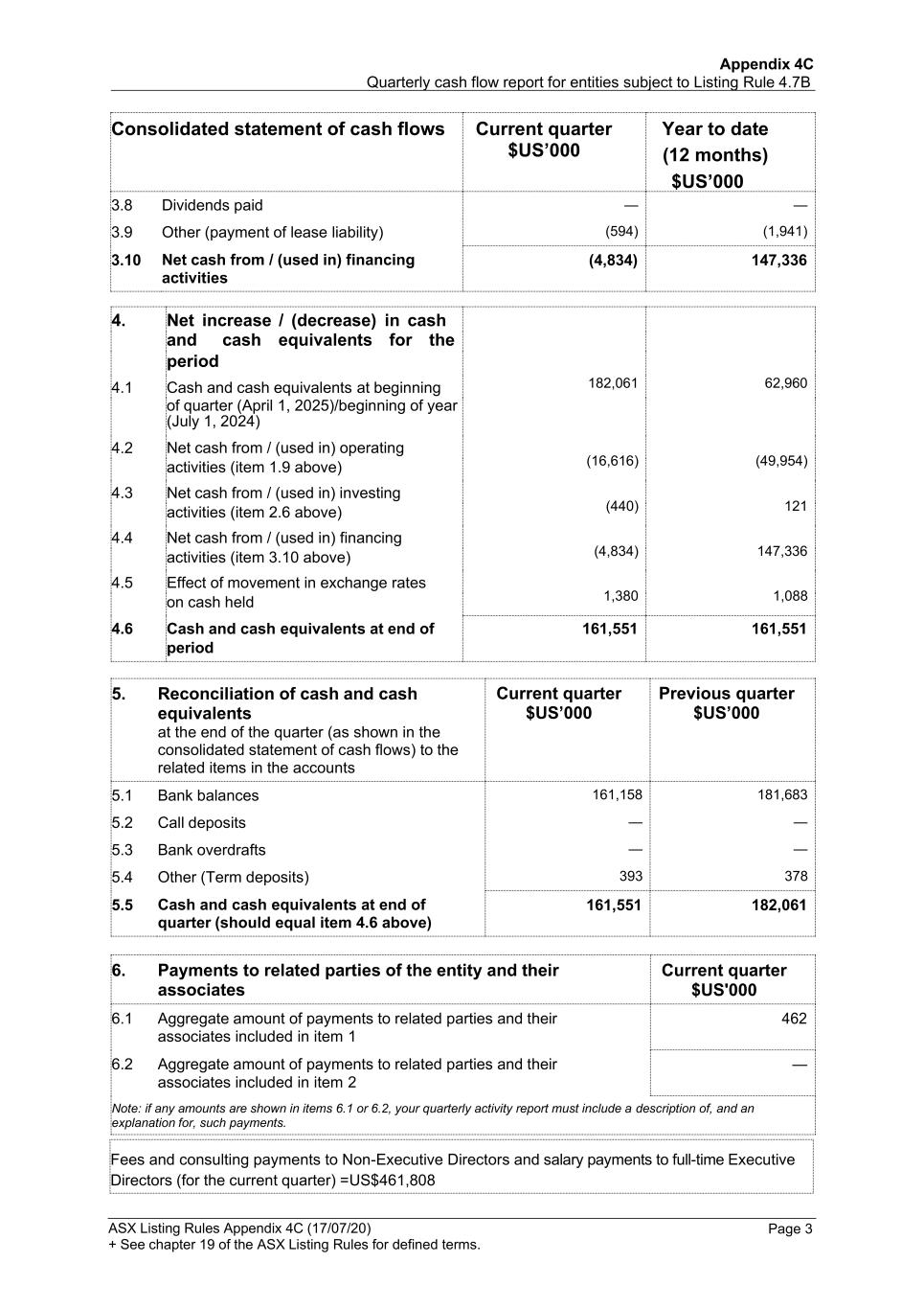 Appendix 4C Quarterly cash flow report for entities subject to Listing Rule 4.7B ASX Listing Rules Appendix 4C (17/07/20) + See chapter 19 of the ASX Listing Rules for defined terms. Page 3 Consolidated statement of cash flows Current quarter $US’000 Year to date (12 months) $US’000 3.8 Dividends paid — — 3.9 Other (payment of lease liability) (594) (1,941) 3.10 Net cash from / (used in) financing activities (4,834) 147,336 4. Net increase / (decrease) in cash 182,061 (16,616) (440) (4,834) 1,380 62,960 (49,954) 121 147,336 1,088 and cash equivalents for the period 4.1 Cash and cash equivalents at beginning of quarter (April 1, 2025)/beginning of year (July 1, 2024) 4.2 Net cash from / (used in) operating activities (item 1.9 above) 4.3 Net cash from / (used in) investing activities (item 2.6 above) 4.4 Net cash from / (used in) financing activities (item 3.10 above) 4.5 Effect of movement in exchange rates on cash held 4.6 Cash and cash equivalents at end of 161,551 161,551 period 5. Reconciliation of cash and cash equivalents at the end of the quarter (as shown in the consolidated statement of cash flows) to the related items in the accounts Current quarter $US’000 Previous quarter $US’000 5.1 Bank balances 161,158 181,683 5.2 Call deposits — — 5.3 Bank overdrafts — — 5.4 Other (Term deposits) 393 378 5.5 Cash and cash equivalents at end of quarter (should equal item 4.6 above) 161,551 182,061 6. Payments to related parties of the entity and their associates Current quarter $US'000 6.1 Aggregate amount of payments to related parties and their associates included in item 1 462 6.2 Aggregate amount of payments to related parties and their associates included in item 2 — Note: if any amounts are shown in items 6.1 or 6.2, your quarterly activity report must include a description of, and an explanation for, such payments. Fees and consulting payments to Non-Executive Directors and salary payments to full-time Executive Directors (for the current quarter) = US$461,808