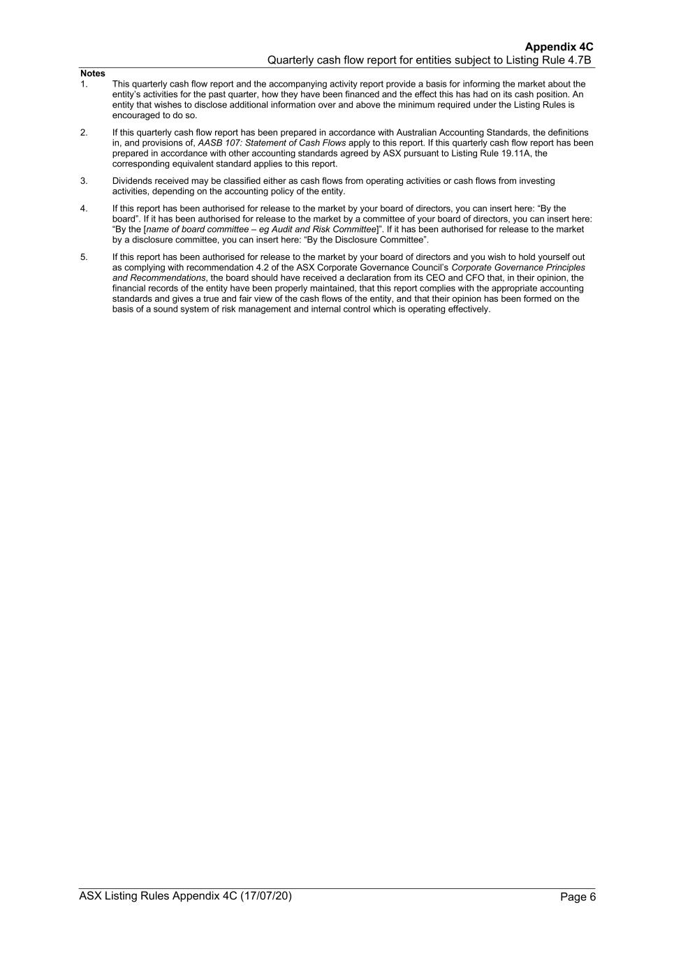 Appendix 4C Quarterly cash flow report for entities subject to Listing Rule 4.7B ASX Listing Rules Appendix 4C (17/07/20) + See chapter 19 of the ASX Listing Rules for defined terms. Page 6 Notes 1. This quarterly cash flow report and the accompanying activity report provide a basis for informing the market about the entity’s activities for the past quarter, how they have been financed and the effect this has had on its cash position. An entity that wishes to disclose additional information over and above the minimum required under the Listing Rules is encouraged to do so. 2. If this quarterly cash flow report has been prepared in accordance with Australian Accounting Standards, the definitions in, and provisions of, AASB 107: Statement of Cash Flows apply to this report. If this quarterly cash flow report has been prepared in accordance with other accounting standards agreed by ASX pursuant to Listing Rule 19.11A, the corresponding equivalent standard applies to this report. 3. Dividends received may be classified either as cash flows from operating activities or cash flows from investing activities, depending on the accounting policy of the entity. 4. If this report has been authorised for release to the market by your board of directors, you can insert here: “By the board”. If it has been authorised for release to the market by a committee of your board of directors, you can insert here: “By the [name of board committee – eg Audit and Risk Committee]”. If it has been authorised for release to the market by a disclosure committee, you can insert here: “By the Disclosure Committee”. 5. If this report has been authorised for release to the market by your board of directors and you wish to hold yourself out as complying with recommendation 4.2 of the ASX Corporate Governance Council’s Corporate Governance Principles and Recommendations, the board should have received a declaration from its CEO and CFO that, in their opinion, the financial records of the entity have been properly maintained, that this report complies with the appropriate accounting standards and gives a true and fair view of the cash flows of the entity, and that their opinion has been formed on the basis of a sound system of risk management and internal control which is operating effectively.