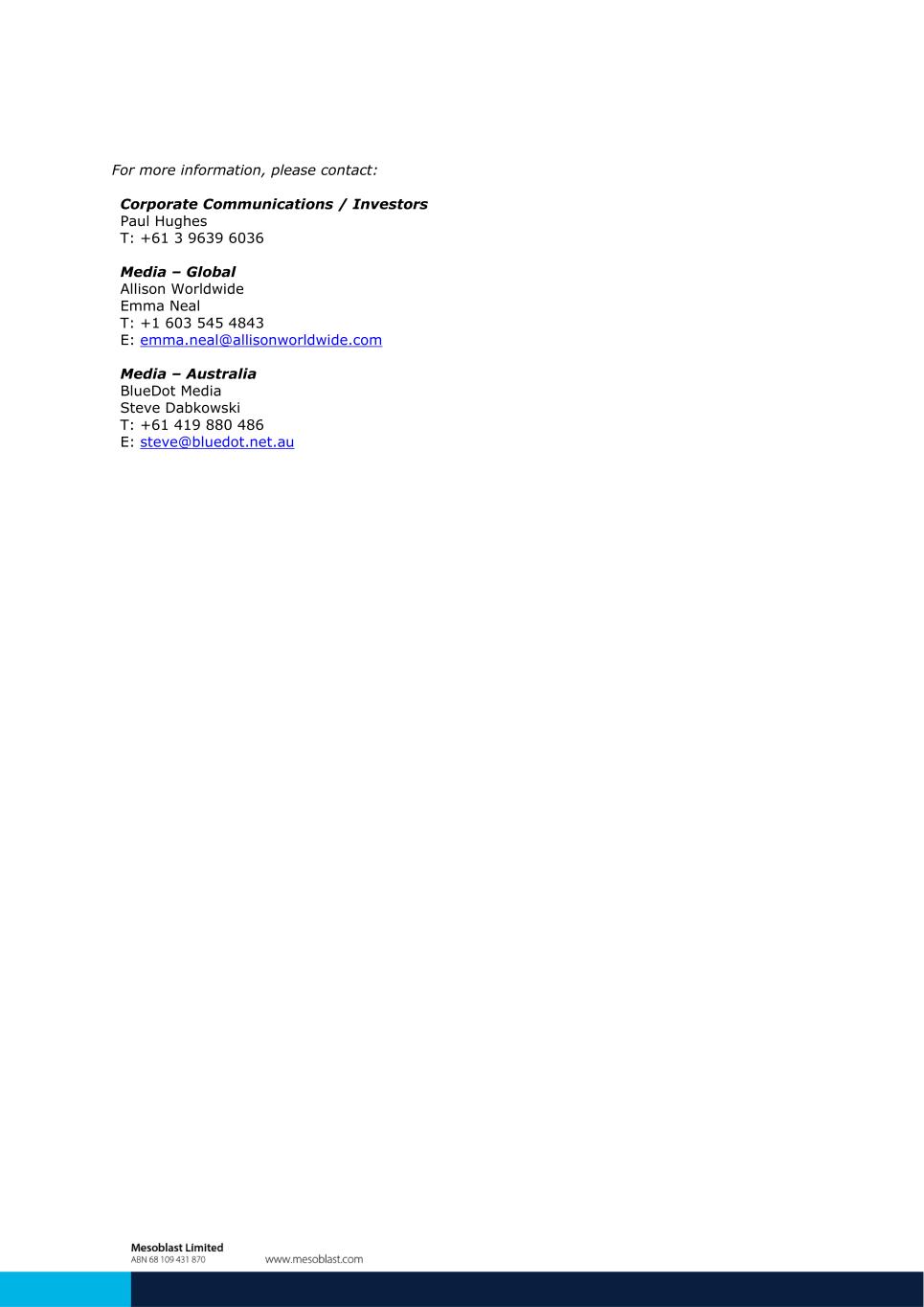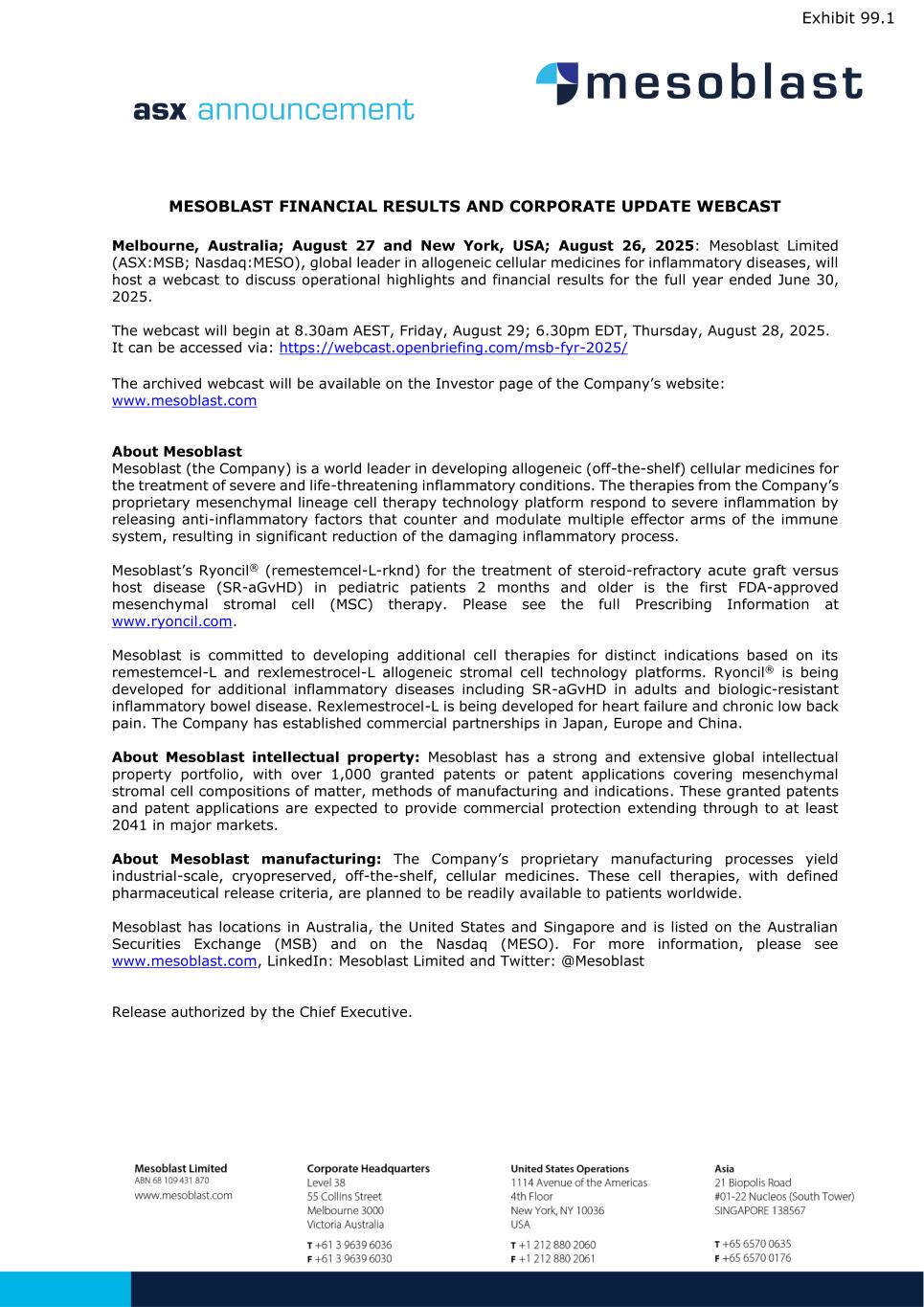 Press release of Mesoblast Ltd, dated August 27, 2025. |