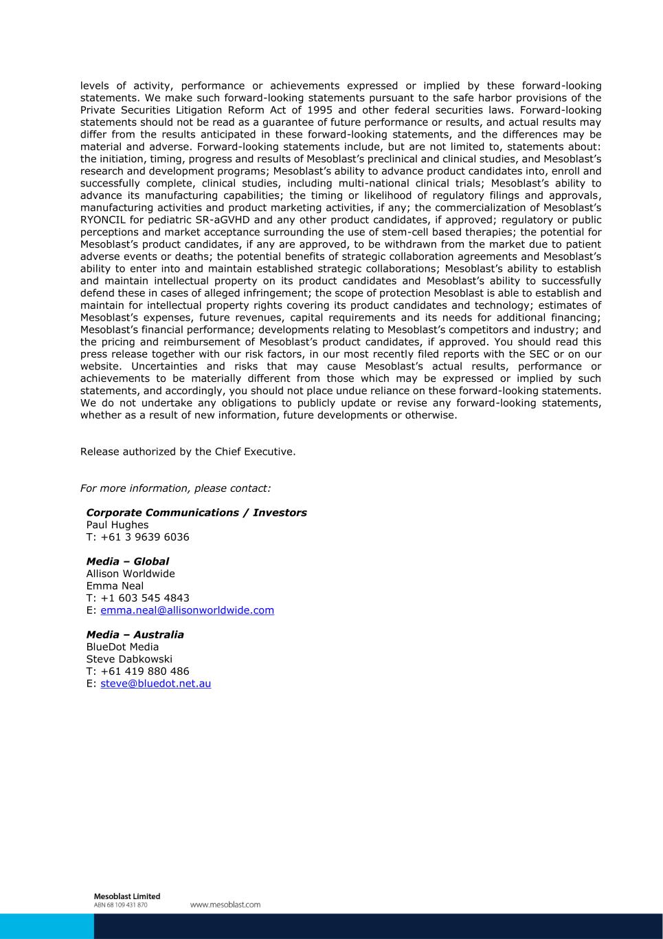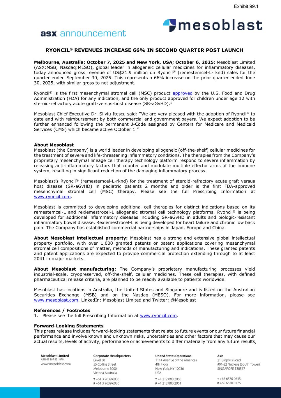 Press release of Mesoblast Ltd, dated October 7, 2025. |