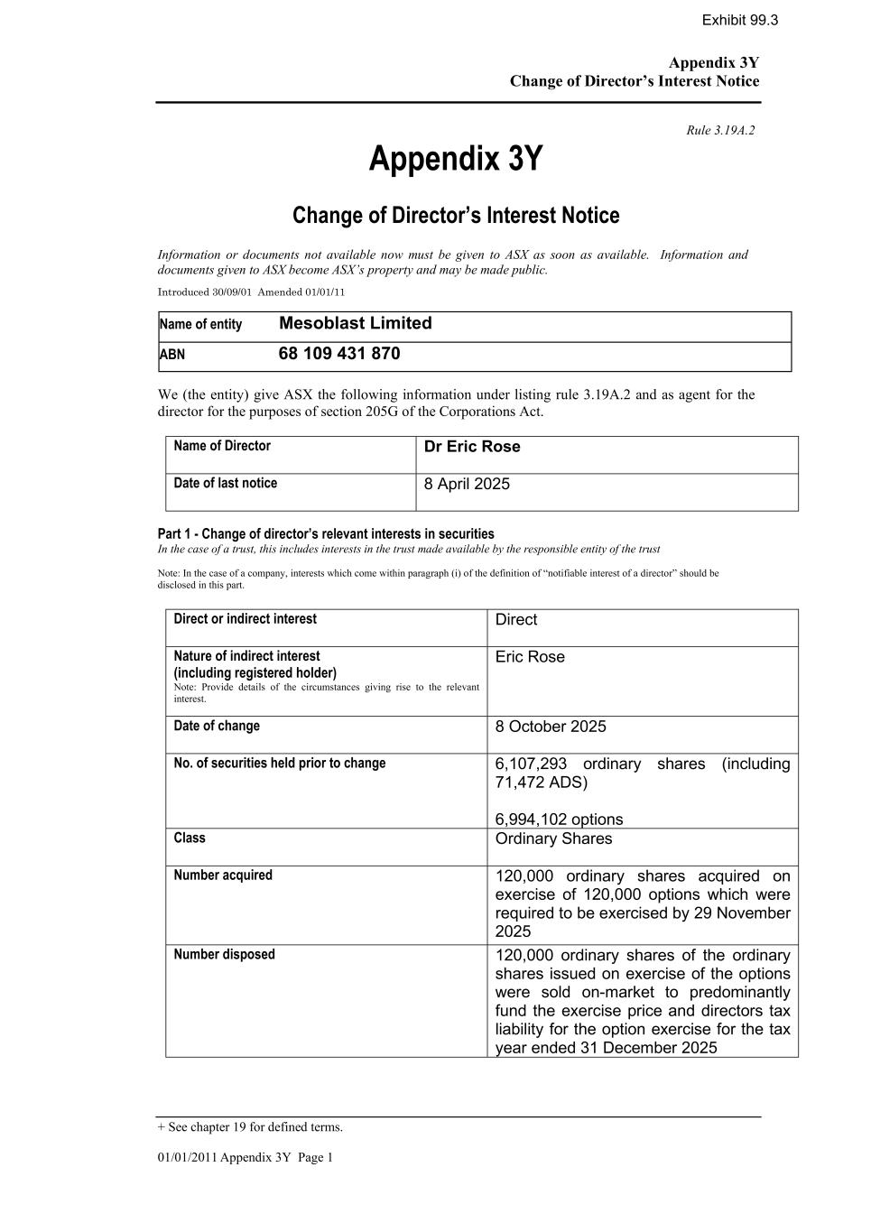 Appendix 3Y of Mesoblast Ltd, dated October 15, 2025. |