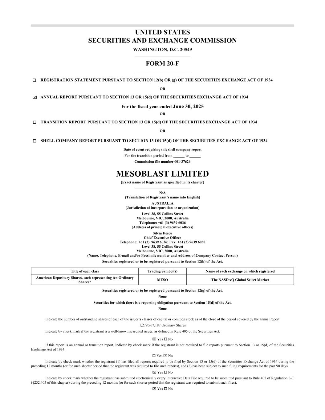 UNITED STATES SECURITIES AND EXCHANGE COMMISSION WASHINGTON, D.C. 20549 ______________________________ FORM 20-F ______________________________ o REGISTRATION STATEMENT PURSUANT TO SECTION 12(b) OR (g) OF THE SECURITIES EXCHANGE ACT OF 1934 OR x ANNUAL REPORT PURSUANT TO SECTION 13 OR 15(d) OF THE SECURITIES EXCHANGE ACT OF 1934 For the fiscal year ended June 30, 2025 OR o TRANSITION REPORT PURSUANT TO SECTION 13 OR 15(d) OF THE SECURITIES EXCHANGE ACT OF 1934 OR o SHELL COMPANY REPORT PURSUANT TO SECTION 13 OR 15(d) OF THE SECURITIES EXCHANGE ACT OF 1934 Date of event requiring this shell company report For the transition period from ______ to ______ Commission file number 001-37626 ______________________________ MESOBLAST LIMITED (Exact name of Registrant as specified in its charter) ______________________________ N/A (Translation of Registrant’s name into English) AUSTRALIA (Jurisdiction of incorporation or organization) Level 38, 55 Collins Street Melbourne, VIC, 3000, Australia Telephone: +61 (3) 9639 6036 (Address of principal executive offices) Silviu Itescu Chief Executive Officer Telephone: +61 (3) 9639 6036; Fax: +61 (3) 9639 6030 Level 38, 55 Collins Street Melbourne, VIC, 3000, Australia (Name, Telephone, E-mail and/or Facsimile number and Address of Company Contact Person) Securities registered or to be registered pursuant to Section 12(b) of the Act. Title of each class Trading Symbol(s) Name of each exchange on which registered American Depositary Shares, each representing ten Ordinary Shares* MESO The NASDAQ Global Select Market Securities registered or to be registered pursuant to Section 12(g) of the Act. None Securities for which there is a reporting obligation pursuant to Section 15(d) of the Act. None ______________________________ Indicate the number of outstanding shares of each of the issuer’s classes of capital or common stock as of the close of the period covered by the annual report. 1,279,967,187 Ordinary Shares Indicate by check mark if the registrant is a well-known seasoned issuer, as defined in Rule 405 of the Securities Act. x Yes o No If this report is an annual or transition report, indicate by check mark if the registrant is not required to file reports pursuant to Section 13 or 15(d) of the Securities Exchange Act of 1934. o Yes x No Indicate by check mark whether the registrant (1) has filed all reports required to be filed by Section 13 or 15(d) of the Securities Exchange Act of 1934 during the preceding 12 months (or for such shorter period that the registrant was required to file such reports), and (2) has been subject to such filing requirements for the past 90 days. x Yes o No Indicate by check mark whether the registrant has submitted electronically every Interactive Data File required to be submitted pursuant to Rule 405 of Regulation S-T (§232.405 of this chapter) during the preceding 12 months (or for such shorter period that the registrant was required to submit such files). x Yes o No