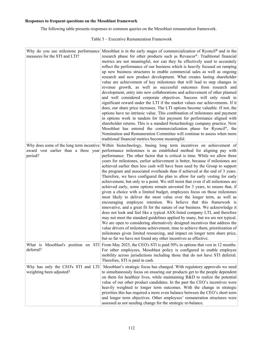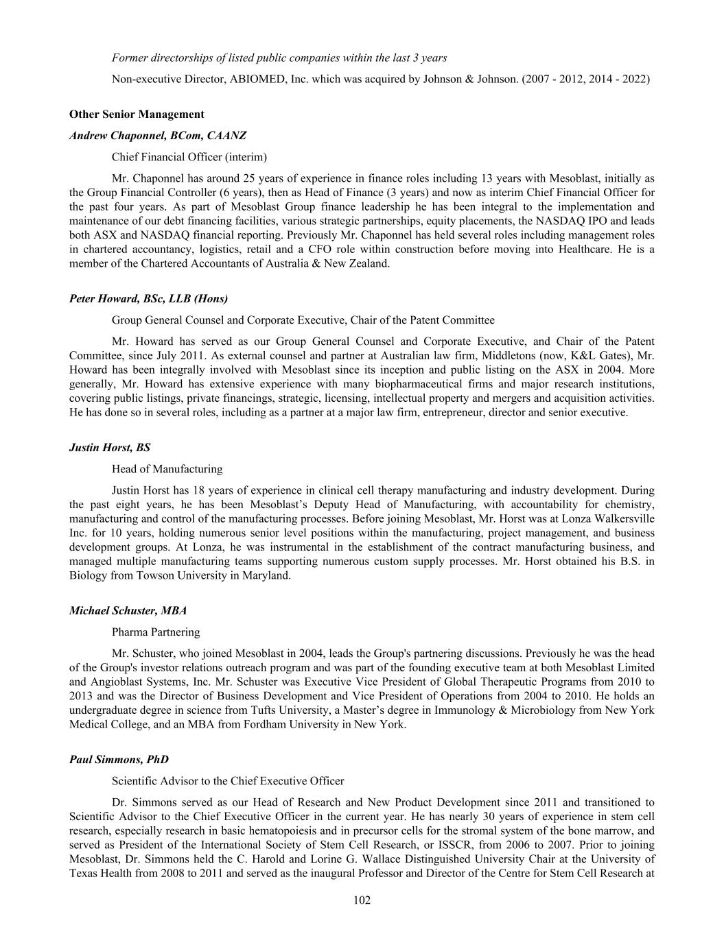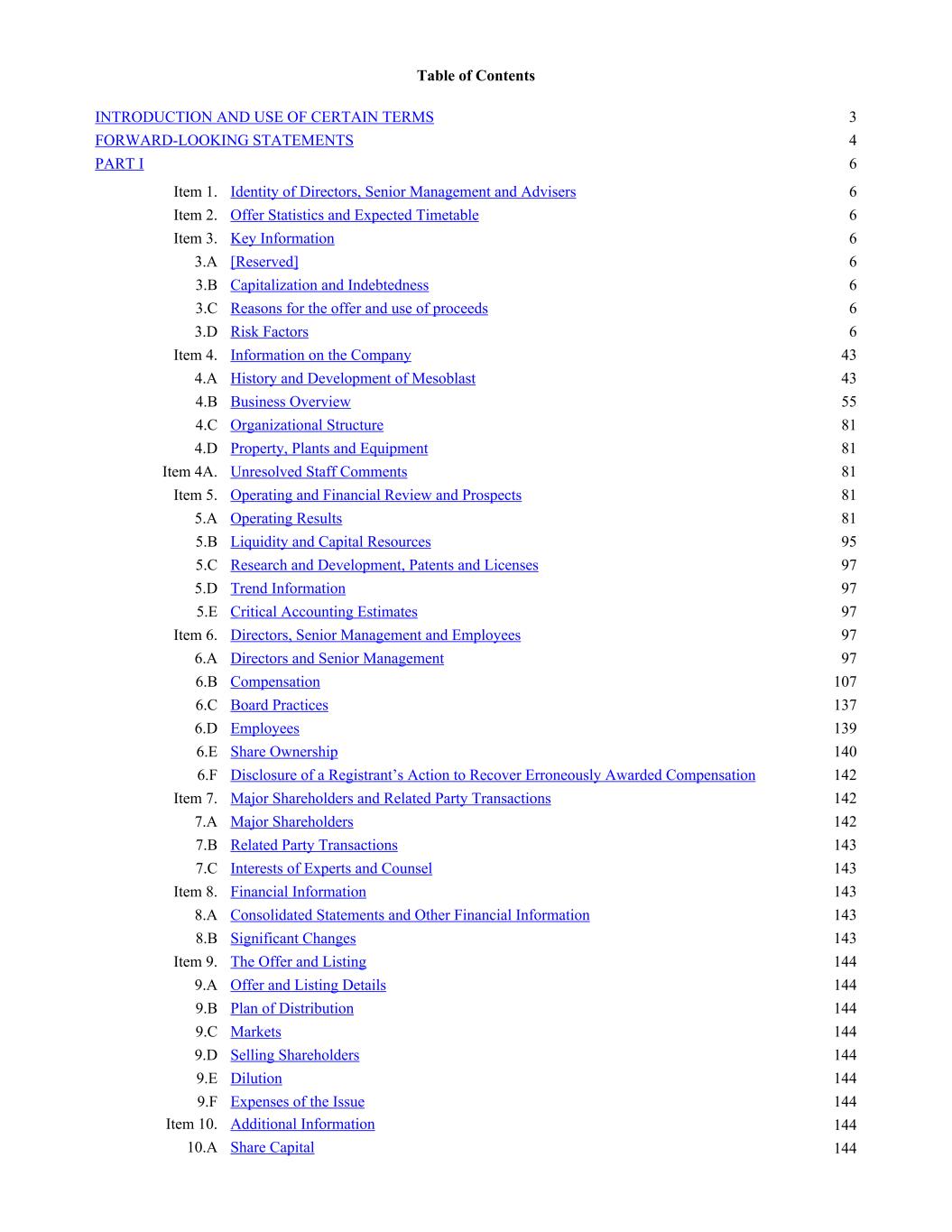 Table of Contents INTRODUCTION AND USE OF CERTAIN TERMS 3 FORWARD-LOOKING STATEMENTS 4 PART I 6 Item 1. Identity of Directors, Senior Management and Advisers 6 Item 2. Offer Statistics and Expected Timetable 6 Item 3. Key Information 6 3.A [Reserved] 6 3.B Capitalization and Indebtedness 6 3.C Reasons for the offer and use of proceeds 6 3.D Risk Factors 6 Item 4. Information on the Company 43 4.A History and Development of Mesoblast 43 4.B Business Overview 55 4.C Organizational Structure 81 4.D Property, Plants and Equipment 81 Item 4A. Unresolved Staff Comments 81 Item 5. Operating and Financial Review and Prospects 81 5.A Operating Results 81 5.B Liquidity and Capital Resources 95 5.C Research and Development, Patents and Licenses 97 5.D Trend Information 97 5.E Critical Accounting Estimates 97 Item 6. Directors, Senior Management and Employees 97 6.A Directors and Senior Management 97 6.B Compensation 107 6.C Board Practices 137 6.D Employees 139 6.E Share Ownership 140 6.F Disclosure of a Registrant’s Action to Recover Erroneously Awarded Compensation 142 Item 7. Major Shareholders and Related Party Transactions 142 7.A Major Shareholders 142 7.B Related Party Transactions 143 7.C Interests of Experts and Counsel 143 Item 8. Financial Information 143 8.A Consolidated Statements and Other Financial Information 143 8.B Significant Changes 143 Item 9. The Offer and Listing 144 9.A Offer and Listing Details 144 9.B Plan of Distribution 144 9.C Markets 144 9.D Selling Shareholders 144 9.E Dilution 144 9.F Expenses of the Issue 144 Item 10. Additional Information 144 10.A Share Capital 144
