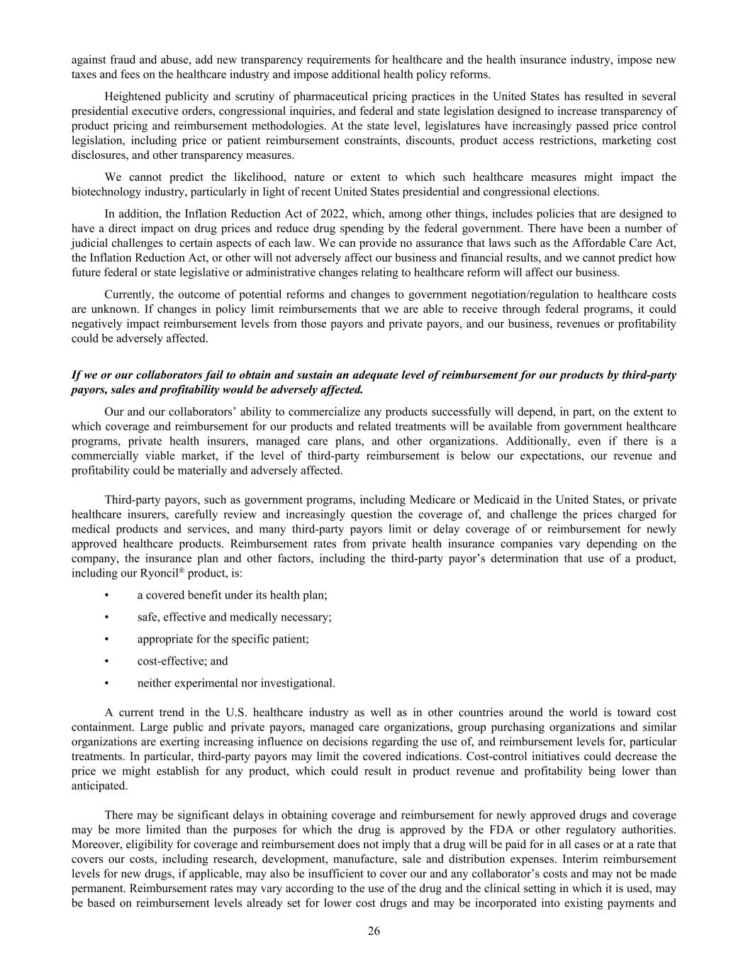 against fraud and abuse, add new transparency requirements for healthcare and the health insurance industry, impose new taxes and fees on the healthcare industry and impose additional health policy reforms. Heightened publicity and scrutiny of pharmaceutical pricing practices in the United States has resulted in several presidential executive orders, congressional inquiries, and federal and state legislation designed to increase transparency of product pricing and reimbursement methodologies. At the state level, legislatures have increasingly passed price control legislation, including price or patient reimbursement constraints, discounts, product access restrictions, marketing cost disclosures, and other transparency measures. We cannot predict the likelihood, nature or extent to which such healthcare measures might impact the biotechnology industry, particularly in light of recent United States presidential and congressional elections. In addition, the Inflation Reduction Act of 2022, which, among other things, includes policies that are designed to have a direct impact on drug prices and reduce drug spending by the federal government. There have been a number of judicial challenges to certain aspects of each law. We can provide no assurance that laws such as the Affordable Care Act, the Inflation Reduction Act, or other will not adversely affect our business and financial results, and we cannot predict how future federal or state legislative or administrative changes relating to healthcare reform will affect our business. Currently, the outcome of potential reforms and changes to government negotiation/regulation to healthcare costs are unknown. If changes in policy limit reimbursements that we are able to receive through federal programs, it could negatively impact reimbursement levels from those payors and private payors, and our business, revenues or profitability could be adversely affected. If we or our collaborators fail to obtain and sustain an adequate level of reimbursement for our products by third-party payors, sales and profitability would be adversely affected. Our and our collaborators’ ability to commercialize any products successfully will depend, in part, on the extent to which coverage and reimbursement for our products and related treatments will be available from government healthcare programs, private health insurers, managed care plans, and other organizations. Additionally, even if there is a commercially viable market, if the level of third-party reimbursement is below our expectations, our revenue and profitability could be materially and adversely affected. Third-party payors, such as government programs, including Medicare or Medicaid in the United States, or private healthcare insurers, carefully review and increasingly question the coverage of, and challenge the prices charged for medical products and services, and many third-party payors limit or delay coverage of or reimbursement for newly approved healthcare products. Reimbursement rates from private health insurance companies vary depending on the company, the insurance plan and other factors, including the third-party payor’s determination that use of a product, including our Ryoncil® product, is: • a covered benefit under its health plan; • safe, effective and medically necessary; • appropriate for the specific patient; • cost-effective; and • neither experimental nor investigational. A current trend in the U.S. healthcare industry as well as in other countries around the world is toward cost containment. Large public and private payors, managed care organizations, group purchasing organizations and similar organizations are exerting increasing influence on decisions regarding the use of, and reimbursement levels for, particular treatments. In particular, third-party payors may limit the covered indications. Cost-control initiatives could decrease the price we might establish for any product, which could result in product revenue and profitability being lower than anticipated. There may be significant delays in obtaining coverage and reimbursement for newly approved drugs and coverage may be more limited than the purposes for which the drug is approved by the FDA or other regulatory authorities. Moreover, eligibility for coverage and reimbursement does not imply that a drug will be paid for in all cases or at a rate that covers our costs, including research, development, manufacture, sale and distribution expenses. Interim reimbursement levels for new drugs, if applicable, may also be insufficient to cover our and any collaborator’s costs and may not be made permanent. Reimbursement rates may vary according to the use of the drug and the clinical setting in which it is used, may be based on reimbursement levels already set for lower cost drugs and may be incorporated into existing payments and 26