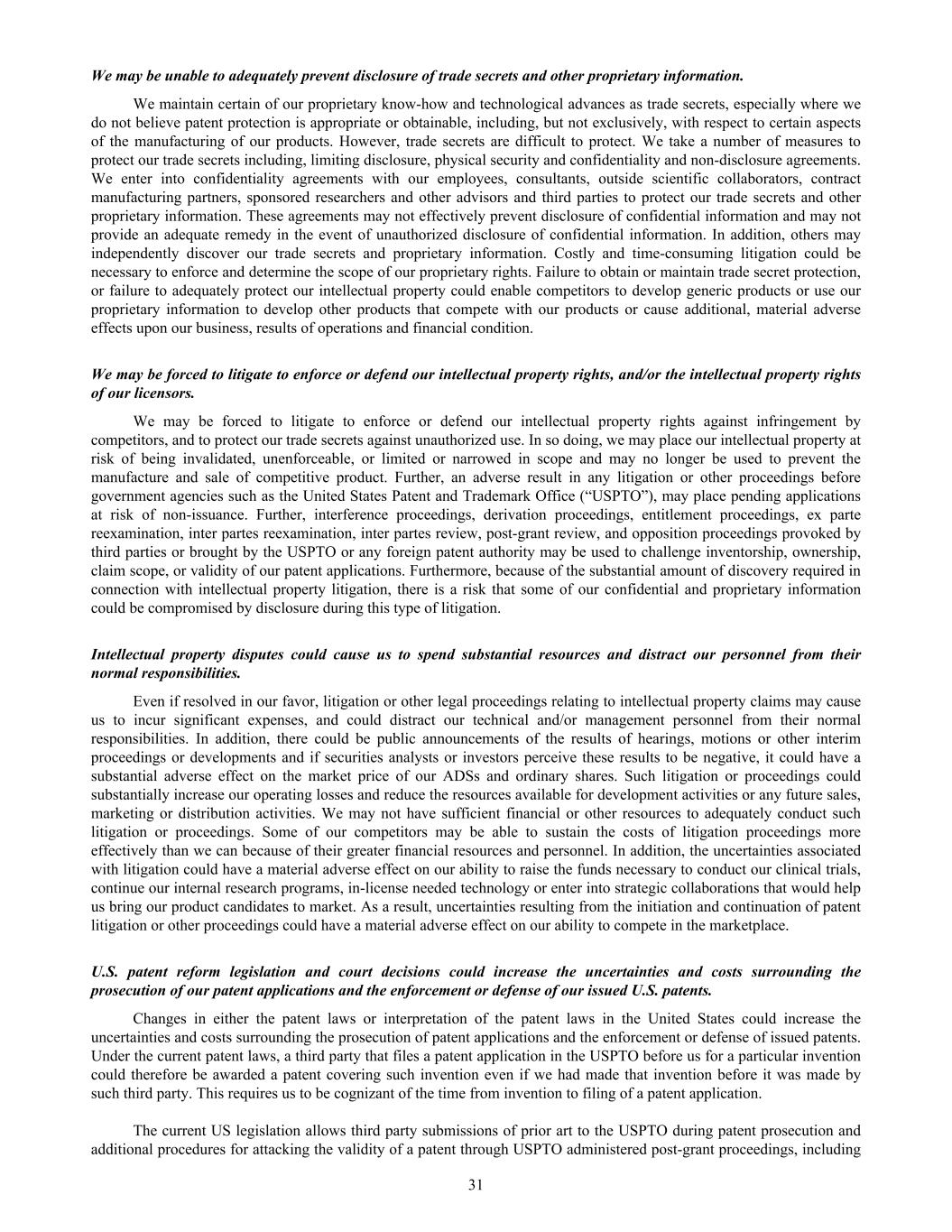 We may be unable to adequately prevent disclosure of trade secrets and other proprietary information. We maintain certain of our proprietary know-how and technological advances as trade secrets, especially where we do not believe patent protection is appropriate or obtainable, including, but not exclusively, with respect to certain aspects of the manufacturing of our products. However, trade secrets are difficult to protect. We take a number of measures to protect our trade secrets including, limiting disclosure, physical security and confidentiality and non-disclosure agreements. We enter into confidentiality agreements with our employees, consultants, outside scientific collaborators, contract manufacturing partners, sponsored researchers and other advisors and third parties to protect our trade secrets and other proprietary information. These agreements may not effectively prevent disclosure of confidential information and may not provide an adequate remedy in the event of unauthorized disclosure of confidential information. In addition, others may independently discover our trade secrets and proprietary information. Costly and time-consuming litigation could be necessary to enforce and determine the scope of our proprietary rights. Failure to obtain or maintain trade secret protection, or failure to adequately protect our intellectual property could enable competitors to develop generic products or use our proprietary information to develop other products that compete with our products or cause additional, material adverse effects upon our business, results of operations and financial condition. We may be forced to litigate to enforce or defend our intellectual property rights, and/or the intellectual property rights of our licensors. We may be forced to litigate to enforce or defend our intellectual property rights against infringement by competitors, and to protect our trade secrets against unauthorized use. In so doing, we may place our intellectual property at risk of being invalidated, unenforceable, or limited or narrowed in scope and may no longer be used to prevent the manufacture and sale of competitive product. Further, an adverse result in any litigation or other proceedings before government agencies such as the United States Patent and Trademark Office (“USPTO”), may place pending applications at risk of non-issuance. Further, interference proceedings, derivation proceedings, entitlement proceedings, ex parte reexamination, inter partes reexamination, inter partes review, post-grant review, and opposition proceedings provoked by third parties or brought by the USPTO or any foreign patent authority may be used to challenge inventorship, ownership, claim scope, or validity of our patent applications. Furthermore, because of the substantial amount of discovery required in connection with intellectual property litigation, there is a risk that some of our confidential and proprietary information could be compromised by disclosure during this type of litigation. Intellectual property disputes could cause us to spend substantial resources and distract our personnel from their normal responsibilities. Even if resolved in our favor, litigation or other legal proceedings relating to intellectual property claims may cause us to incur significant expenses, and could distract our technical and/or management personnel from their normal responsibilities. In addition, there could be public announcements of the results of hearings, motions or other interim proceedings or developments and if securities analysts or investors perceive these results to be negative, it could have a substantial adverse effect on the market price of our ADSs and ordinary shares. Such litigation or proceedings could substantially increase our operating losses and reduce the resources available for development activities or any future sales, marketing or distribution activities. We may not have sufficient financial or other resources to adequately conduct such litigation or proceedings. Some of our competitors may be able to sustain the costs of litigation proceedings more effectively than we can because of their greater financial resources and personnel. In addition, the uncertainties associated with litigation could have a material adverse effect on our ability to raise the funds necessary to conduct our clinical trials, continue our internal research programs, in-license needed technology or enter into strategic collaborations that would help us bring our product candidates to market. As a result, uncertainties resulting from the initiation and continuation of patent litigation or other proceedings could have a material adverse effect on our ability to compete in the marketplace. U.S. patent reform legislation and court decisions could increase the uncertainties and costs surrounding the prosecution of our patent applications and the enforcement or defense of our issued U.S. patents. Changes in either the patent laws or interpretation of the patent laws in the United States could increase the uncertainties and costs surrounding the prosecution of patent applications and the enforcement or defense of issued patents. Under the current patent laws, a third party that files a patent application in the USPTO before us for a particular invention could therefore be awarded a patent covering such invention even if we had made that invention before it was made by such third party. This requires us to be cognizant of the time from invention to filing of a patent application. The current US legislation allows third party submissions of prior art to the USPTO during patent prosecution and additional procedures for attacking the validity of a patent through USPTO administered post-grant proceedings, including 31
