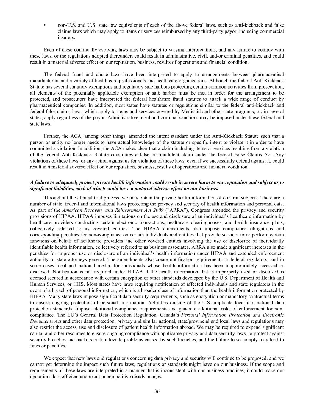 • non-U.S. and U.S. state law equivalents of each of the above federal laws, such as anti-kickback and false claims laws which may apply to items or services reimbursed by any third-party payor, including commercial insurers. Each of these continually evolving laws may be subject to varying interpretations, and any failure to comply with these laws, or the regulations adopted thereunder, could result in administrative, civil, and/or criminal penalties, and could result in a material adverse effect on our reputation, business, results of operations and financial condition. The federal fraud and abuse laws have been interpreted to apply to arrangements between pharmaceutical manufacturers and a variety of health care professionals and healthcare organizations. Although the federal Anti-Kickback Statute has several statutory exemptions and regulatory safe harbors protecting certain common activities from prosecution, all elements of the potentially applicable exemption or safe harbor must be met in order for the arrangement to be protected, and prosecutors have interpreted the federal healthcare fraud statutes to attack a wide range of conduct by pharmaceutical companies. In addition, most states have statutes or regulations similar to the federal anti-kickback and federal false claims laws, which apply to items and services covered by Medicaid and other state programs, or, in several states, apply regardless of the payor. Administrative, civil and criminal sanctions may be imposed under these federal and state laws. Further, the ACA, among other things, amended the intent standard under the Anti-Kickback Statute such that a person or entity no longer needs to have actual knowledge of the statute or specific intent to violate it in order to have committed a violation. In addition, the ACA makes clear that a claim including items or services resulting from a violation of the federal Anti-Kickback Statute constitutes a false or fraudulent claim under the federal False Claims Act. Any violations of these laws, or any action against us for violation of these laws, even if we successfully defend against it, could result in a material adverse effect on our reputation, business, results of operations and financial condition. A failure to adequately protect private health information could result in severe harm to our reputation and subject us to significant liabilities, each of which could have a material adverse effect on our business. Throughout the clinical trial process, we may obtain the private health information of our trial subjects. There are a number of state, federal and international laws protecting the privacy and security of health information and personal data. As part of the American Recovery and Reinvestment Act 2009 (“ARRA”), Congress amended the privacy and security provisions of HIPAA. HIPAA imposes limitations on the use and disclosure of an individual’s healthcare information by healthcare providers conducting certain electronic transactions, healthcare clearinghouses, and health insurance plans, collectively referred to as covered entities. The HIPAA amendments also impose compliance obligations and corresponding penalties for non-compliance on certain individuals and entities that provide services to or perform certain functions on behalf of healthcare providers and other covered entities involving the use or disclosure of individually identifiable health information, collectively referred to as business associates. ARRA also made significant increases in the penalties for improper use or disclosure of an individual’s health information under HIPAA and extended enforcement authority to state attorneys general. The amendments also create notification requirements to federal regulators, and in some cases local and national media, for individuals whose health information has been inappropriately accessed or disclosed. Notification is not required under HIPAA if the health information that is improperly used or disclosed is deemed secured in accordance with certain encryption or other standards developed by the U.S. Department of Health and Human Services, or HHS. Most states have laws requiring notification of affected individuals and state regulators in the event of a breach of personal information, which is a broader class of information than the health information protected by HIPAA. Many state laws impose significant data security requirements, such as encryption or mandatory contractual terms to ensure ongoing protection of personal information. Activities outside of the U.S. implicate local and national data protection standards, impose additional compliance requirements and generate additional risks of enforcement for non- compliance. The EU’s General Data Protection Regulation, Canada’s Personal Information Protection and Electronic Documents Act and other data protection, privacy and similar national, state/provincial and local laws and regulations may also restrict the access, use and disclosure of patient health information abroad. We may be required to expend significant capital and other resources to ensure ongoing compliance with applicable privacy and data security laws, to protect against security breaches and hackers or to alleviate problems caused by such breaches, and the failure to so comply may lead to fines or penalties. We expect that new laws and regulations concerning data privacy and security will continue to be proposed, and we cannot yet determine the impact such future laws, regulations or standards might have on our business. If the scope and requirements of these laws are interpreted in a manner that is inconsistent with our business practices, it could make our operations less efficient and result in competitive disadvantages. 36