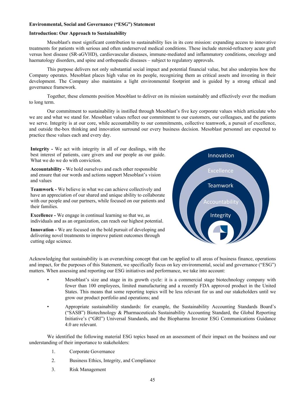 Environmental, Social and Governance (“ESG”) Statement Introduction: Our Approach to Sustainability Mesoblast's most significant contribution to sustainability lies in its core mission: expanding access to innovative treatments for patients with serious and often underserved medical conditions. These include steroid-refractory acute graft versus host disease (SR-aGVHD), cardiovascular diseases, immune-mediated and inflammatory conditions, oncology and haematology disorders, and spine and orthopaedic diseases – subject to regulatory approvals. This purpose delivers not only substantial social impact and potential financial value, but also underpins how the Company operates. Mesoblast places high value on its people, recognizing them as critical assets and investing in their development. The Company also maintains a light environmental footprint and is guided by a strong ethical and governance framework. Together, these elements position Mesoblast to deliver on its mission sustainably and effectively over the medium to long term. Our commitment to sustainability is instilled through Mesoblast’s five key corporate values which articulate who we are and what we stand for. Mesoblast values reflect our commitment to our customers, our colleagues, and the patients we serve. Integrity is at our core, while accountability to our commitments, collective teamwork, a pursuit of excellence, and outside the-box thinking and innovation surround our every business decision. Mesoblast personnel are expected to practice these values each and every day. Integrity - We act with integrity in all of our dealings, with the best interest of patients, care givers and our people as our guide. What we do we do with conviction. Accountability - We hold ourselves and each other responsible and ensure that our words and actions support Mesoblast’s vision and values Teamwork - We believe in what we can achieve collectively and have an appreciation of our shared and unique ability to collaborate with our people and our partners, while focused on our patients and their families. Excellence - We engage in continual learning so that we, as individuals and as an organization, can reach our highest potential. Innovation - We are focused on the bold pursuit of developing and delivering novel treatments to improve patient outcomes through cutting edge science. Acknowledging that sustainability is an overarching concept that can be applied to all areas of business finance, operations and impact, for the purposes of this Statement, we specifically focus on key environmental, social and governance (“ESG”) matters. When assessing and reporting our ESG initiatives and performance, we take into account: • Mesoblast’s size and stage in its growth cycle: it is a commercial stage biotechnology company with fewer than 100 employees, limited manufacturing and a recently FDA approved product in the United States. This means that some reporting topics will be less relevant for us and our stakeholders until we grow our product portfolio and operations; and • Appropriate sustainability standards: for example, the Sustainability Accounting Standards Board’s (“SASB”) Biotechnology & Pharmaceuticals Sustainability Accounting Standard, the Global Reporting Initiative’s (“GRI”) Universal Standards, and the Biopharma Investor ESG Communications Guidance 4.0 are relevant. We identified the following material ESG topics based on an assessment of their impact on the business and our understanding of their importance to stakeholders: 1. Corporate Governance 2. Business Ethics, Integrity, and Compliance 3. Risk Management 45