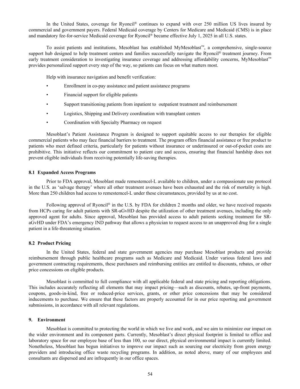 In the United States, coverage for Ryoncil® continues to expand with over 250 million US lives insured by commercial and government payers. Federal Medicaid coverage by Centers for Medicare and Medicaid (CMS) is in place and mandatory fee-for-service Medicaid coverage for Ryoncil® became effective July 1, 2025 in all U.S. states. To assist patients and institutions, Mesoblast has established MyMesoblast™, a comprehensive, single-source support hub designed to help treatment centers and families successfully navigate the Ryoncil® treatment journey. From early treatment consideration to investigating insurance coverage and addressing affordability concerns, MyMesoblast™ provides personalized support every step of the way, so patients can focus on what matters most. Help with insurance navigation and benefit verification: • Enrollment in co-pay assistance and patient assistance programs • Financial support for eligible patients • Support transitioning patients from inpatient to outpatient treatment and reimbursement • Logistics, Shipping and Delivery coordination with transplant centers • Coordination with Specialty Pharmacy on request Mesoblast’s Patient Assistance Program is designed to support equitable access to our therapies for eligible commercial patients who may face financial barriers to treatment. The program offers financial assistance or free product to patients who meet defined criteria, particularly for patients without insurance or underinsured or out-of-pocket costs are prohibitive. This initiative reflects our commitment to patient care and access, ensuring that financial hardship does not prevent eligible individuals from receiving potentially life-saving therapies. 8.1 Expanded Access Programs Prior to FDA approval, Mesoblast made remestemcel-L available to children, under a compassionate use protocol in the U.S. as ‘salvage therapy’ where all other treatment avenues have been exhausted and the risk of mortality is high. More than 250 children had access to remestemcel-L under these circumstances, provided by us at no cost. Following approval of Ryoncil® in the U.S. by FDA for children 2 months and older, we have received requests from HCPs caring for adult patients with SR-aGvHD despite the utilization of other treatment avenues, including the only approved agent for adults. Since approval, Mesoblast has provided access to adult patients seeking treatment for SR- aGvHD under FDA’s emergency IND pathway that allows a physician to request access to an unapproved drug for a single patient in a life-threatening situation. 8.2 Product Pricing In the United States, federal and state government agencies may purchase Mesoblast products and provide reimbursement through public healthcare programs such as Medicare and Medicaid. Under various federal laws and government contracting requirements, these purchasers and reimbursing entities are entitled to discounts, rebates, or other price concessions on eligible products. Mesoblast is committed to full compliance with all applicable federal and state pricing and reporting obligations. This includes accurately reflecting all elements that may impact pricing—such as discounts, rebates, up-front payments, coupons, goods-in-kind, free or reduced-price services, grants, or other price concessions that may be considered inducements to purchase. We ensure that these factors are properly accounted for in our price reporting and government submissions, in accordance with all relevant regulations. 9. Environment Mesoblast is committed to protecting the world in which we live and work, and we aim to minimize our impact on the wider environment and its component parts. Currently, Mesoblast’s direct physical footprint is limited to office and laboratory space for our employee base of less than 100, so our direct, physical environmental impact is currently limited. Nonetheless, Mesoblast has begun initiatives to improve our impact such as sourcing our electricity from green energy providers and introducing office waste recycling programs. In addition, as noted above, many of our employees and consultants are dispersed and are infrequently in our office spaces. 54