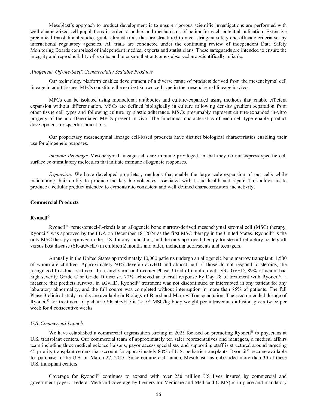 Mesoblast’s approach to product development is to ensure rigorous scientific investigations are performed with well-characterized cell populations in order to understand mechanisms of action for each potential indication. Extensive preclinical translational studies guide clinical trials that are structured to meet stringent safety and efficacy criteria set by international regulatory agencies. All trials are conducted under the continuing review of independent Data Safety Monitoring Boards comprised of independent medical experts and statisticians. These safeguards are intended to ensure the integrity and reproducibility of results, and to ensure that outcomes observed are scientifically reliable. Allogeneic, Off-the-Shelf, Commercially Scalable Products Our technology platform enables development of a diverse range of products derived from the mesenchymal cell lineage in adult tissues. MPCs constitute the earliest known cell type in the mesenchymal lineage in-vivo. MPCs can be isolated using monoclonal antibodies and culture-expanded using methods that enable efficient expansion without differentiation. MSCs are defined biologically in culture following density gradient separation from other tissue cell types and following culture by plastic adherence. MSCs presumably represent culture-expanded in-vitro progeny of the undifferentiated MPCs present in-vivo. The functional characteristics of each cell type enable product development for specific indications. Our proprietary mesenchymal lineage cell-based products have distinct biological characteristics enabling their use for allogeneic purposes. Immune Privilege: Mesenchymal lineage cells are immune privileged, in that they do not express specific cell surface co-stimulatory molecules that initiate immune allogeneic responses. Expansion: We have developed proprietary methods that enable the large-scale expansion of our cells while maintaining their ability to produce the key biomolecules associated with tissue health and repair. This allows us to produce a cellular product intended to demonstrate consistent and well-defined characterization and activity. Commercial Products Ryoncil® Ryoncil® (remestemcel-L-rknd) is an allogeneic bone marrow-derived mesenchymal stromal cell (MSC) therapy. Ryoncil® was approved by the FDA on December 18, 2024 as the first MSC therapy in the United States. Ryoncil® is the only MSC therapy approved in the U.S. for any indication, and the only approved therapy for steroid-refractory acute graft versus host disease (SR-aGvHD) in children 2 months and older, including adolescents and teenagers. Annually in the United States approximately 10,000 patients undergo an allogeneic bone marrow transplant, 1,500 of whom are children. Approximately 50% develop aGvHD and almost half of those do not respond to steroids, the recognized first-line treatment. In a single-arm multi-center Phase 3 trial of children with SR-aGvHD, 89% of whom had high severity Grade C or Grade D disease, 70% achieved an overall response by Day 28 of treatment with Ryoncil®, a measure that predicts survival in aGvHD. Ryoncil® treatment was not discontinued or interrupted in any patient for any laboratory abnormality, and the full course was completed without interruption in more than 85% of patients. The full Phase 3 clinical study results are available in Biology of Blood and Marrow Transplantation. The recommended dosage of Ryoncil® for treatment of pediatric SR-aGvHD is 2×106 MSC/kg body weight per intravenous infusion given twice per week for 4 consecutive weeks. U.S. Commercial Launch We have established a commercial organization starting in 2025 focused on promoting Ryoncil® to physcians at U.S. transplant centers. Our commercial team of approximately ten sales representatives and managers, a medical affairs team including three medical science liaisons, payor access specialists, and supporting staff is structured around targeting 45 priority transplant centers that account for approximately 80% of U.S. pediatric transplants. Ryoncil® became available for purchase in the U.S. on March 27, 2025. Since commercial launch, Mesoblast has onboarded more than 30 of these U.S. transplant centers. Coverage for Ryoncil® continues to expand with over 250 million US lives insured by commercial and government payers. Federal Medicaid coverage by Centers for Medicare and Medicaid (CMS) is in place and mandatory 56