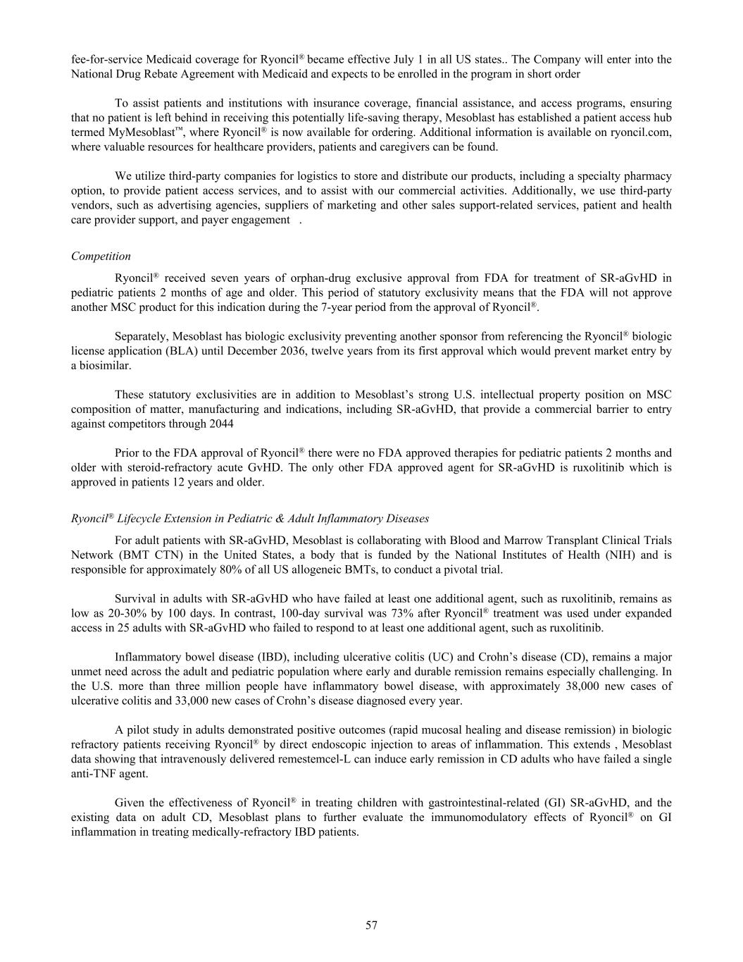 fee-for-service Medicaid coverage for Ryoncil® became effective July 1 in all US states.. The Company will enter into the National Drug Rebate Agreement with Medicaid and expects to be enrolled in the program in short order To assist patients and institutions with insurance coverage, financial assistance, and access programs, ensuring that no patient is left behind in receiving this potentially life-saving therapy, Mesoblast has established a patient access hub termed MyMesoblast™, where Ryoncil® is now available for ordering. Additional information is available on ryoncil.com, where valuable resources for healthcare providers, patients and caregivers can be found. We utilize third-party companies for logistics to store and distribute our products, including a specialty pharmacy option, to provide patient access services, and to assist with our commercial activities. Additionally, we use third-party vendors, such as advertising agencies, suppliers of marketing and other sales support-related services, patient and health care provider support, and payer engagement . Competition Ryoncil® received seven years of orphan-drug exclusive approval from FDA for treatment of SR-aGvHD in pediatric patients 2 months of age and older. This period of statutory exclusivity means that the FDA will not approve another MSC product for this indication during the 7-year period from the approval of Ryoncil®. Separately, Mesoblast has biologic exclusivity preventing another sponsor from referencing the Ryoncil® biologic license application (BLA) until December 2036, twelve years from its first approval which would prevent market entry by a biosimilar. These statutory exclusivities are in addition to Mesoblast’s strong U.S. intellectual property position on MSC composition of matter, manufacturing and indications, including SR-aGvHD, that provide a commercial barrier to entry against competitors through 2044 Prior to the FDA approval of Ryoncil® there were no FDA approved therapies for pediatric patients 2 months and older with steroid-refractory acute GvHD. The only other FDA approved agent for SR-aGvHD is ruxolitinib which is approved in patients 12 years and older. Ryoncil® Lifecycle Extension in Pediatric & Adult Inflammatory Diseases For adult patients with SR-aGvHD, Mesoblast is collaborating with Blood and Marrow Transplant Clinical Trials Network (BMT CTN) in the United States, a body that is funded by the National Institutes of Health (NIH) and is responsible for approximately 80% of all US allogeneic BMTs, to conduct a pivotal trial. Survival in adults with SR-aGvHD who have failed at least one additional agent, such as ruxolitinib, remains as low as 20-30% by 100 days. In contrast, 100-day survival was 73% after Ryoncil® treatment was used under expanded access in 25 adults with SR-aGvHD who failed to respond to at least one additional agent, such as ruxolitinib. Inflammatory bowel disease (IBD), including ulcerative colitis (UC) and Crohn’s disease (CD), remains a major unmet need across the adult and pediatric population where early and durable remission remains especially challenging. In the U.S. more than three million people have inflammatory bowel disease, with approximately 38,000 new cases of ulcerative colitis and 33,000 new cases of Crohn’s disease diagnosed every year. A pilot study in adults demonstrated positive outcomes (rapid mucosal healing and disease remission) in biologic refractory patients receiving Ryoncil® by direct endoscopic injection to areas of inflammation. This extends , Mesoblast data showing that intravenously delivered remestemcel-L can induce early remission in CD adults who have failed a single anti-TNF agent. Given the effectiveness of Ryoncil® in treating children with gastrointestinal-related (GI) SR-aGvHD, and the existing data on adult CD, Mesoblast plans to further evaluate the immunomodulatory effects of Ryoncil® on GI inflammation in treating medically-refractory IBD patients. 57