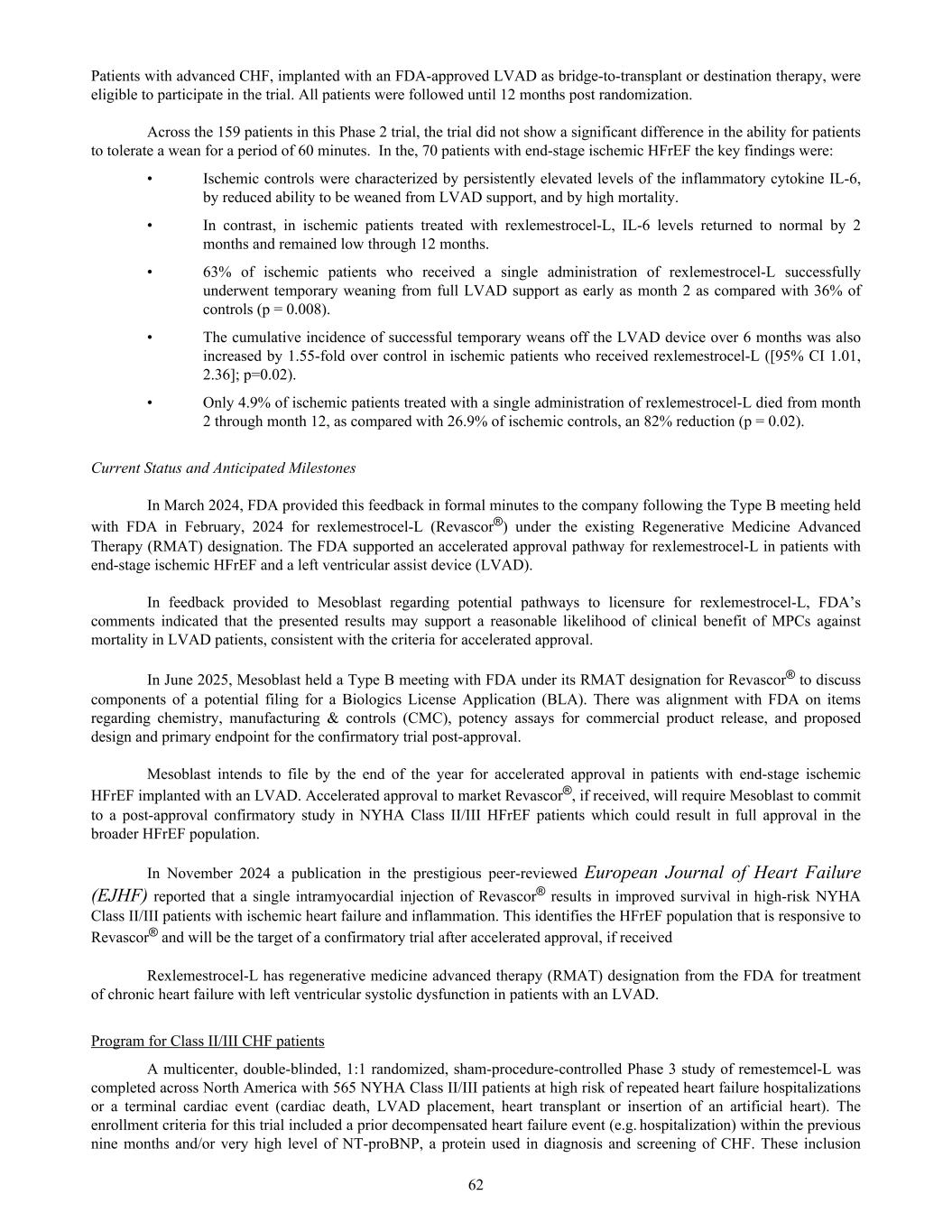 Patients with advanced CHF, implanted with an FDA-approved LVAD as bridge-to-transplant or destination therapy, were eligible to participate in the trial. All patients were followed until 12 months post randomization. Across the 159 patients in this Phase 2 trial, the trial did not show a significant difference in the ability for patients to tolerate a wean for a period of 60 minutes. In the, 70 patients with end-stage ischemic HFrEF the key findings were: • Ischemic controls were characterized by persistently elevated levels of the inflammatory cytokine IL-6, by reduced ability to be weaned from LVAD support, and by high mortality. • In contrast, in ischemic patients treated with rexlemestrocel-L, IL-6 levels returned to normal by 2 months and remained low through 12 months. • 63% of ischemic patients who received a single administration of rexlemestrocel-L successfully underwent temporary weaning from full LVAD support as early as month 2 as compared with 36% of controls (p = 0.008). • The cumulative incidence of successful temporary weans off the LVAD device over 6 months was also increased by 1.55-fold over control in ischemic patients who received rexlemestrocel-L ([95% CI 1.01, 2.36]; p=0.02). • Only 4.9% of ischemic patients treated with a single administration of rexlemestrocel-L died from month 2 through month 12, as compared with 26.9% of ischemic controls, an 82% reduction (p = 0.02). Current Status and Anticipated Milestones In March 2024, FDA provided this feedback in formal minutes to the company following the Type B meeting held with FDA in February, 2024 for rexlemestrocel-L (Revascor®) under the existing Regenerative Medicine Advanced Therapy (RMAT) designation. The FDA supported an accelerated approval pathway for rexlemestrocel-L in patients with end-stage ischemic HFrEF and a left ventricular assist device (LVAD). In feedback provided to Mesoblast regarding potential pathways to licensure for rexlemestrocel-L, FDA’s comments indicated that the presented results may support a reasonable likelihood of clinical benefit of MPCs against mortality in LVAD patients, consistent with the criteria for accelerated approval. In June 2025, Mesoblast held a Type B meeting with FDA under its RMAT designation for Revascor® to discuss components of a potential filing for a Biologics License Application (BLA). There was alignment with FDA on items regarding chemistry, manufacturing & controls (CMC), potency assays for commercial product release, and proposed design and primary endpoint for the confirmatory trial post-approval. Mesoblast intends to file by the end of the year for accelerated approval in patients with end-stage ischemic HFrEF implanted with an LVAD. Accelerated approval to market Revascor®, if received, will require Mesoblast to commit to a post-approval confirmatory study in NYHA Class II/III HFrEF patients which could result in full approval in the broader HFrEF population. In November 2024 a publication in the prestigious peer-reviewed European Journal of Heart Failure (EJHF) reported that a single intramyocardial injection of Revascor® results in improved survival in high-risk NYHA Class II/III patients with ischemic heart failure and inflammation. This identifies the HFrEF population that is responsive to Revascor® and will be the target of a confirmatory trial after accelerated approval, if received Rexlemestrocel-L has regenerative medicine advanced therapy (RMAT) designation from the FDA for treatment of chronic heart failure with left ventricular systolic dysfunction in patients with an LVAD. Program for Class II/III CHF patients A multicenter, double-blinded, 1:1 randomized, sham-procedure-controlled Phase 3 study of remestemcel-L was completed across North America with 565 NYHA Class II/III patients at high risk of repeated heart failure hospitalizations or a terminal cardiac event (cardiac death, LVAD placement, heart transplant or insertion of an artificial heart). The enrollment criteria for this trial included a prior decompensated heart failure event (e.g. hospitalization) within the previous nine months and/or very high level of NT-proBNP, a protein used in diagnosis and screening of CHF. These inclusion 62