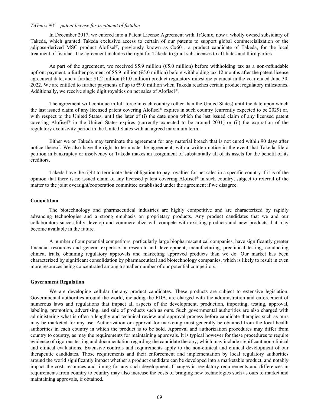 TiGenix NV – patent license for treatment of fistulae In December 2017, we entered into a Patent License Agreement with TiGenix, now a wholly owned subsidiary of Takeda, which granted Takeda exclusive access to certain of our patents to support global commercialization of the adipose-derived MSC product Alofisel®, previously known as Cx601, a product candidate of Takeda, for the local treatment of fistulae. The agreement includes the right for Takeda to grant sub-licenses to affiliates and third parties. As part of the agreement, we received $5.9 million (€5.0 million) before withholding tax as a non-refundable upfront payment, a further payment of $5.9 million (€5.0 million) before withholding tax 12 months after the patent license agreement date, and a further $1.2 million (€1.0 million) product regulatory milestone payment in the year ended June 30, 2022. We are entitled to further payments of up to €9.0 million when Takeda reaches certain product regulatory milestones. Additionally, we receive single digit royalties on net sales of Alofisel®. The agreement will continue in full force in each country (other than the United States) until the date upon which the last issued claim of any licensed patent covering Alofisel® expires in such country (currently expected to be 2029) or, with respect to the United States, until the later of (i) the date upon which the last issued claim of any licensed patent covering Alofisel® in the United States expires (currently expected to be around 2031) or (ii) the expiration of the regulatory exclusivity period in the United States with an agreed maximum term. Either we or Takeda may terminate the agreement for any material breach that is not cured within 90 days after notice thereof. We also have the right to terminate the agreement, with a written notice in the event that Takeda file a petition in bankruptcy or insolvency or Takeda makes an assignment of substantially all of its assets for the benefit of its creditors. Takeda have the right to terminate their obligation to pay royalties for net sales in a specific country if it is of the opinion that there is no issued claim of any licensed patent covering Alofisel® in such country, subject to referral of the matter to the joint oversight/cooperation committee established under the agreement if we disagree. Competition The biotechnology and pharmaceutical industries are highly competitive and are characterized by rapidly advancing technologies and a strong emphasis on proprietary products. Any product candidates that we and our collaborators successfully develop and commercialize will compete with existing products and new products that may become available in the future. A number of our potential competitors, particularly large biopharmaceutical companies, have significantly greater financial resources and general expertise in research and development, manufacturing, preclinical testing, conducting clinical trials, obtaining regulatory approvals and marketing approved products than we do. Our market has been characterized by significant consolidation by pharmaceutical and biotechnology companies, which is likely to result in even more resources being concentrated among a smaller number of our potential competitors. Government Regulation We are developing cellular therapy product candidates. These products are subject to extensive legislation. Governmental authorities around the world, including the FDA, are charged with the administration and enforcement of numerous laws and regulations that impact all aspects of the development, production, importing, testing, approval, labeling, promotion, advertising, and sale of products such as ours. Such governmental authorities are also charged with administering what is often a lengthy and technical review and approval process before candidate therapies such as ours may be marketed for any use. Authorization or approval for marketing must generally be obtained from the local health authorities in each country in which the product is to be sold. Approval and authorization procedures may differ from country to country, as may the requirements for maintaining approvals. It is typical however for these procedures to require evidence of rigorous testing and documentation regarding the candidate therapy, which may include significant non-clinical and clinical evaluations. Extensive controls and requirements apply to the non-clinical and clinical development of our therapeutic candidates. Those requirements and their enforcement and implementation by local regulatory authorities around the world significantly impact whether a product candidate can be developed into a marketable product, and notably impact the cost, resources and timing for any such development. Changes in regulatory requirements and differences in requirements from country to country may also increase the costs of bringing new technologies such as ours to market and maintaining approvals, if obtained. 69
