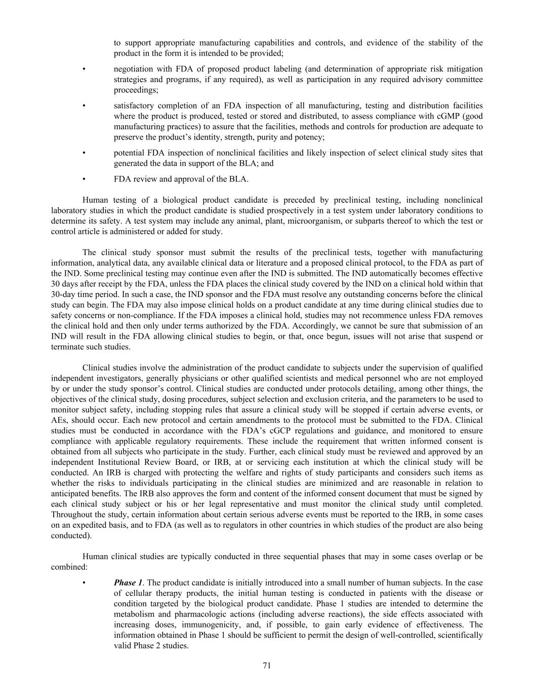 to support appropriate manufacturing capabilities and controls, and evidence of the stability of the product in the form it is intended to be provided; • negotiation with FDA of proposed product labeling (and determination of appropriate risk mitigation strategies and programs, if any required), as well as participation in any required advisory committee proceedings; • satisfactory completion of an FDA inspection of all manufacturing, testing and distribution facilities where the product is produced, tested or stored and distributed, to assess compliance with cGMP (good manufacturing practices) to assure that the facilities, methods and controls for production are adequate to preserve the product’s identity, strength, purity and potency; • potential FDA inspection of nonclinical facilities and likely inspection of select clinical study sites that generated the data in support of the BLA; and • FDA review and approval of the BLA. Human testing of a biological product candidate is preceded by preclinical testing, including nonclinical laboratory studies in which the product candidate is studied prospectively in a test system under laboratory conditions to determine its safety. A test system may include any animal, plant, microorganism, or subparts thereof to which the test or control article is administered or added for study. The clinical study sponsor must submit the results of the preclinical tests, together with manufacturing information, analytical data, any available clinical data or literature and a proposed clinical protocol, to the FDA as part of the IND. Some preclinical testing may continue even after the IND is submitted. The IND automatically becomes effective 30 days after receipt by the FDA, unless the FDA places the clinical study covered by the IND on a clinical hold within that 30-day time period. In such a case, the IND sponsor and the FDA must resolve any outstanding concerns before the clinical study can begin. The FDA may also impose clinical holds on a product candidate at any time during clinical studies due to safety concerns or non-compliance. If the FDA imposes a clinical hold, studies may not recommence unless FDA removes the clinical hold and then only under terms authorized by the FDA. Accordingly, we cannot be sure that submission of an IND will result in the FDA allowing clinical studies to begin, or that, once begun, issues will not arise that suspend or terminate such studies. Clinical studies involve the administration of the product candidate to subjects under the supervision of qualified independent investigators, generally physicians or other qualified scientists and medical personnel who are not employed by or under the study sponsor’s control. Clinical studies are conducted under protocols detailing, among other things, the objectives of the clinical study, dosing procedures, subject selection and exclusion criteria, and the parameters to be used to monitor subject safety, including stopping rules that assure a clinical study will be stopped if certain adverse events, or AEs, should occur. Each new protocol and certain amendments to the protocol must be submitted to the FDA. Clinical studies must be conducted in accordance with the FDA’s cGCP regulations and guidance, and monitored to ensure compliance with applicable regulatory requirements. These include the requirement that written informed consent is obtained from all subjects who participate in the study. Further, each clinical study must be reviewed and approved by an independent Institutional Review Board, or IRB, at or servicing each institution at which the clinical study will be conducted. An IRB is charged with protecting the welfare and rights of study participants and considers such items as whether the risks to individuals participating in the clinical studies are minimized and are reasonable in relation to anticipated benefits. The IRB also approves the form and content of the informed consent document that must be signed by each clinical study subject or his or her legal representative and must monitor the clinical study until completed. Throughout the study, certain information about certain serious adverse events must be reported to the IRB, in some cases on an expedited basis, and to FDA (as well as to regulators in other countries in which studies of the product are also being conducted). Human clinical studies are typically conducted in three sequential phases that may in some cases overlap or be combined: • Phase 1. The product candidate is initially introduced into a small number of human subjects. In the case of cellular therapy products, the initial human testing is conducted in patients with the disease or condition targeted by the biological product candidate. Phase 1 studies are intended to determine the metabolism and pharmacologic actions (including adverse reactions), the side effects associated with increasing doses, immunogenicity, and, if possible, to gain early evidence of effectiveness. The information obtained in Phase 1 should be sufficient to permit the design of well-controlled, scientifically valid Phase 2 studies. 71
