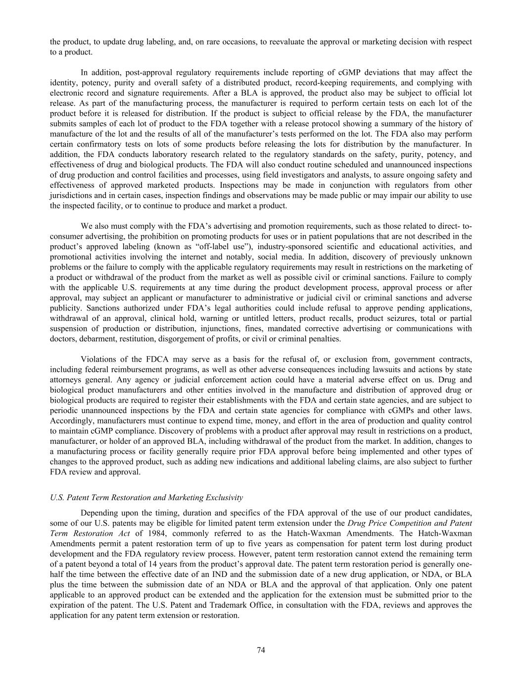 the product, to update drug labeling, and, on rare occasions, to reevaluate the approval or marketing decision with respect to a product. In addition, post-approval regulatory requirements include reporting of cGMP deviations that may affect the identity, potency, purity and overall safety of a distributed product, record-keeping requirements, and complying with electronic record and signature requirements. After a BLA is approved, the product also may be subject to official lot release. As part of the manufacturing process, the manufacturer is required to perform certain tests on each lot of the product before it is released for distribution. If the product is subject to official release by the FDA, the manufacturer submits samples of each lot of product to the FDA together with a release protocol showing a summary of the history of manufacture of the lot and the results of all of the manufacturer’s tests performed on the lot. The FDA also may perform certain confirmatory tests on lots of some products before releasing the lots for distribution by the manufacturer. In addition, the FDA conducts laboratory research related to the regulatory standards on the safety, purity, potency, and effectiveness of drug and biological products. The FDA will also conduct routine scheduled and unannounced inspections of drug production and control facilities and processes, using field investigators and analysts, to assure ongoing safety and effectiveness of approved marketed products. Inspections may be made in conjunction with regulators from other jurisdictions and in certain cases, inspection findings and observations may be made public or may impair our ability to use the inspected facility, or to continue to produce and market a product. We also must comply with the FDA’s advertising and promotion requirements, such as those related to direct- to- consumer advertising, the prohibition on promoting products for uses or in patient populations that are not described in the product’s approved labeling (known as “off-label use”), industry-sponsored scientific and educational activities, and promotional activities involving the internet and notably, social media. In addition, discovery of previously unknown problems or the failure to comply with the applicable regulatory requirements may result in restrictions on the marketing of a product or withdrawal of the product from the market as well as possible civil or criminal sanctions. Failure to comply with the applicable U.S. requirements at any time during the product development process, approval process or after approval, may subject an applicant or manufacturer to administrative or judicial civil or criminal sanctions and adverse publicity. Sanctions authorized under FDA’s legal authorities could include refusal to approve pending applications, withdrawal of an approval, clinical hold, warning or untitled letters, product recalls, product seizures, total or partial suspension of production or distribution, injunctions, fines, mandated corrective advertising or communications with doctors, debarment, restitution, disgorgement of profits, or civil or criminal penalties. Violations of the FDCA may serve as a basis for the refusal of, or exclusion from, government contracts, including federal reimbursement programs, as well as other adverse consequences including lawsuits and actions by state attorneys general. Any agency or judicial enforcement action could have a material adverse effect on us. Drug and biological product manufacturers and other entities involved in the manufacture and distribution of approved drug or biological products are required to register their establishments with the FDA and certain state agencies, and are subject to periodic unannounced inspections by the FDA and certain state agencies for compliance with cGMPs and other laws. Accordingly, manufacturers must continue to expend time, money, and effort in the area of production and quality control to maintain cGMP compliance. Discovery of problems with a product after approval may result in restrictions on a product, manufacturer, or holder of an approved BLA, including withdrawal of the product from the market. In addition, changes to a manufacturing process or facility generally require prior FDA approval before being implemented and other types of changes to the approved product, such as adding new indications and additional labeling claims, are also subject to further FDA review and approval. U.S. Patent Term Restoration and Marketing Exclusivity Depending upon the timing, duration and specifics of the FDA approval of the use of our product candidates, some of our U.S. patents may be eligible for limited patent term extension under the Drug Price Competition and Patent Term Restoration Act of 1984, commonly referred to as the Hatch-Waxman Amendments. The Hatch-Waxman Amendments permit a patent restoration term of up to five years as compensation for patent term lost during product development and the FDA regulatory review process. However, patent term restoration cannot extend the remaining term of a patent beyond a total of 14 years from the product’s approval date. The patent term restoration period is generally one- half the time between the effective date of an IND and the submission date of a new drug application, or NDA, or BLA plus the time between the submission date of an NDA or BLA and the approval of that application. Only one patent applicable to an approved product can be extended and the application for the extension must be submitted prior to the expiration of the patent. The U.S. Patent and Trademark Office, in consultation with the FDA, reviews and approves the application for any patent term extension or restoration. 74