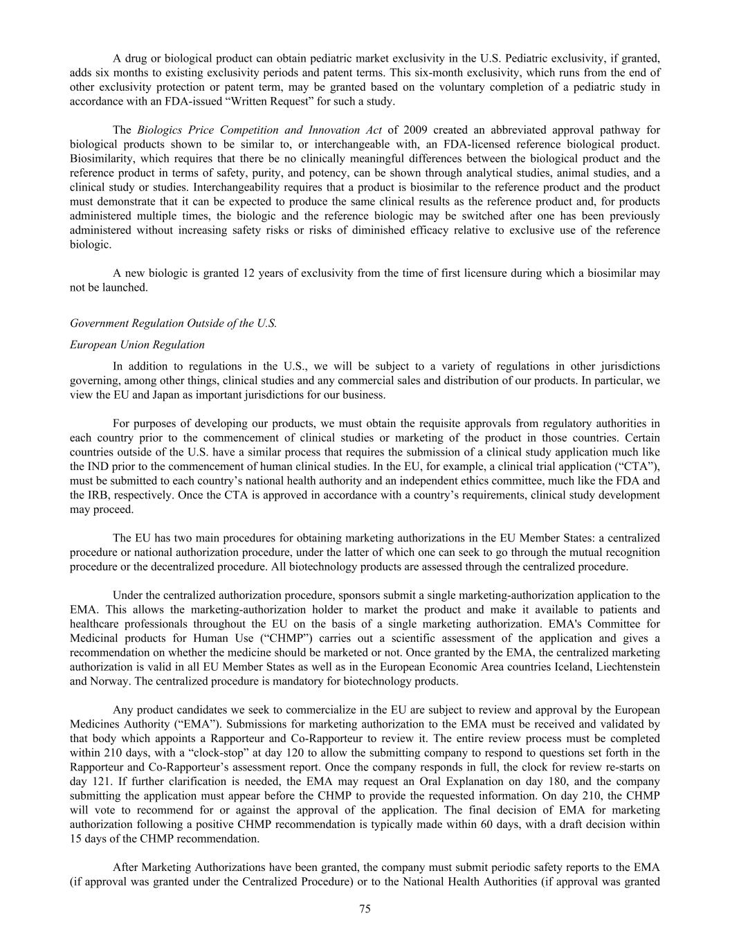 A drug or biological product can obtain pediatric market exclusivity in the U.S. Pediatric exclusivity, if granted, adds six months to existing exclusivity periods and patent terms. This six-month exclusivity, which runs from the end of other exclusivity protection or patent term, may be granted based on the voluntary completion of a pediatric study in accordance with an FDA-issued “Written Request” for such a study. The Biologics Price Competition and Innovation Act of 2009 created an abbreviated approval pathway for biological products shown to be similar to, or interchangeable with, an FDA-licensed reference biological product. Biosimilarity, which requires that there be no clinically meaningful differences between the biological product and the reference product in terms of safety, purity, and potency, can be shown through analytical studies, animal studies, and a clinical study or studies. Interchangeability requires that a product is biosimilar to the reference product and the product must demonstrate that it can be expected to produce the same clinical results as the reference product and, for products administered multiple times, the biologic and the reference biologic may be switched after one has been previously administered without increasing safety risks or risks of diminished efficacy relative to exclusive use of the reference biologic. A new biologic is granted 12 years of exclusivity from the time of first licensure during which a biosimilar may not be launched. Government Regulation Outside of the U.S. European Union Regulation In addition to regulations in the U.S., we will be subject to a variety of regulations in other jurisdictions governing, among other things, clinical studies and any commercial sales and distribution of our products. In particular, we view the EU and Japan as important jurisdictions for our business. For purposes of developing our products, we must obtain the requisite approvals from regulatory authorities in each country prior to the commencement of clinical studies or marketing of the product in those countries. Certain countries outside of the U.S. have a similar process that requires the submission of a clinical study application much like the IND prior to the commencement of human clinical studies. In the EU, for example, a clinical trial application (“CTA”), must be submitted to each country’s national health authority and an independent ethics committee, much like the FDA and the IRB, respectively. Once the CTA is approved in accordance with a country’s requirements, clinical study development may proceed. The EU has two main procedures for obtaining marketing authorizations in the EU Member States: a centralized procedure or national authorization procedure, under the latter of which one can seek to go through the mutual recognition procedure or the decentralized procedure. All biotechnology products are assessed through the centralized procedure. Under the centralized authorization procedure, sponsors submit a single marketing-authorization application to the EMA. This allows the marketing-authorization holder to market the product and make it available to patients and healthcare professionals throughout the EU on the basis of a single marketing authorization. EMA's Committee for Medicinal products for Human Use (“CHMP”) carries out a scientific assessment of the application and gives a recommendation on whether the medicine should be marketed or not. Once granted by the EMA, the centralized marketing authorization is valid in all EU Member States as well as in the European Economic Area countries Iceland, Liechtenstein and Norway. The centralized procedure is mandatory for biotechnology products. Any product candidates we seek to commercialize in the EU are subject to review and approval by the European Medicines Authority (“EMA”). Submissions for marketing authorization to the EMA must be received and validated by that body which appoints a Rapporteur and Co-Rapporteur to review it. The entire review process must be completed within 210 days, with a “clock-stop” at day 120 to allow the submitting company to respond to questions set forth in the Rapporteur and Co-Rapporteur’s assessment report. Once the company responds in full, the clock for review re-starts on day 121. If further clarification is needed, the EMA may request an Oral Explanation on day 180, and the company submitting the application must appear before the CHMP to provide the requested information. On day 210, the CHMP will vote to recommend for or against the approval of the application. The final decision of EMA for marketing authorization following a positive CHMP recommendation is typically made within 60 days, with a draft decision within 15 days of the CHMP recommendation. After Marketing Authorizations have been granted, the company must submit periodic safety reports to the EMA (if approval was granted under the Centralized Procedure) or to the National Health Authorities (if approval was granted 75