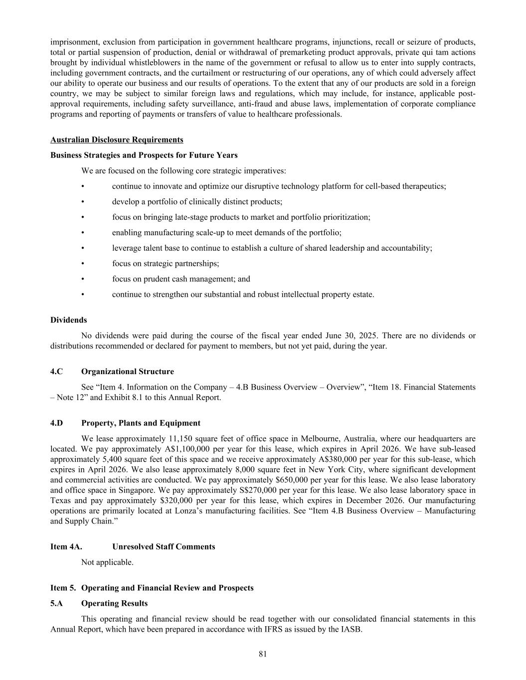 imprisonment, exclusion from participation in government healthcare programs, injunctions, recall or seizure of products, total or partial suspension of production, denial or withdrawal of premarketing product approvals, private qui tam actions brought by individual whistleblowers in the name of the government or refusal to allow us to enter into supply contracts, including government contracts, and the curtailment or restructuring of our operations, any of which could adversely affect our ability to operate our business and our results of operations. To the extent that any of our products are sold in a foreign country, we may be subject to similar foreign laws and regulations, which may include, for instance, applicable post- approval requirements, including safety surveillance, anti-fraud and abuse laws, implementation of corporate compliance programs and reporting of payments or transfers of value to healthcare professionals. Australian Disclosure Requirements Business Strategies and Prospects for Future Years We are focused on the following core strategic imperatives: • continue to innovate and optimize our disruptive technology platform for cell-based therapeutics; • develop a portfolio of clinically distinct products; • focus on bringing late-stage products to market and portfolio prioritization; • enabling manufacturing scale-up to meet demands of the portfolio; • leverage talent base to continue to establish a culture of shared leadership and accountability; • focus on strategic partnerships; • focus on prudent cash management; and • continue to strengthen our substantial and robust intellectual property estate. Dividends No dividends were paid during the course of the fiscal year ended June 30, 2025. There are no dividends or distributions recommended or declared for payment to members, but not yet paid, during the year. 4.C Organizational Structure See “Item 4. Information on the Company – 4.B Business Overview – Overview”, “Item 18. Financial Statements – Note 12” and Exhibit 8.1 to this Annual Report. 4.D Property, Plants and Equipment We lease approximately 11,150 square feet of office space in Melbourne, Australia, where our headquarters are located. We pay approximately A$1,100,000 per year for this lease, which expires in April 2026. We have sub-leased approximately 5,400 square feet of this space and we receive approximately A$380,000 per year for this sub-lease, which expires in April 2026. We also lease approximately 8,000 square feet in New York City, where significant development and commercial activities are conducted. We pay approximately $650,000 per year for this lease. We also lease laboratory and office space in Singapore. We pay approximately S$270,000 per year for this lease. We also lease laboratory space in Texas and pay approximately $320,000 per year for this lease, which expires in December 2026. Our manufacturing operations are primarily located at Lonza’s manufacturing facilities. See “Item 4.B Business Overview – Manufacturing and Supply Chain.” Item 4A. Unresolved Staff Comments Not applicable. Item 5. Operating and Financial Review and Prospects 5.A Operating Results This operating and financial review should be read together with our consolidated financial statements in this Annual Report, which have been prepared in accordance with IFRS as issued by the IASB. 81